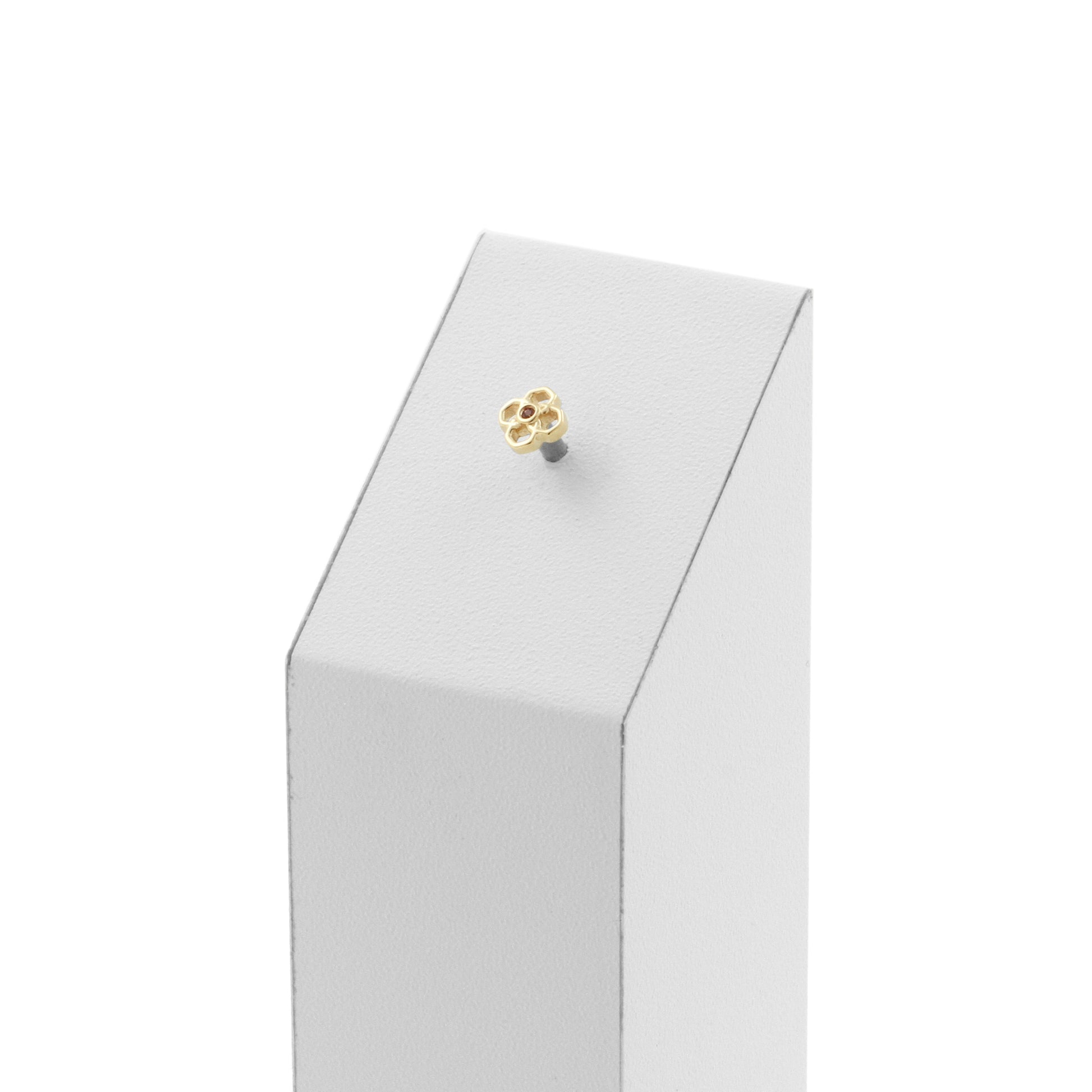 14 Karat Gold Clover With Ruby instantly adds a stylish touch to your piercing. This Threadless Top is made of 14 Karat Gold. The threadless system allows you to easily combine this top with all our bars, which we call Threadless Base, for a perfect fit and ultimate comfort.