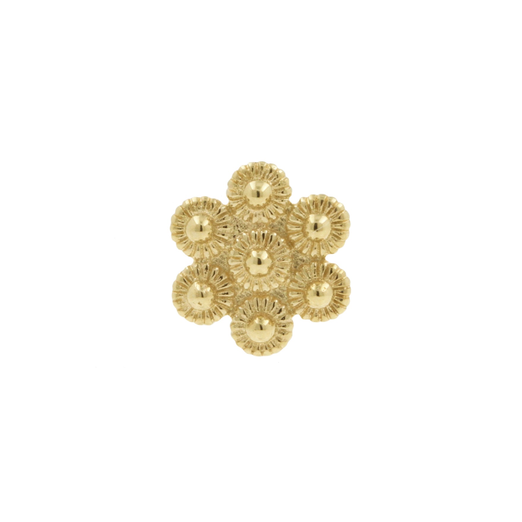 14 Karat Gold Dotted Flower instantly adds a stylish touch to your piercing. This Threadless Top is made of 14 Karat Gold. The threadless system allows you to easily combine this top with all our bars, which we call Threadless Base, for a perfect fit and ultimate comfort.