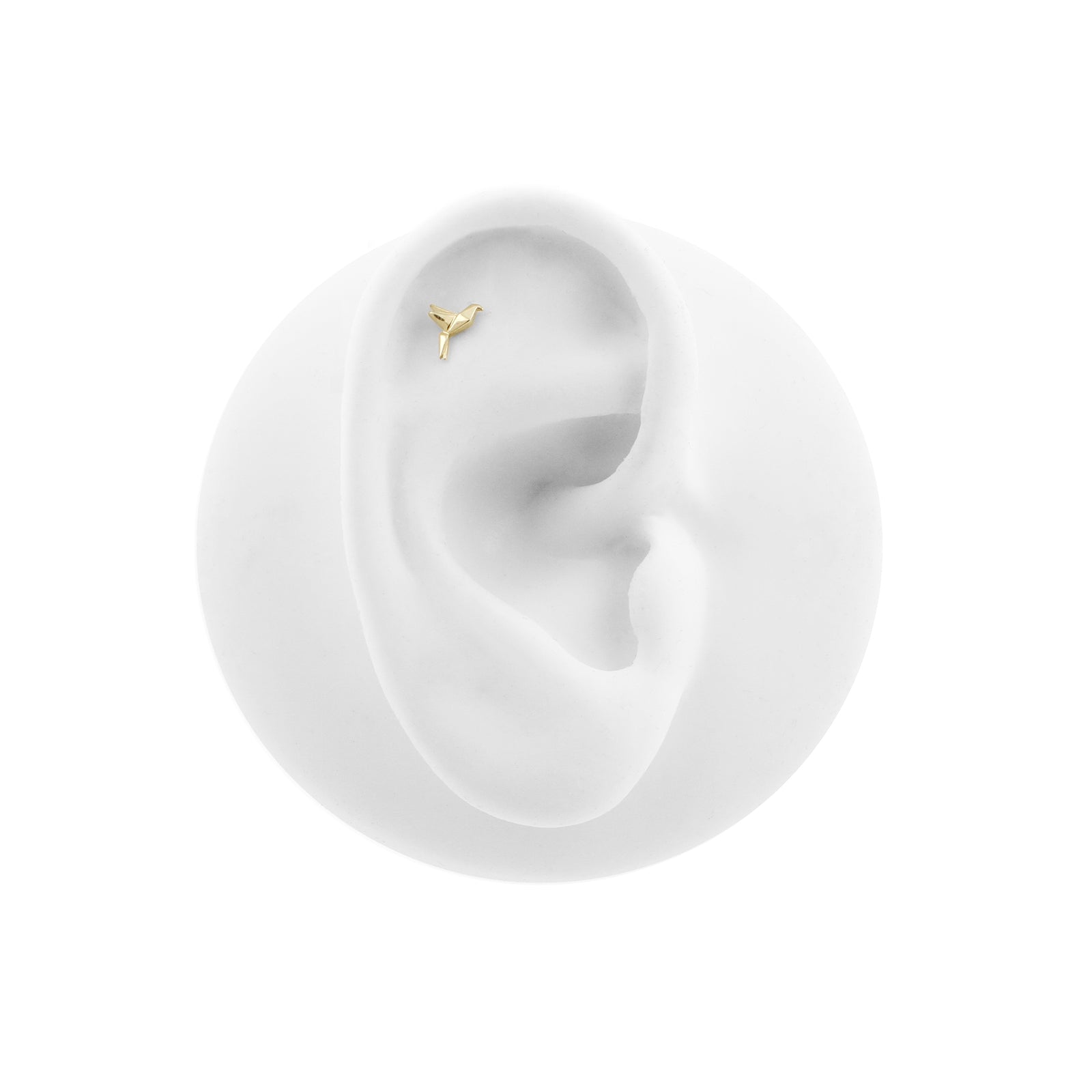 14 Karat Gold Origami Bird instantly adds a stylish touch to your piercing. This Threadless Top is made of 14 Karat Gold. The threadless system allows you to easily combine this top with all our bars, which we call Threadless Base, for a perfect fit and ultimate comfort.