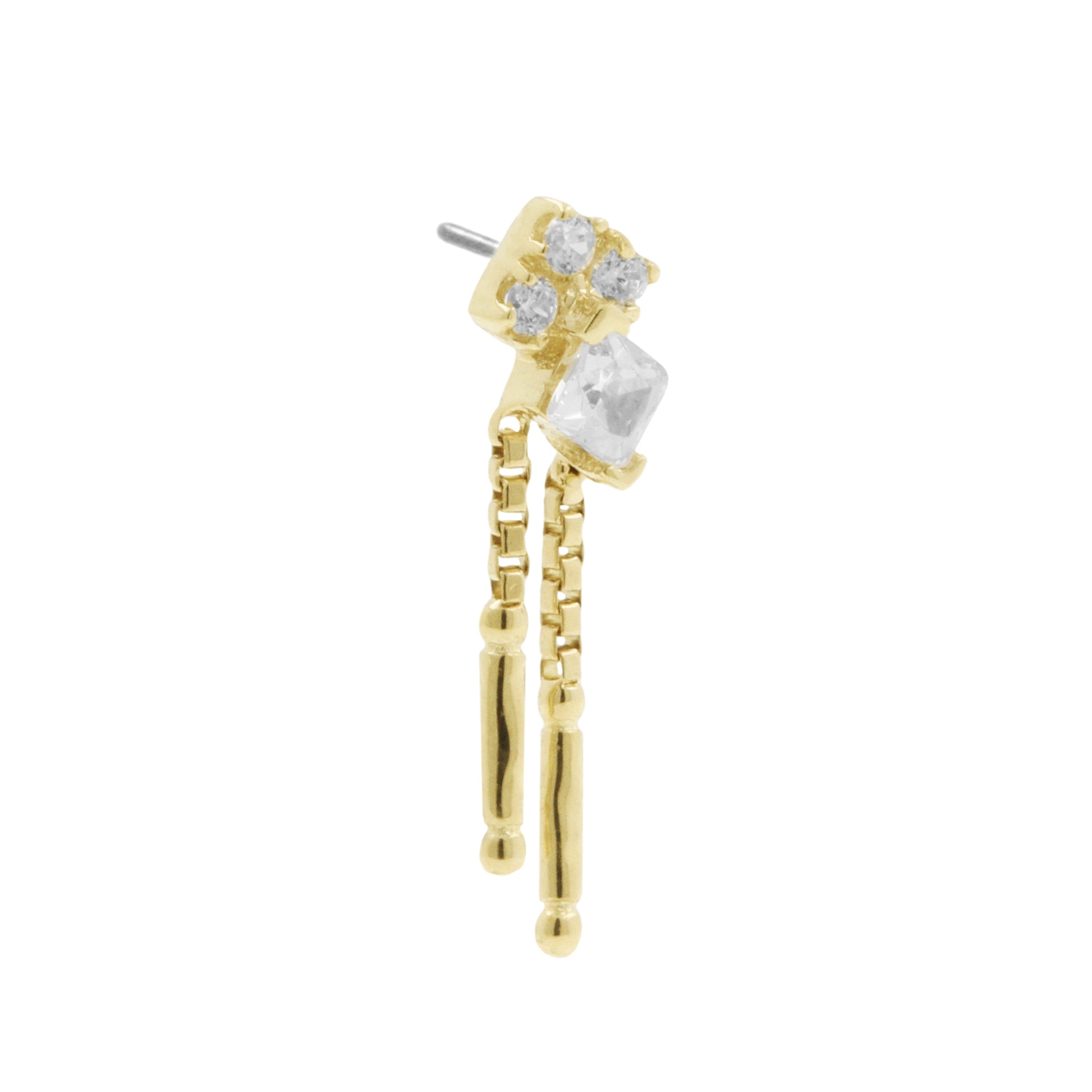 14 Karat Gold Square Zirconia Dangle instantly adds a stylish touch to your piercing. This Threadless Top is made of 14 Karat Gold with a cubic zirconia in Clear. The threadless system allows you to easily combine this top with all our bars, which we call Threadless Base, for a perfect fit and ultimate comfort.