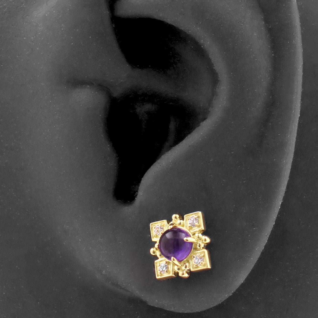 Are you going for subtle chique or a statement look? Whatever you're looking for, create your perfect look with ou 18 Karat gold jewelry! Our jewelry accessories instantly add a classy touch to every fashion outfit, and are perfect for creating the most exquisite curated ears. Our 18 karat gold jewelry is comfortable, trendy and made of the highest quality, genuine gold. Each threaded accessory features a beautiful design with high quality finish, set with genuine amethyst. Suitable for 1,2 mm internally threaded piercing jewelry (extra info: the thread of the accessory itself measures 0,8 mm in thickness and is suitable for 1,2 mm All Over Piercings internally threaded piercing jewelry). You will receive the threaded accessory only upon ordering, without stud or post. Please note that due to the unique shape of the attachment, changing jewelry might be a bit more challenging. But practice makes perfect and it will all be more than worth it in the end, our gold piercing accessories will turn your piercings into real eyecatchers!
