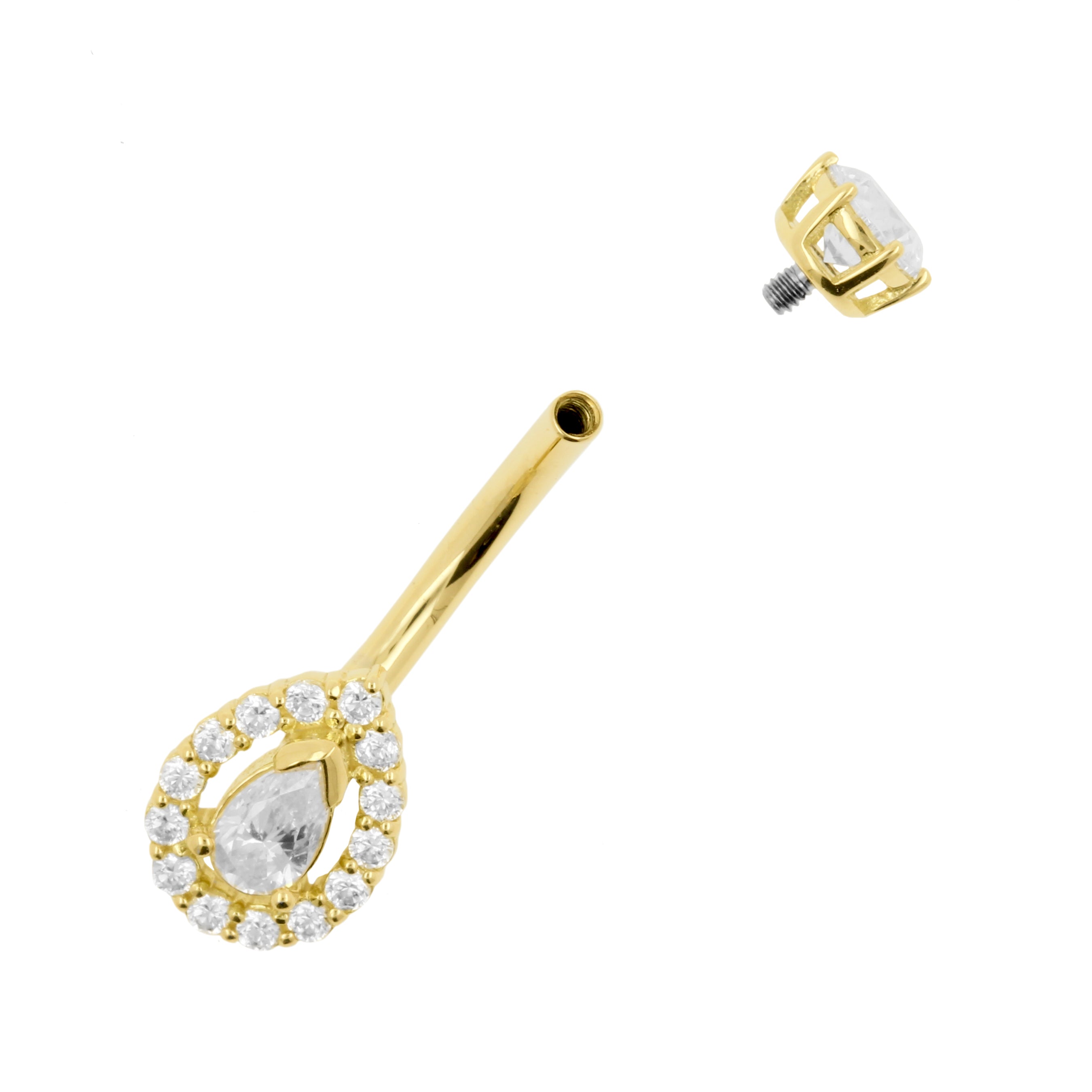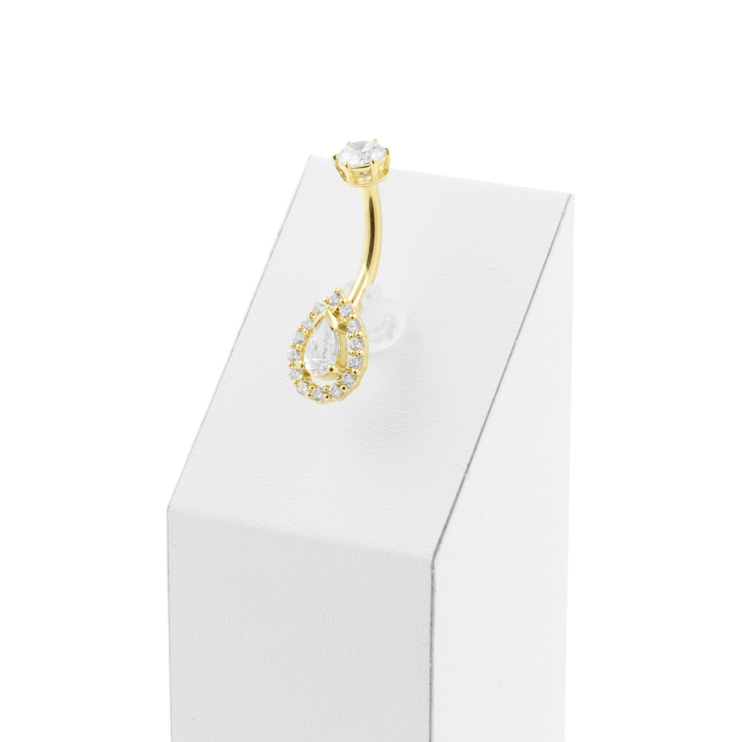18 Karat Gold Belly Bar with Pear Shaped Premium Zirconia