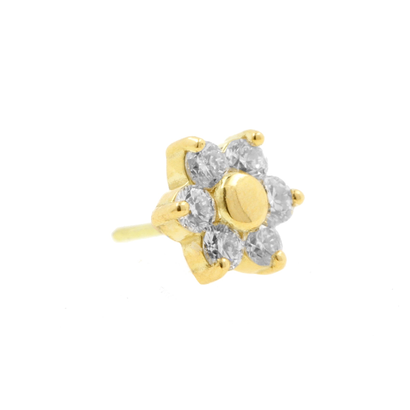 18 Karat Gold Diamond Flower instantly adds a stylish touch to your piercing. This Threadless Top is made of 18 Karat Gold with a lab created diamond in Clear. The threadless system allows you to easily combine this top with all our bars, which we call Threadless Base, for a perfect fit and ultimate comfort.