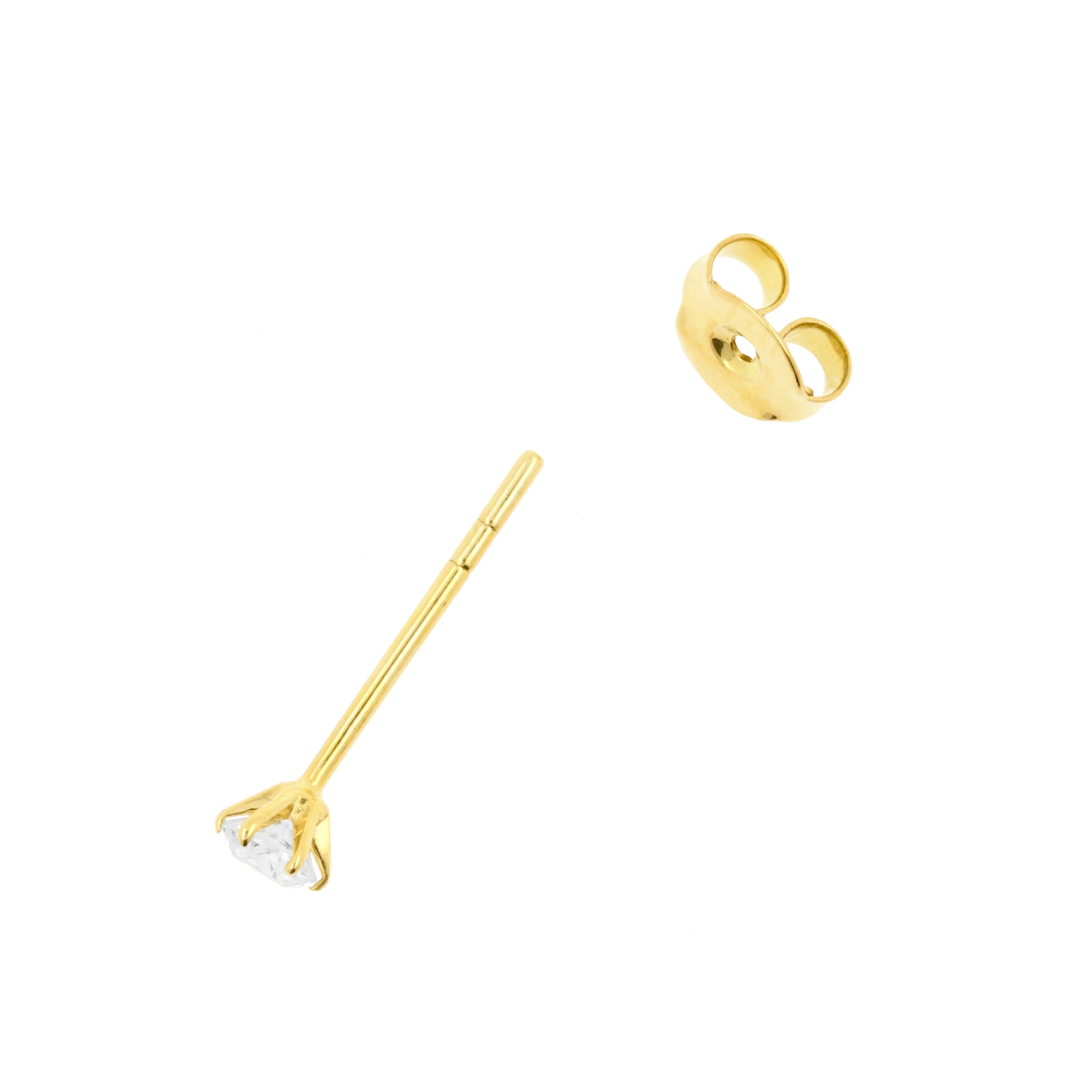 Refined 18 karat gold ear studs featuring a 3 mm premium zirconia. Timeless luxury for everyday wear. Designed to shine subtly. The 3 mm gemstone is carefully placed in a round setting, and the entire piece is crafted from solid 18 karat gold. Finished with a classic butterfly backing for secure, comfortable wear.