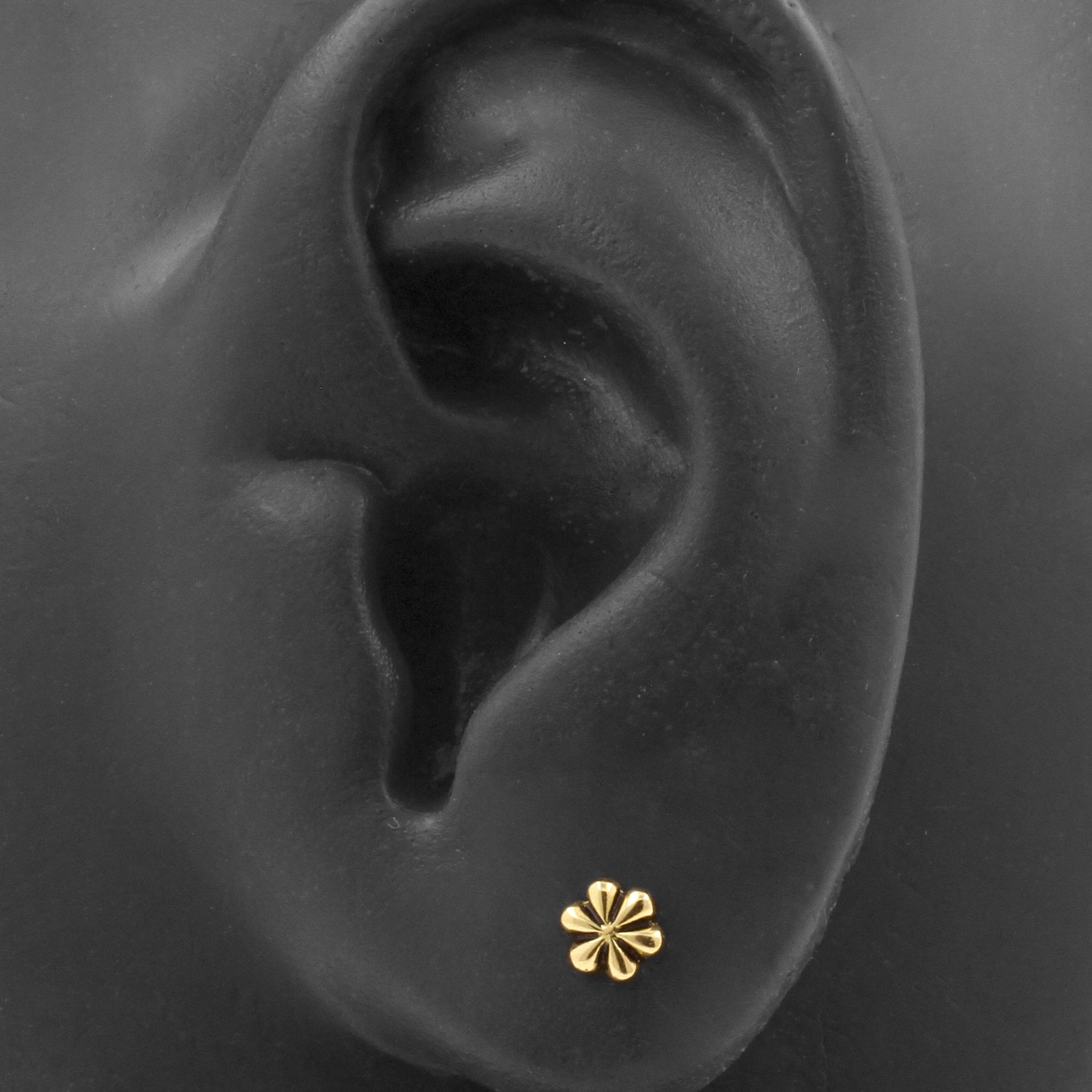18 Karat Gold Flower instantly adds a stylish touch to your piercing. This Threadless Top is made of 18 Karat Gold. The threadless system allows you to easily combine this top with all our bars, which we call Threadless Base, for a perfect fit and ultimate comfort.