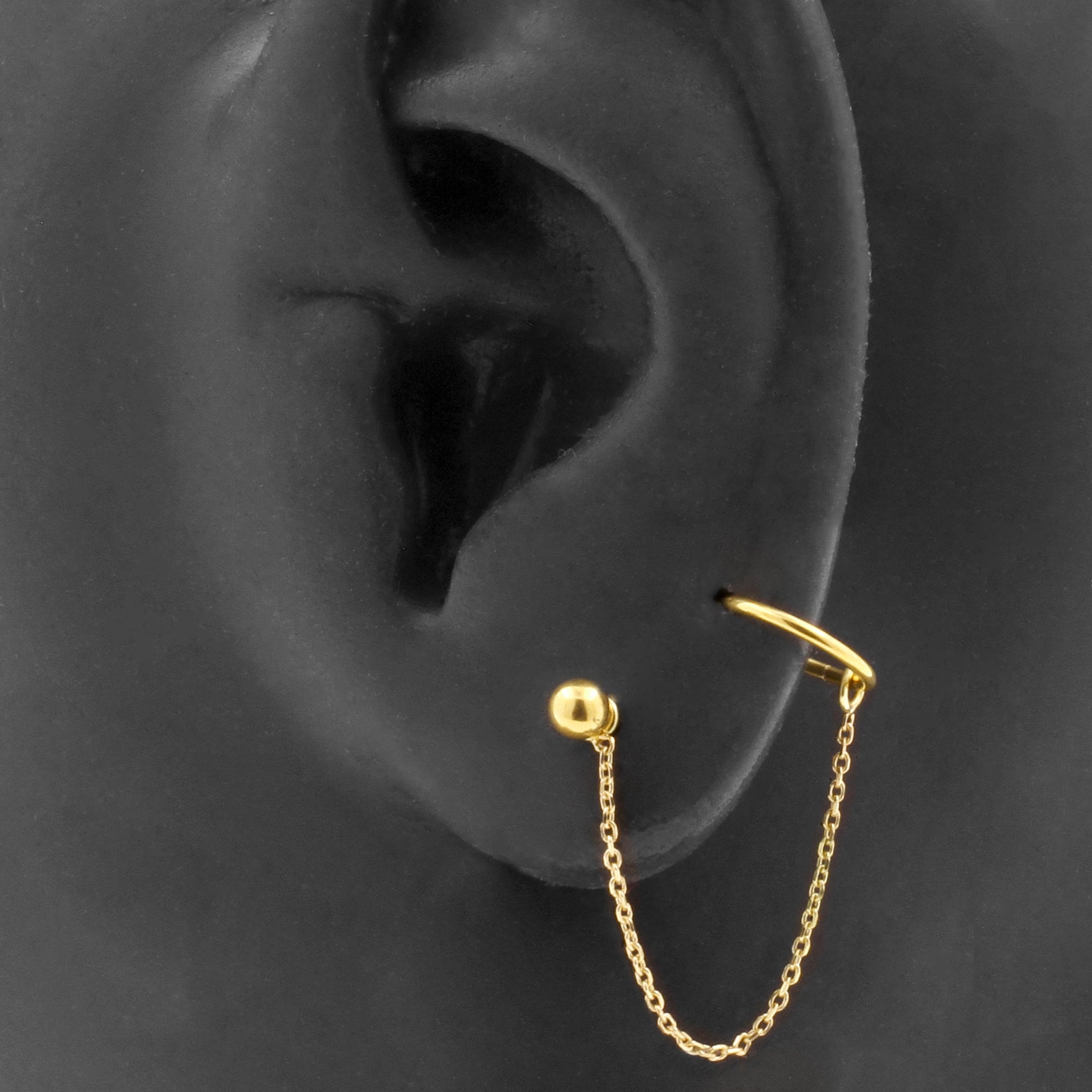 Upgrade your piercings or make your ear party look extra special: our real gold Piercing Chain will do the job perfectly! This lovely piercing chain is made of 18 karat gold and suitable for click rings, earring, piercing studs and other piercing rings with a thickness up to 1,2 mm. Our Piercing Chain is simple to use: open your click ring, attach the chain to your jewelry and close your click ring, earring or stud again. Done! Our Piercing Chains are available in different lengths to create endless jewelry combinations for lots of different piercings. Perfect for ear piercings, nipple piercings and cartilage piercings.