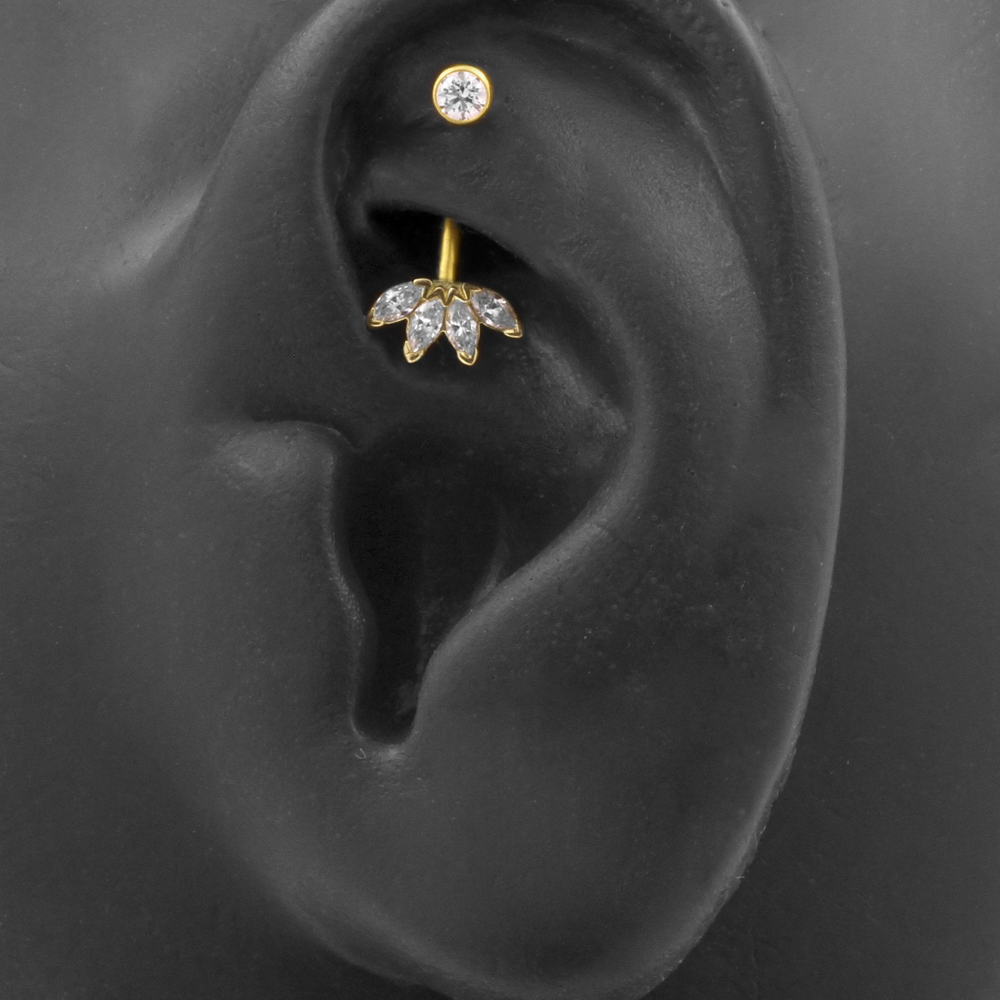 Easy to use and supercomfortable piercingjewelry, completely threadless! This threadless rook piercing is made of titanium, measures 1,2 mm in thickness and is available in different designs. The rook piercing is fitted with beautiful, 18 karat gold accessories set with premium zirconia. The top ball is fixed to the post and measures 3 mm in diameter. Perfect for rook piercings, or pierced earlobes. Threadless piercing jewelry is very comfortable and uses an easy push/pull system that makes changing your jewelry a breeze. Our threadless piercings are comfy, stylish and the perfect addition to your piering collection.