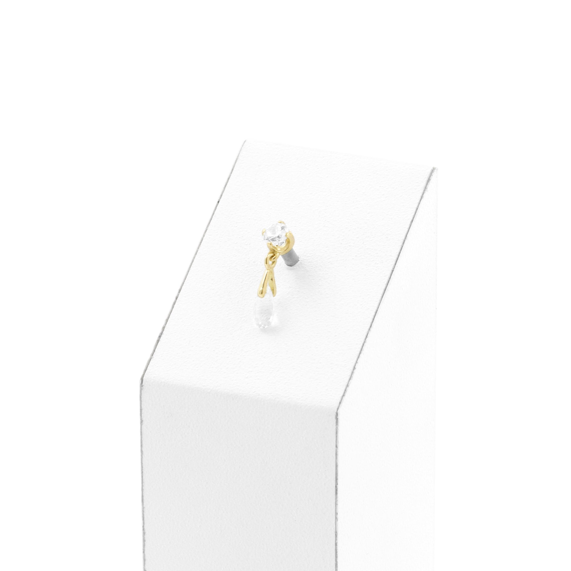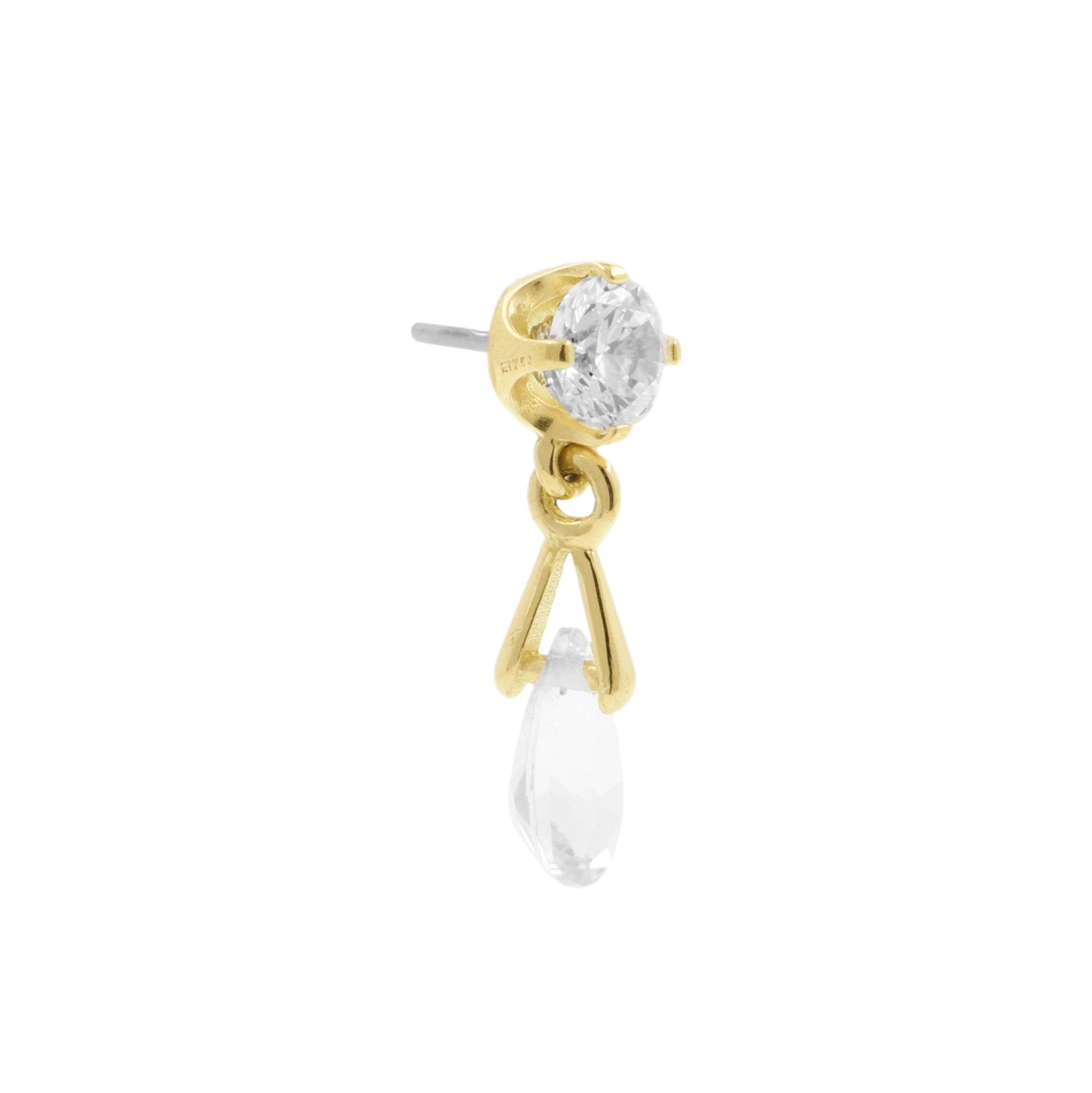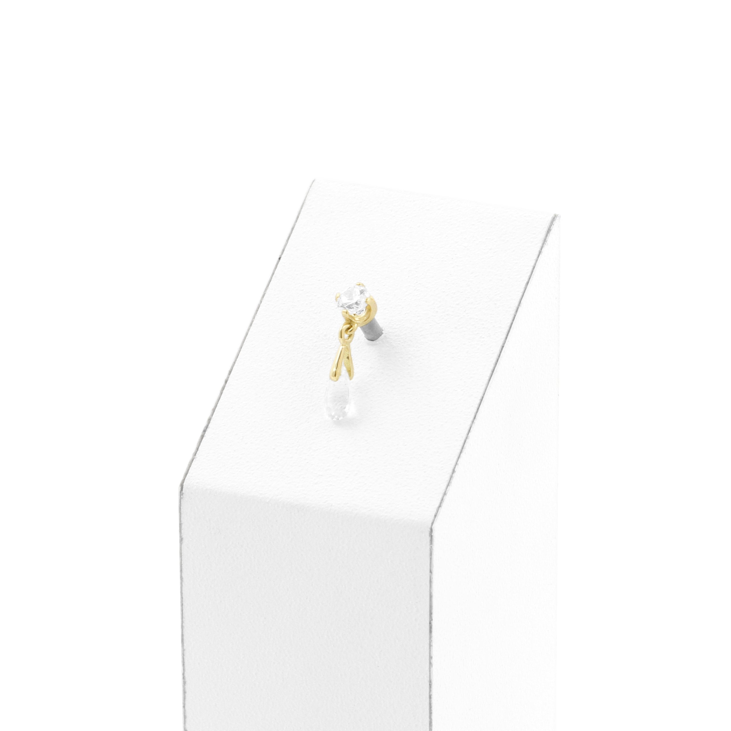 A timeless golden shine with refined sparkle: this round threadless top is set with clear cubic zirconia stones that gently catch the light against its 18 karat gold. A transparent white topaz teardrop adds graceful movement and a soft, elegant glow.