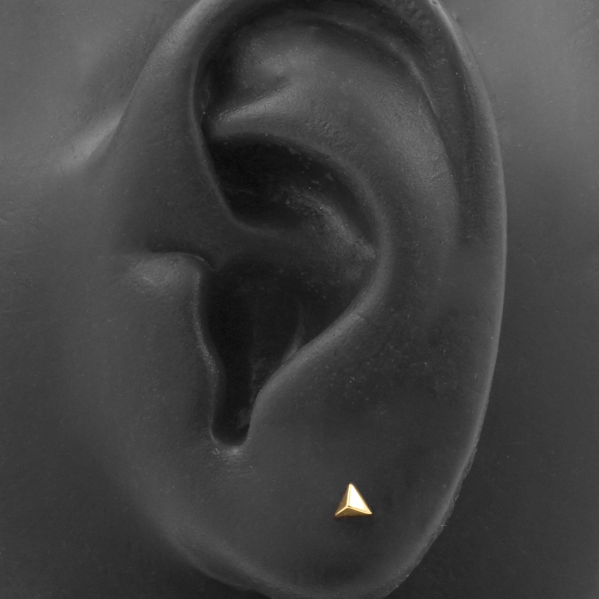 18 Karat Gold Stud Triangle instantly adds a stylish touch to your piercing. This Threadless Top is made of 18 Karat Gold. The threadless system allows you to easily combine this top with all our bars, which we call Threadless Base, for a perfect fit and ultimate comfort.