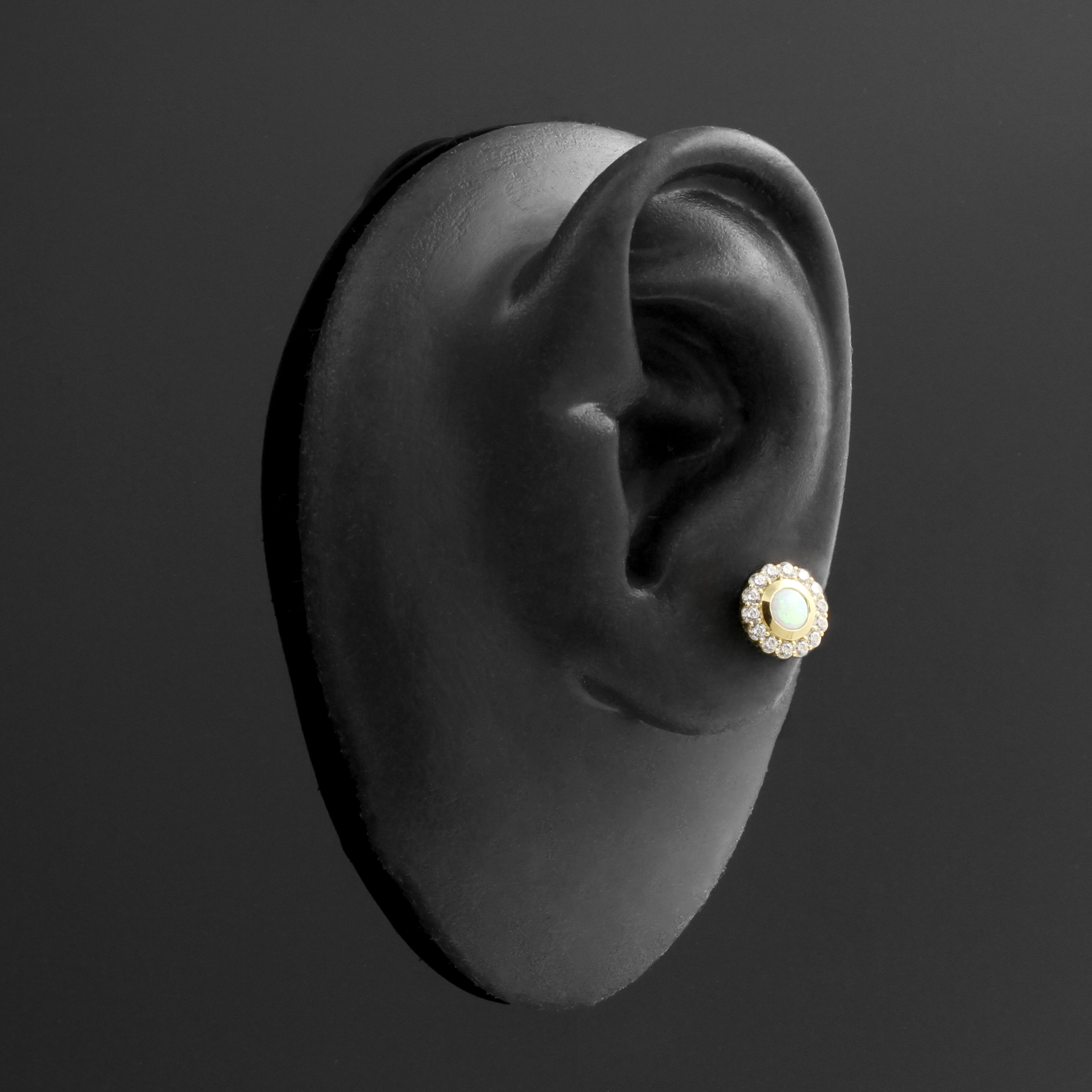 Are you going for subtle chique or a statement look? Whatever you're looking for, create your perfect look with ou 18 Karat gold jewelry! Our jewelry accessories instantly add a classy touch to every fashion outfit, and are perfect for creating the most exquisite curated ears. Our 18 karat gold jewelry is comfortable, trendy and made of the highest quality, genuine gold. Each threaded accessory features a beautiful design with high quality finish, set with synthetic opal and premium zirconia. Suitable for 1,2 mm internally threaded piercing jewelry (extra info: the thread of the accessory itself measures 0,8 mm in thickness and is suitable for 1,2 mm All Over Piercings internally threaded piercing jewelry). You will receive the threaded accessory only upon ordering, without stud or post. Please note that due to the unique shape of the attachment, changing jewelry might be a bit more challenging. But practice makes perfect and it will all be more than worth it in the end, our gold piercing accessories will turn your piercings into real eyecatchers!