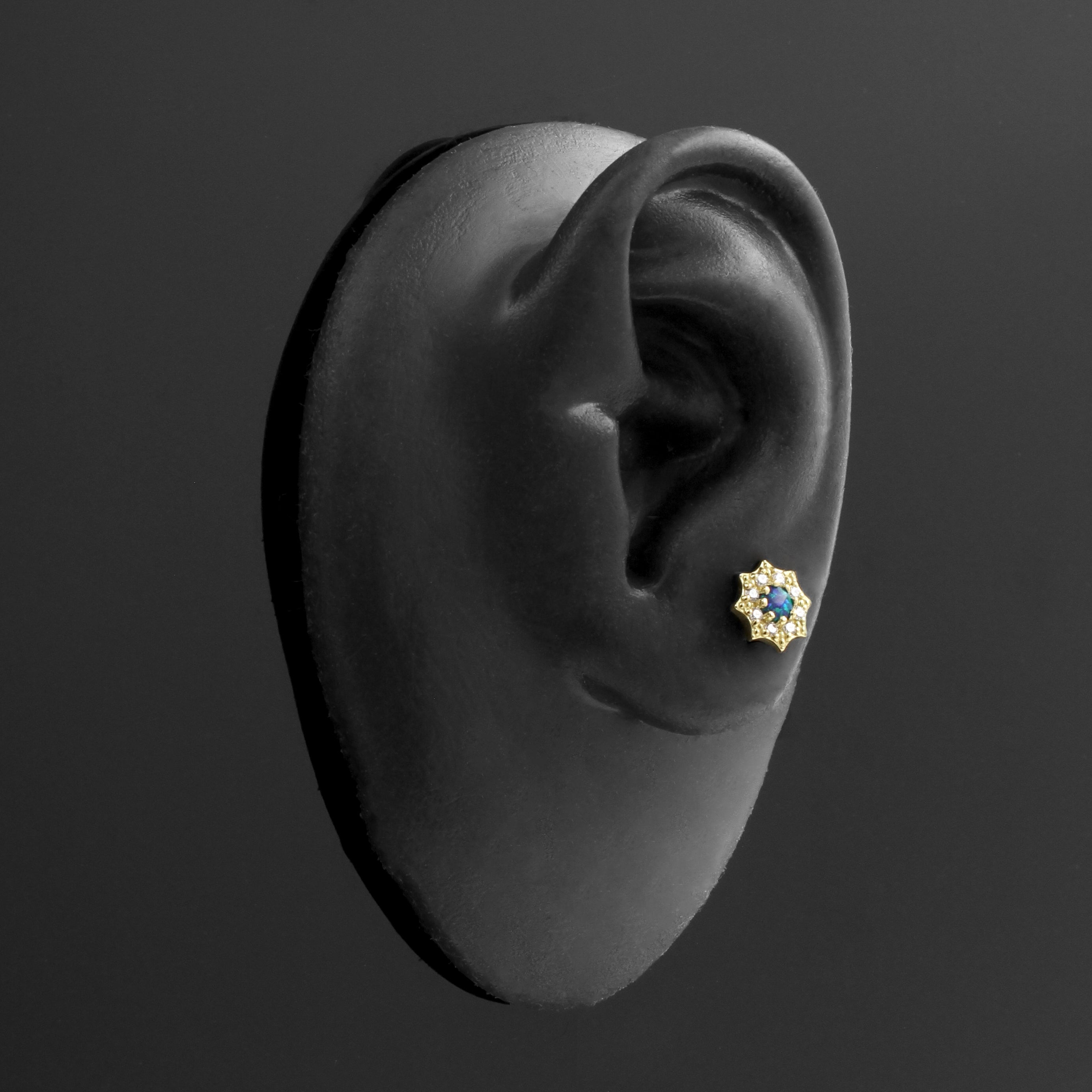 Are you going for subtle chique or a statement look? Whatever you're looking for, create your perfect look with ou 18 Karat gold jewelry! Our jewelry accessories instantly add a classy touch to every fashion outfit, and are perfect for creating the most exquisite curated ears. Our 18 karat gold jewelry is comfortable, trendy and made of the highest quality, genuine gold. Each threaded accessory features a beautiful design with high quality finish, set with synthetic opal and premium zirconia. Suitable for 1,2 mm internally threaded piercing jewelry (extra info: the thread of the accessory itself measures 0,8 mm in thickness and is suitable for 1,2 mm All Over Piercings internally threaded piercing jewelry). You will receive the threaded accessory only upon ordering, without stud or post. Please note that due to the unique shape of the attachment, changing jewelry might be a bit more challenging. But practice makes perfect and it will all be more than worth it in the end, our gold piercing accessories will turn your piercings into real eyecatchers!