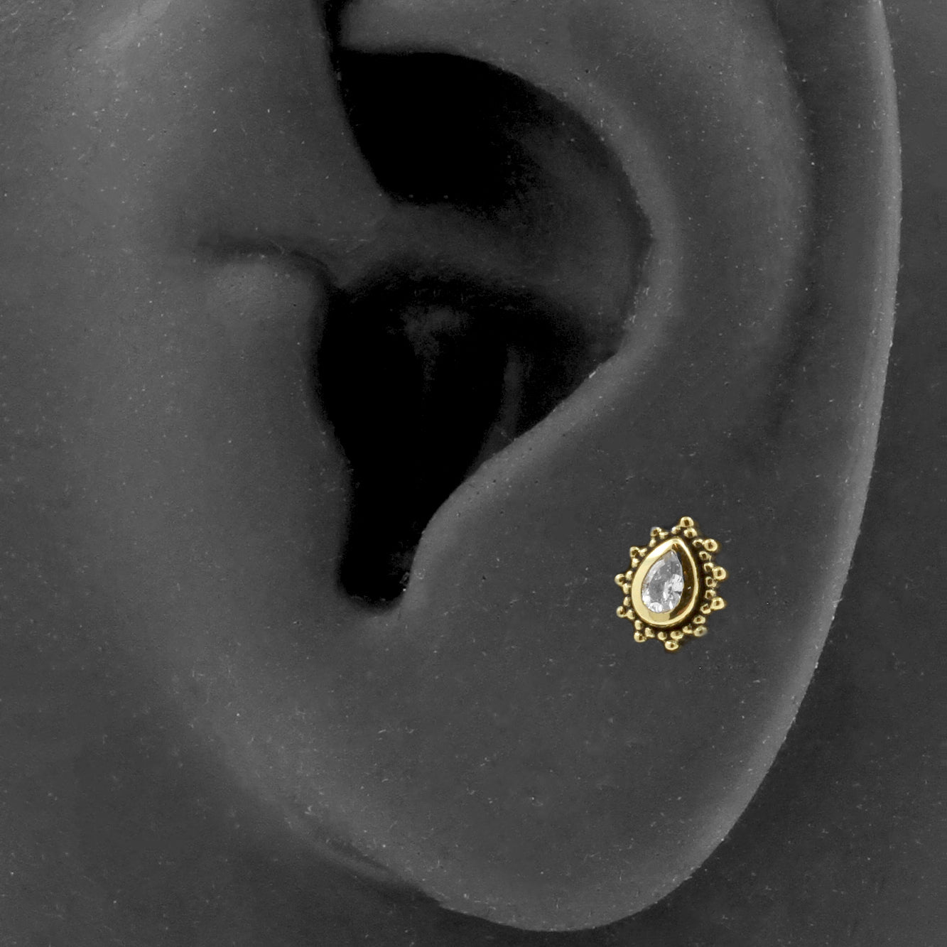 Are you going for subtle chique or a statement look? Whatever you're looking for, create your perfect look with ou 18 Karat gold jewelry! Our jewelry accessories instantly add a classy touch to every fashion outfit, and are perfect for creating the most exquisite curated ears. Our 18 karat gold jewelry is comfortable, trendy and made of the highest quality, genuine gold. Each threaded accessory features a beautiful design with high quality finish, set with zirconia. Suitable for 1,2 mm internally threaded piercing jewelry (extra info: the thread of the accessory itself measures 0,8 mm in thickness and is suitable for 1,2 mm All Over Piercings internally threaded piercing jewelry). You will receive the threaded accessory only upon ordering, without stud or post. Please note that due to the unique shape of the attachment, changing jewelry might be a bit more challenging. But practice makes perfect and it will all be more than worth it in the end, our gold piercing accessories will turn your piercings into real eyecatchers!