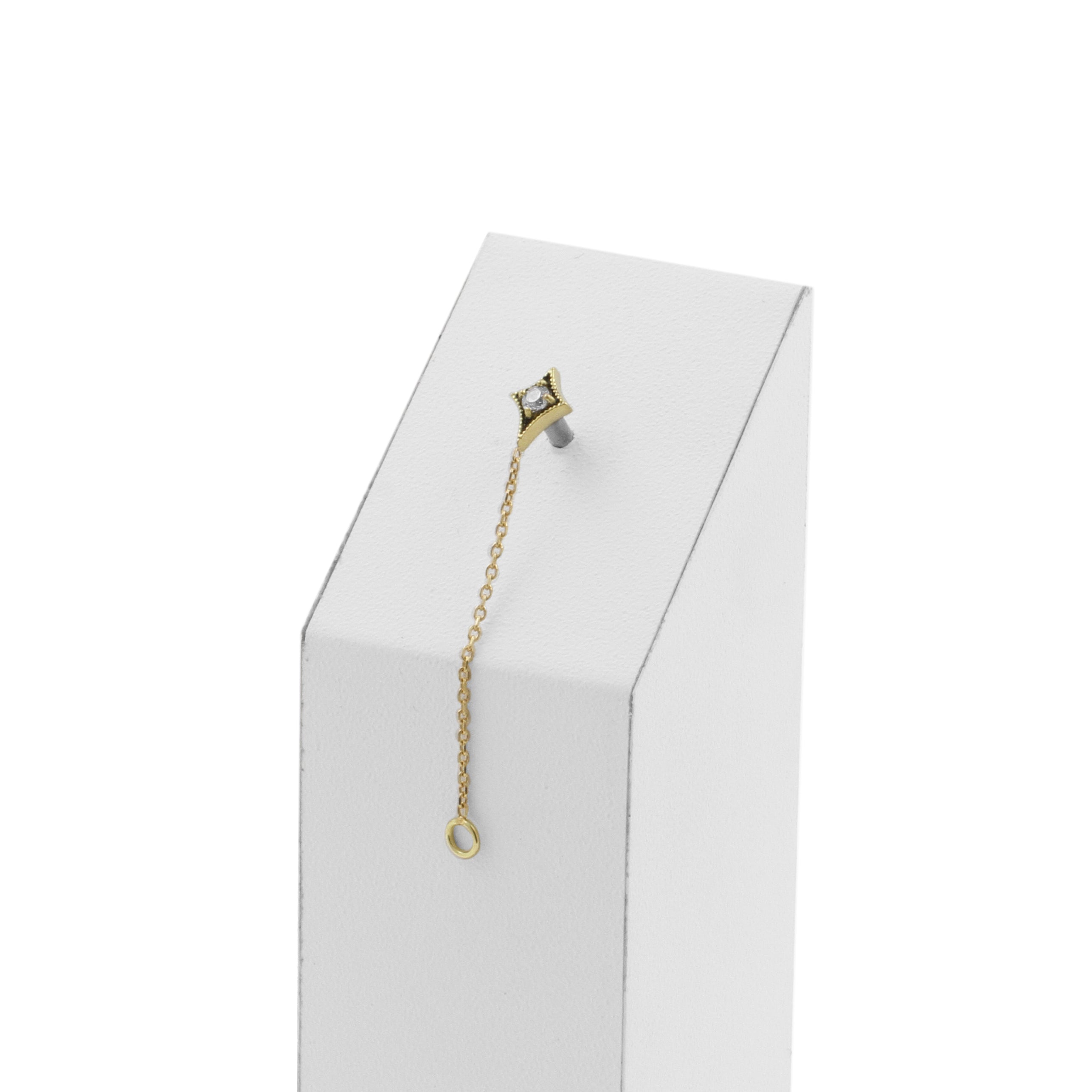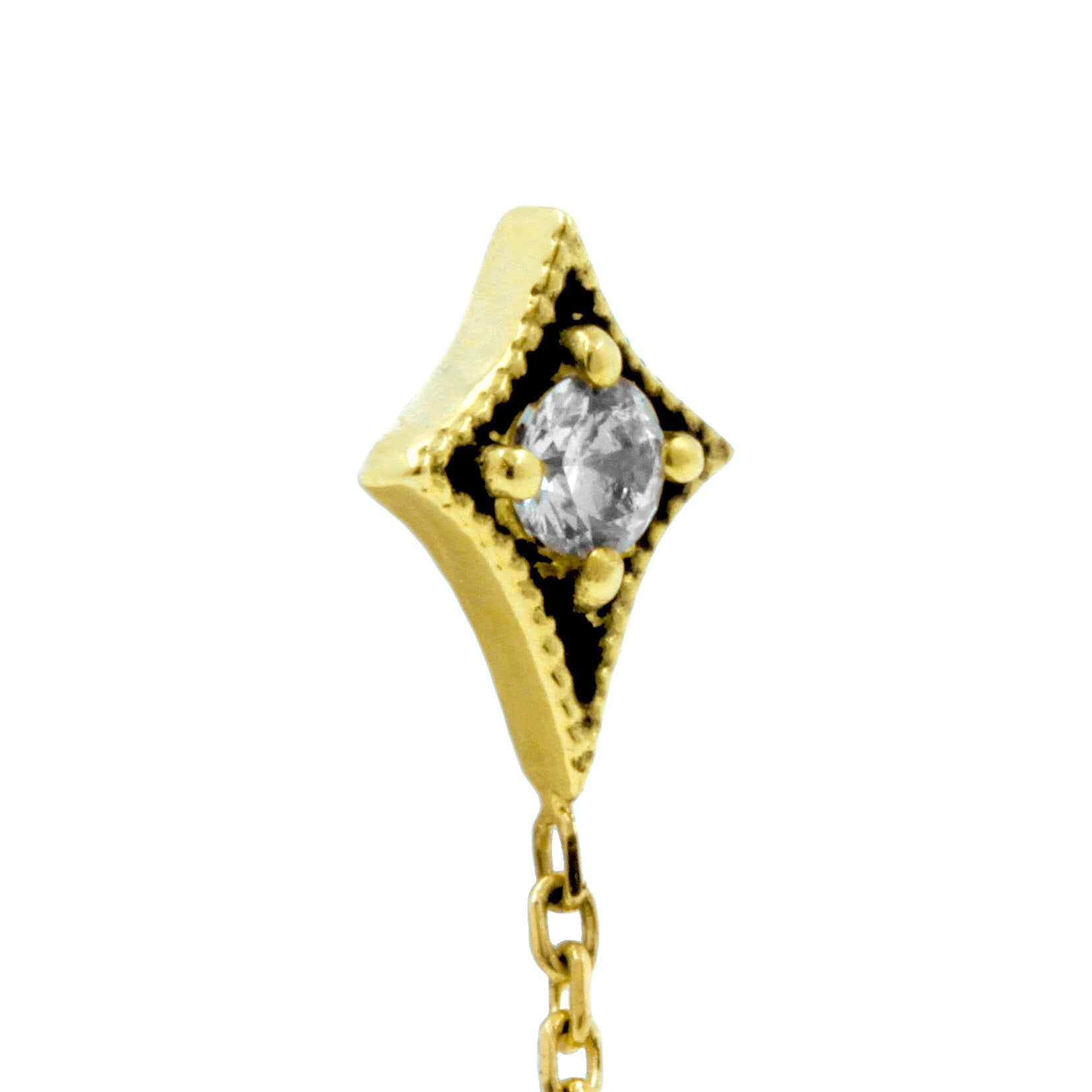 18 Karat Gold Zirconia Dotted Star With Chain instantly adds a stylish touch to your piercing. This Threadless Top is made of 18 Karat Gold. The threadless system allows you to easily combine this top with all our bars, which we call Threadless Base, for a perfect fit and ultimate comfort.
