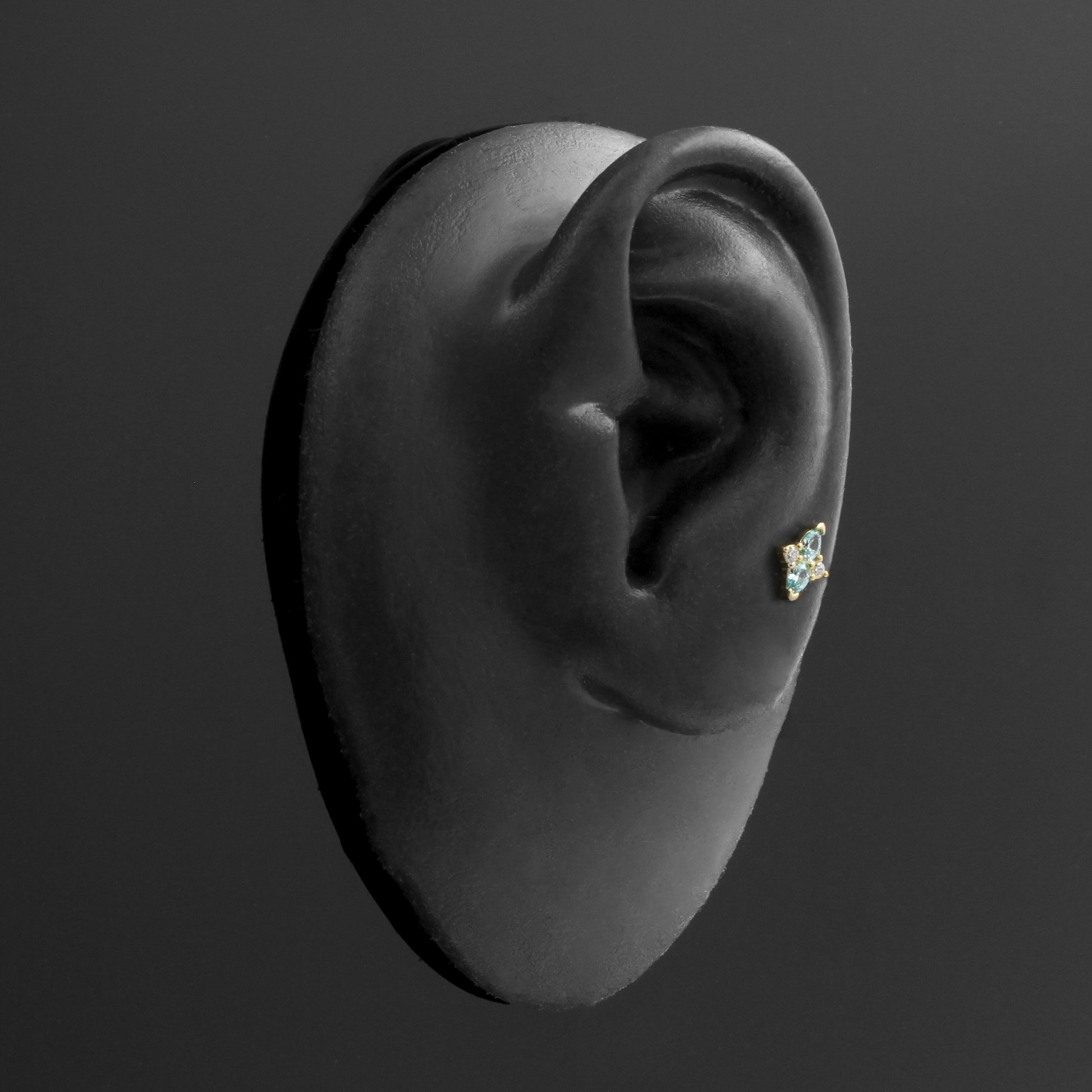 18 Karat Gold Zirconia Star Cluster instantly adds a stylish touch to your piercing. This Threadless Top is made of 18 Karat Gold with a cubic zirconia in Clear / Frosted Mint. The threadless system allows you to easily combine this top with all our bars, which we call Threadless Base, for a perfect fit and ultimate comfort.
