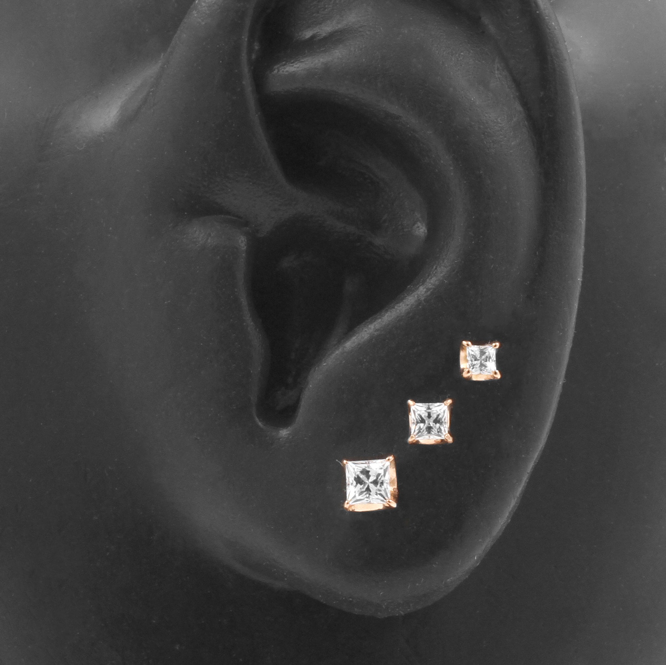 18 Karat Rose Gold Zirconia Square instantly adds a stylish touch to your piercing. This Threadless Top is made of 18 Karat Rose Gold. The threadless system allows you to easily combine this top with all our bars, which we call Threadless Base, for a perfect fit and ultimate comfort.