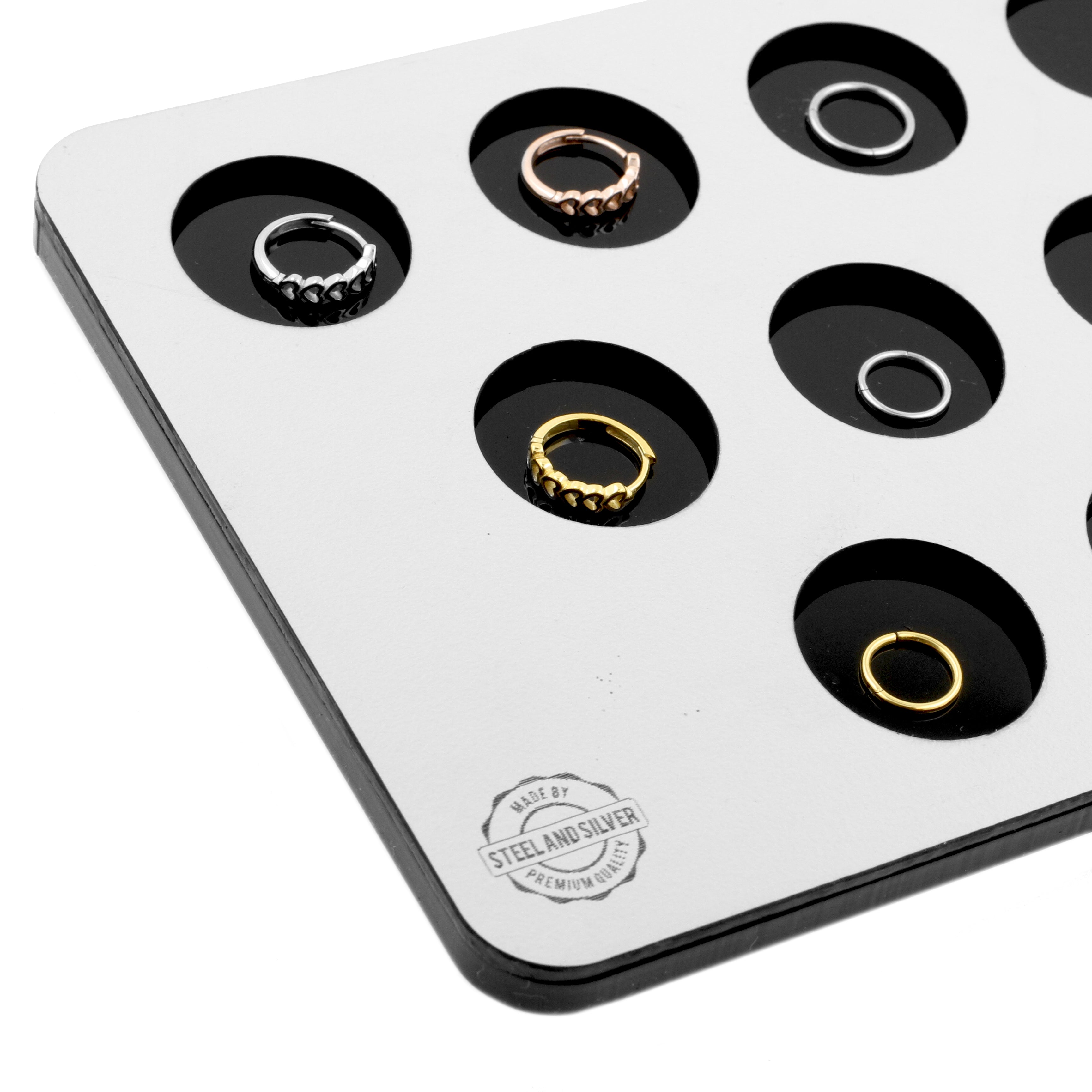 Beautiful display for piercing rings. Suitable for displaying 15 rings.