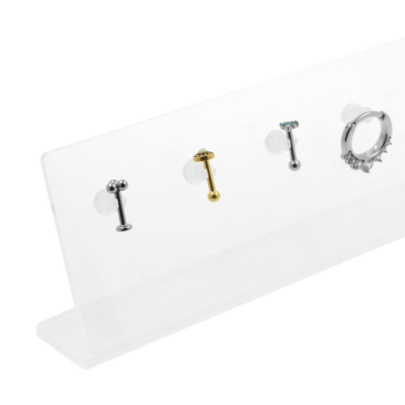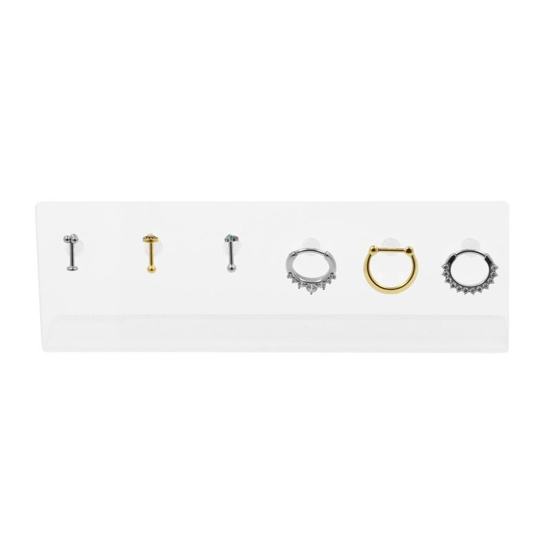 Piercing display made of acrylic, for displaying 6 rings or barbells. Fitted with small clasps. Perfect for showcasing your piercing accessory collection! Available in different heights: small, medium or large.