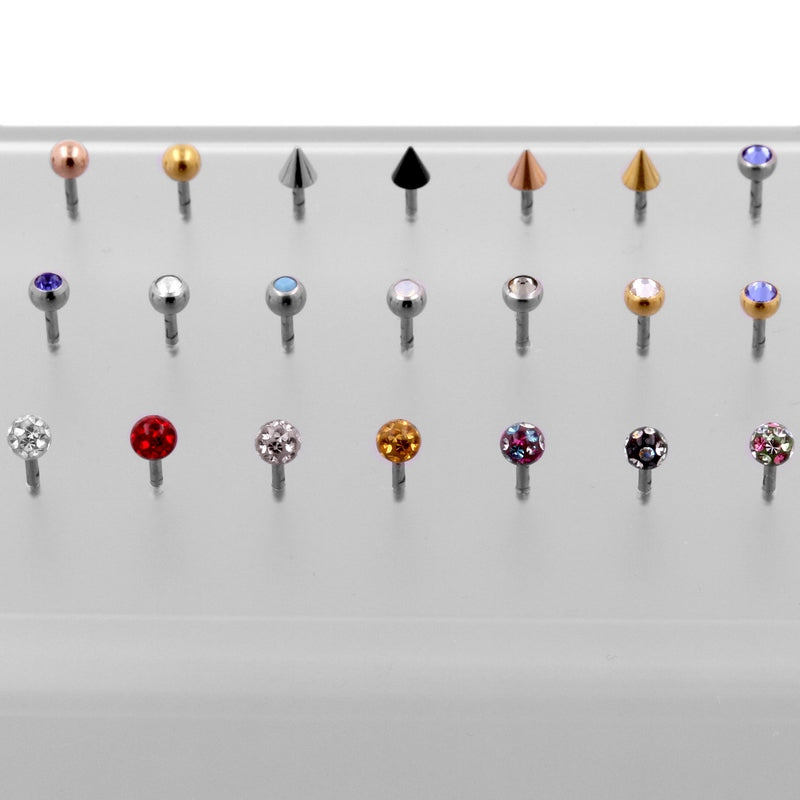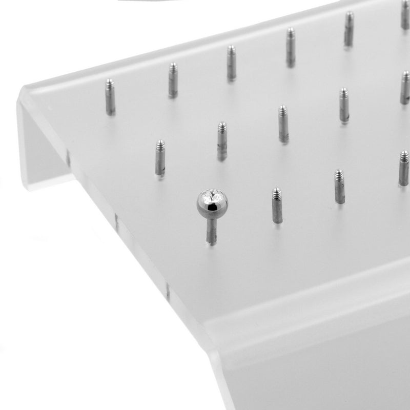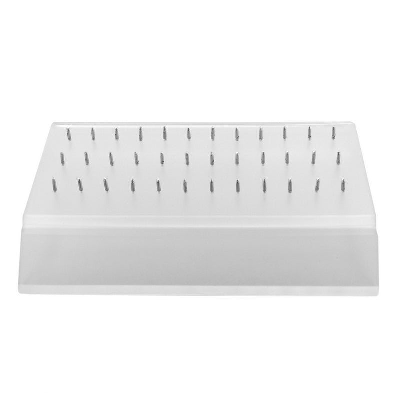 Compact, transparent display made of acrylic, for displaying 36 different threaded accessories. Available for 1,2 mm threading or 1,6 mm internal threading.