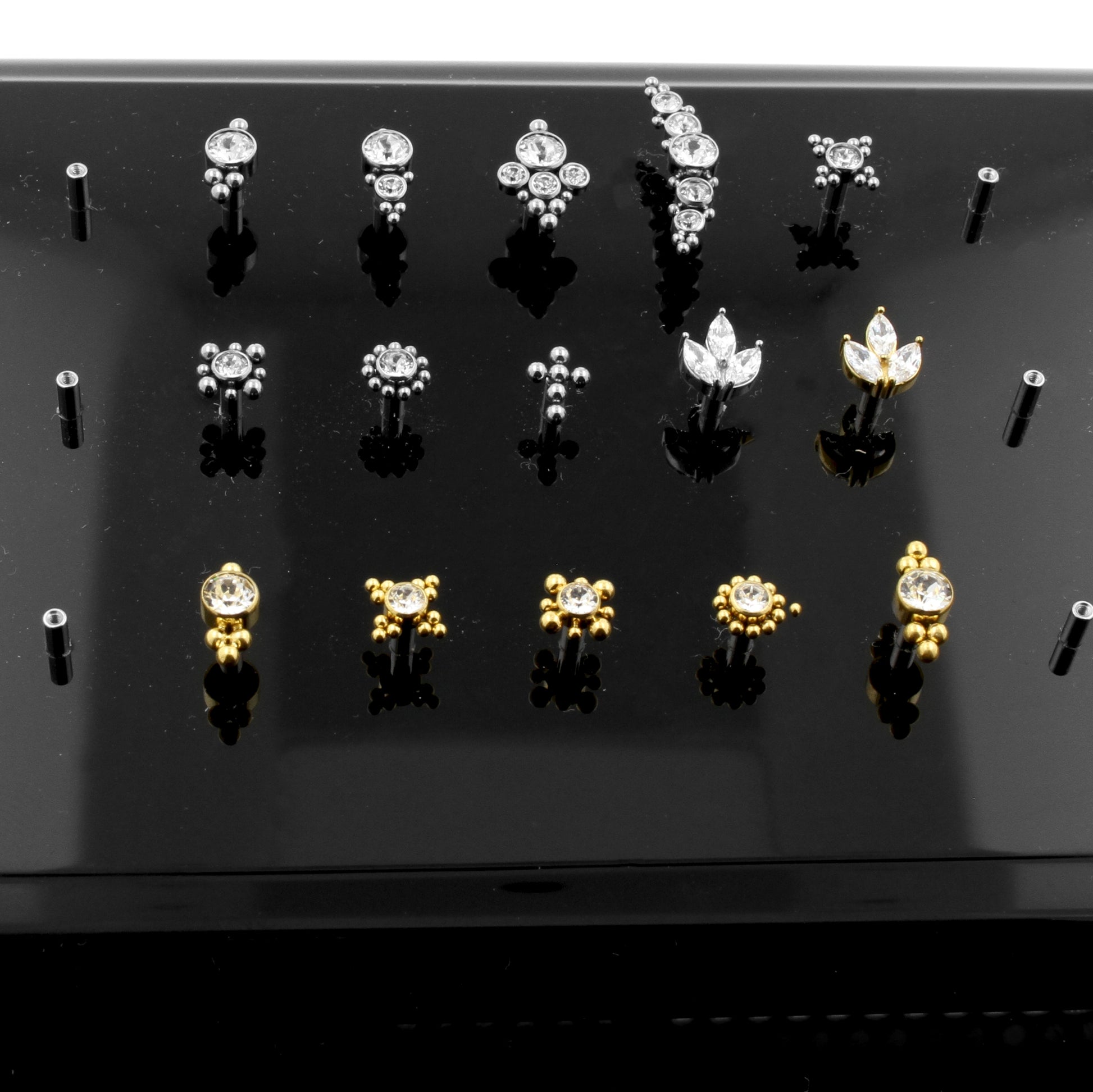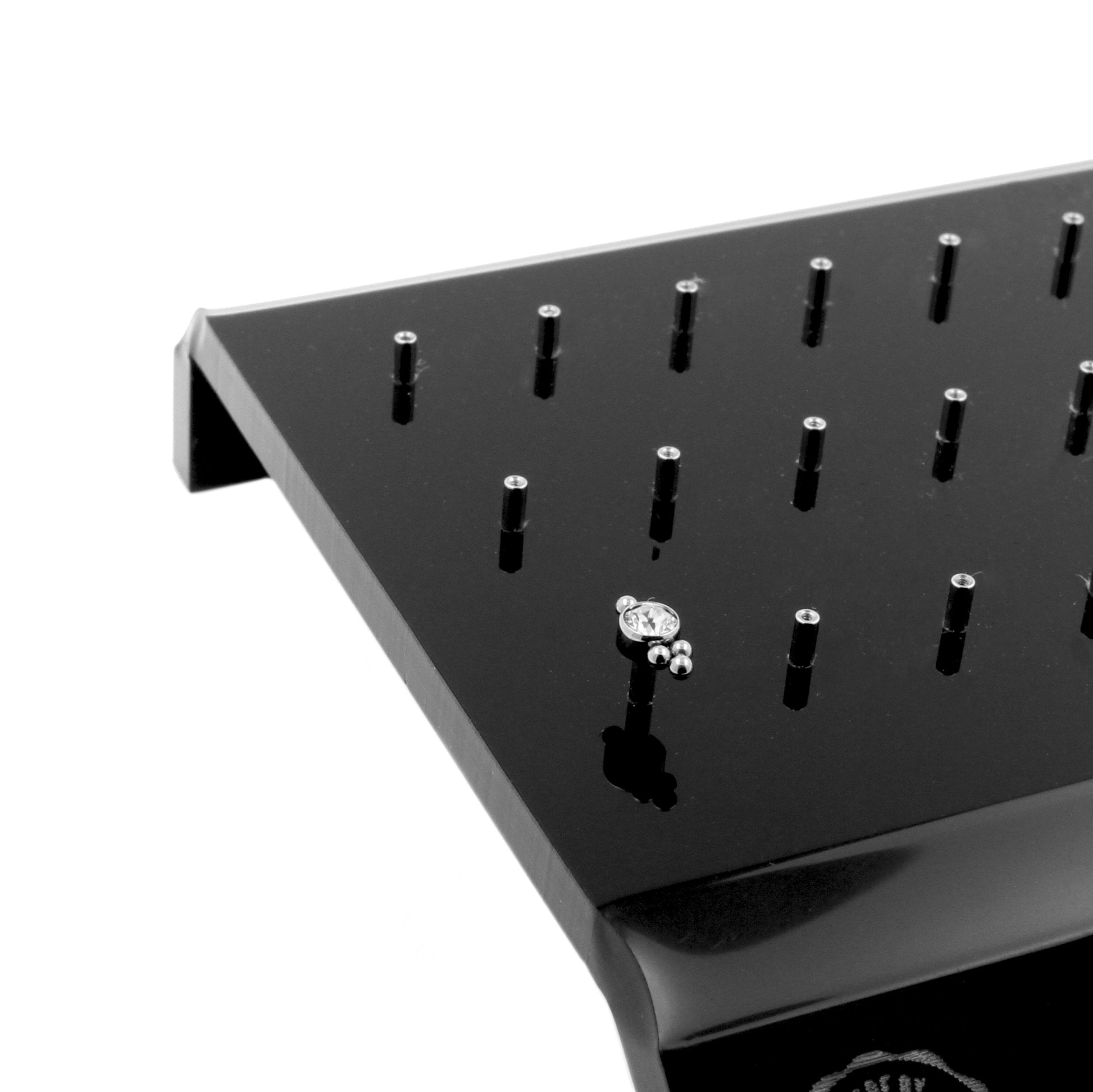Handy, acrylic display for internally threaded piercing accessories. Show your customers your jewelry combinations or complete collections! These acrylic displays will look great on any counter or display cabinet. The display is fitted with internally threaded pins made of steel and will fit 36 piercing accessories. Available for 1,2 mm internally threaded jewelry. Display size: 10 x 15 cm.