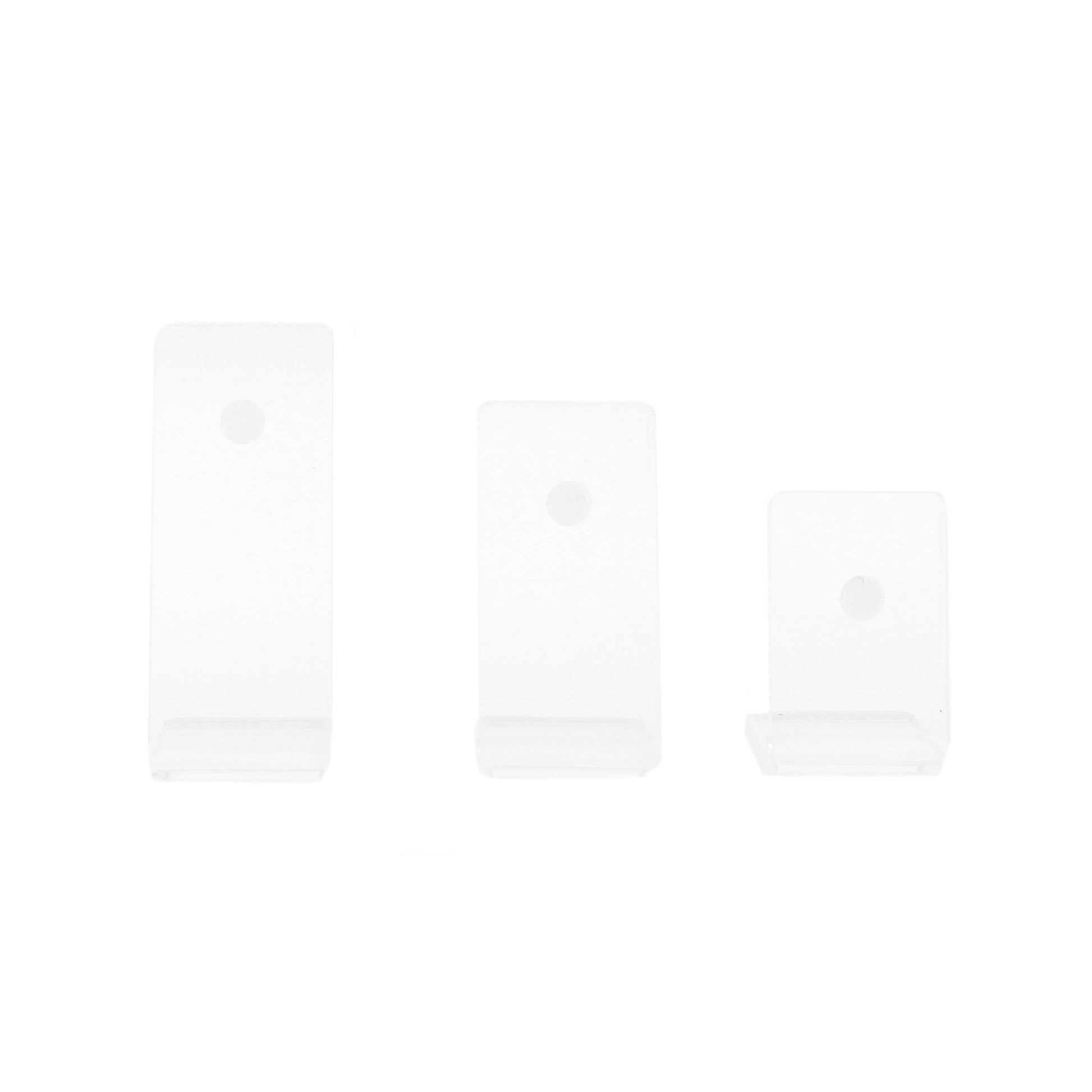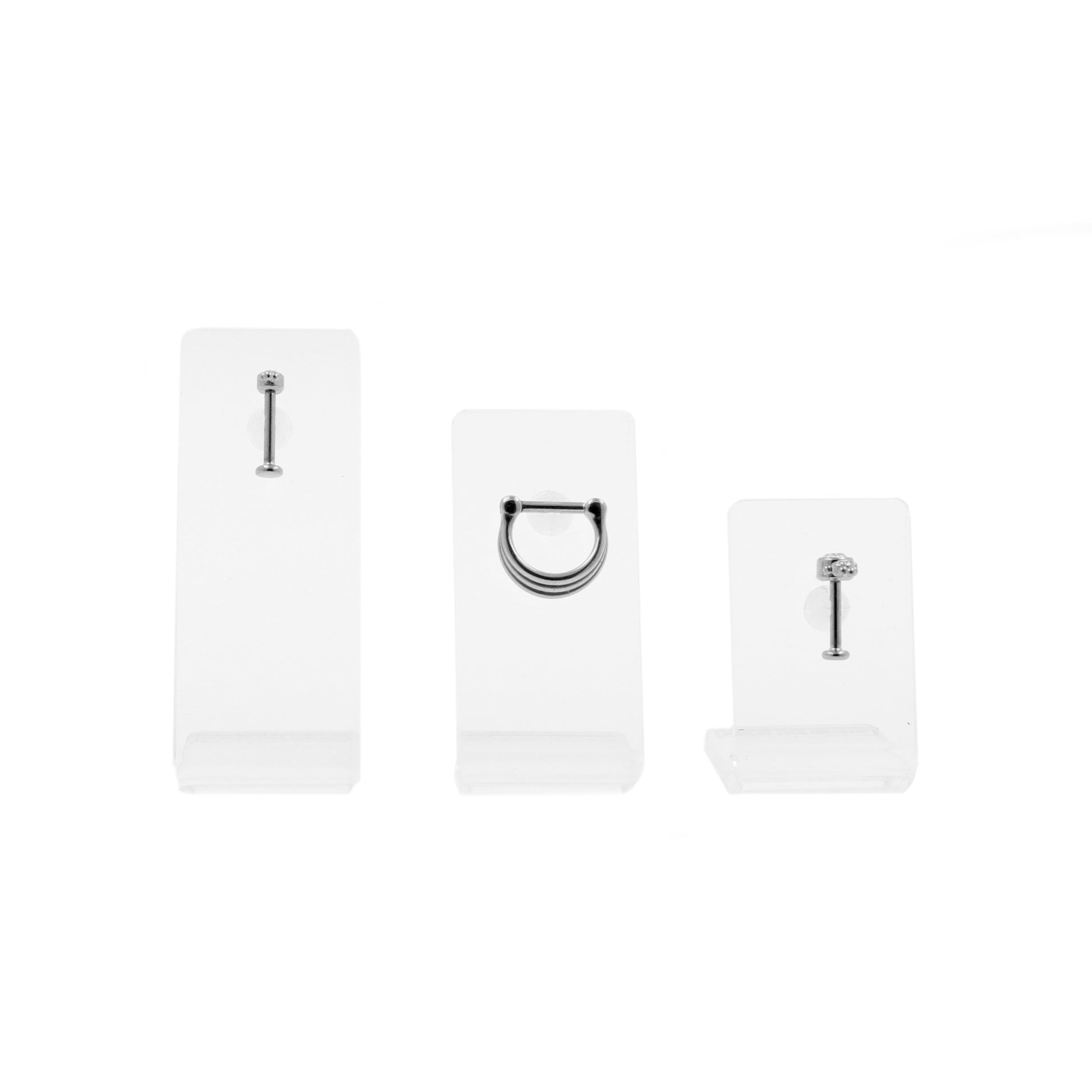 Handy, acrylic display for holding piercing jewelry. These acrylic displays will look great on any counter or display cabinet. The displays are fitted with clips that will hold 0,8 mm up to 1,2 mm piercing jewelry. Great for shwoing piercing rings, labret studs or any other piece of piercing jewelry to your custoers . This set consists of 3 displays with the following sizes: 2 x 3 cm, 2 x 4 cm and 2 x 5 cm.