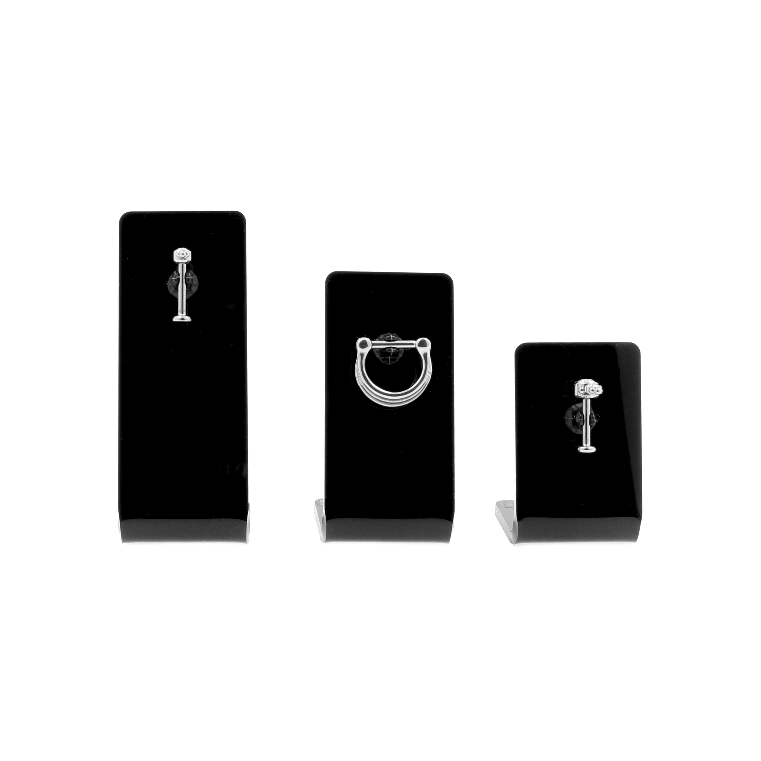 Handy, acrylic display for holding piercing jewelry. These acrylic displays will look great on any counter or display cabinet. The displays are fitted with clips that will hold 0,8 mm up to 1,2 mm piercing jewelry. Great for shwoing piercing rings, labret studs or any other piece of piercing jewelry to your custoers . This set consists of 3 displays with the following sizes: 2 x 3 cm, 2 x 4 cm and 2 x 5 cm.