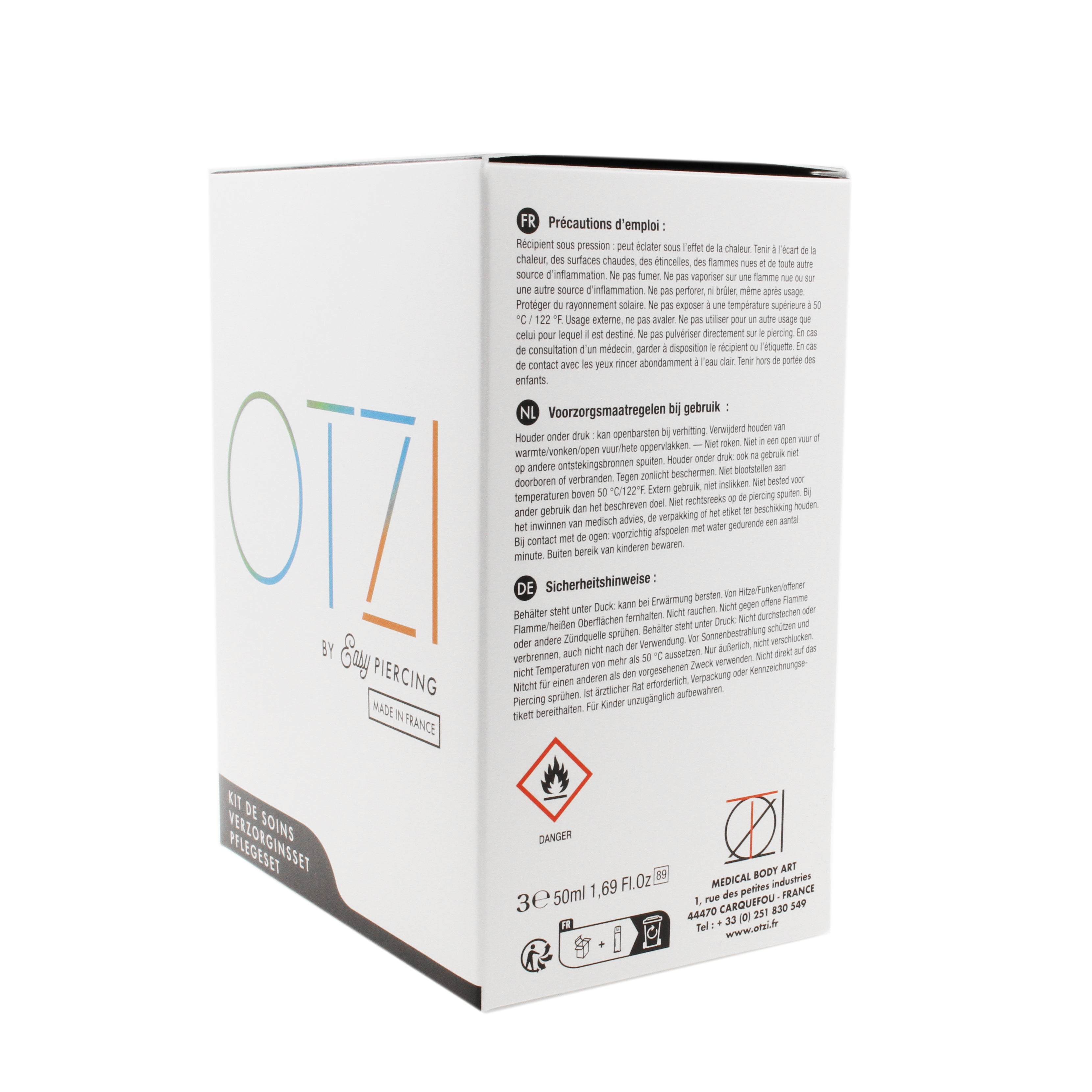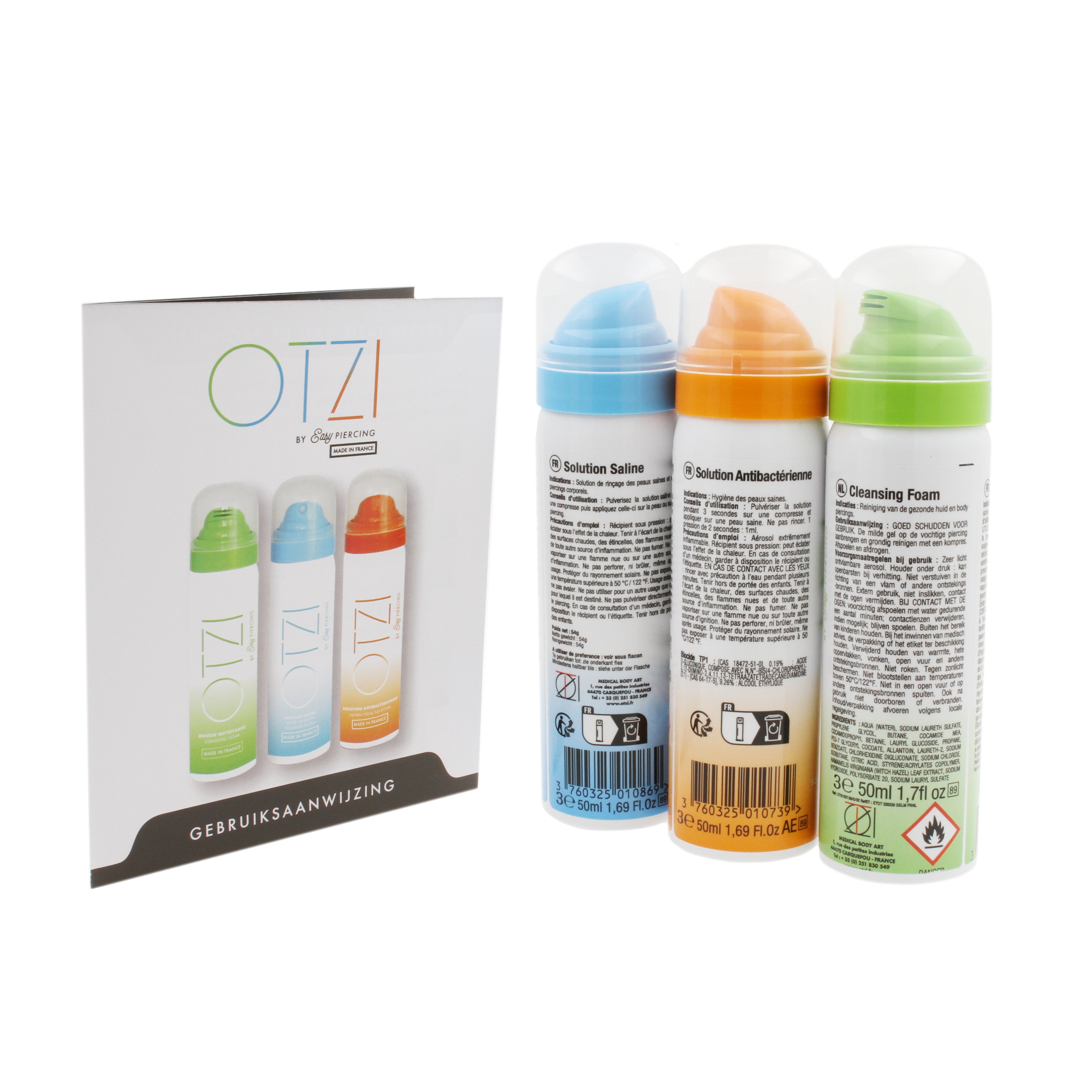 Easy to use! Complete aftercare set from the Easypiercing® range made by Otzi. This complete aftercare kit contains the antibacterial spray, saline spray and antibacterial cleansing gel from Otzi. All you need to keep your piercings clean and allow them to heal well!