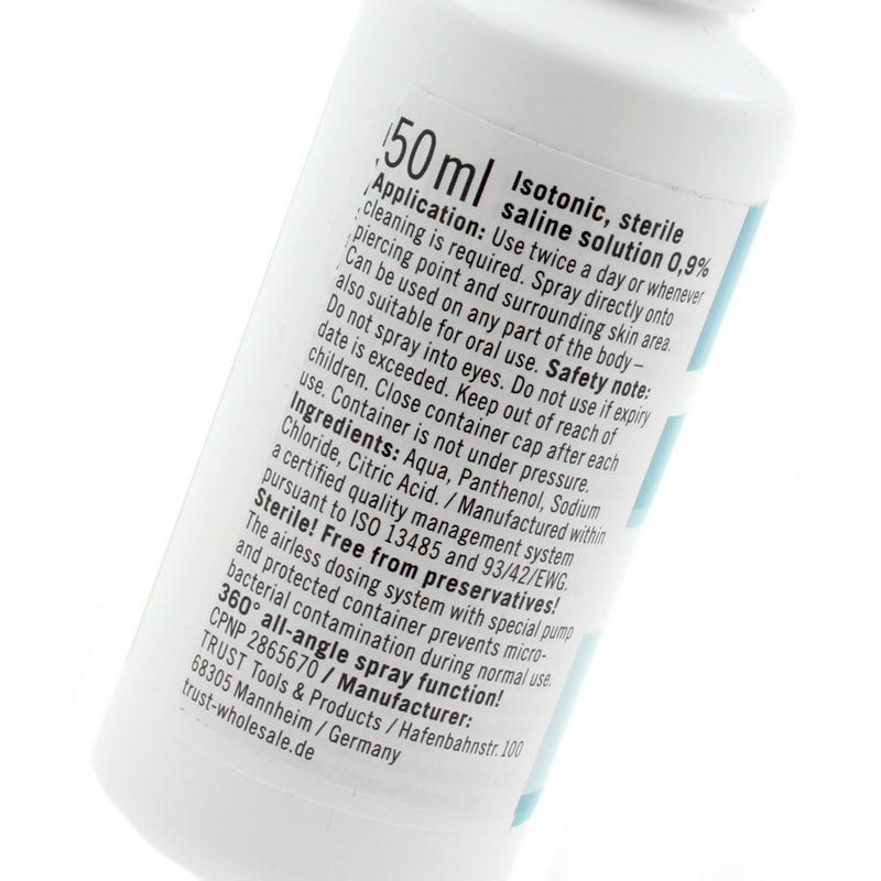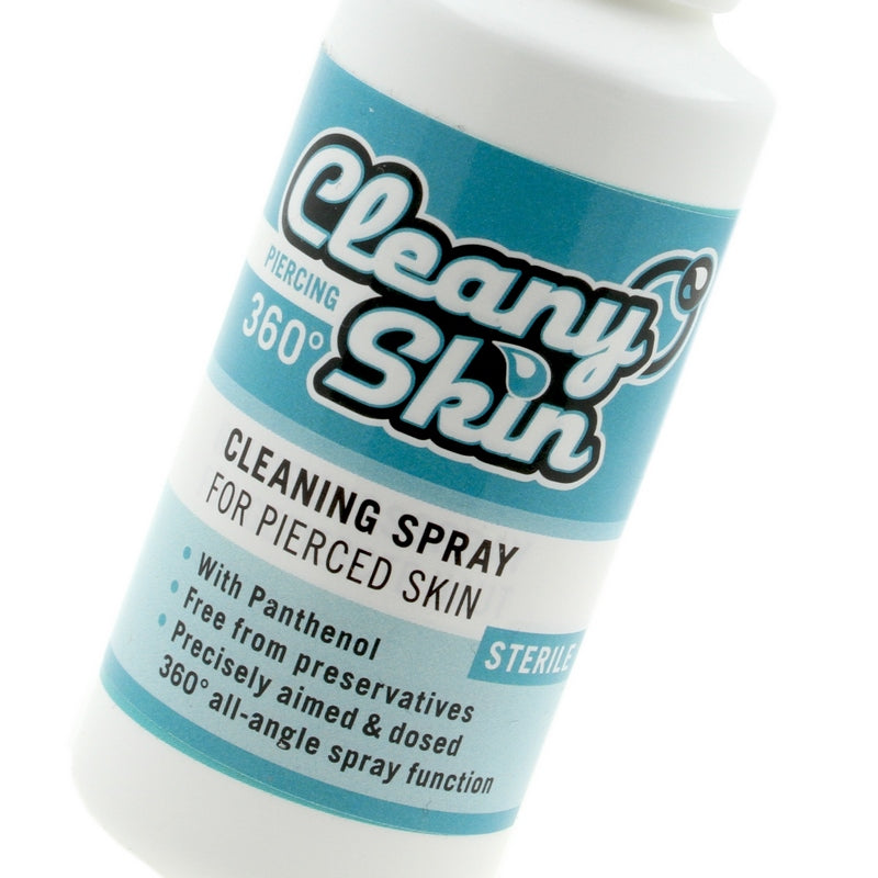 Cleany Skin piercing spray, speciaal om je genezende of problematische piercings mee te verzorgen. De zoutoplossing zit in een handige sprayflacon, waardoor je altijd voorzien bent van een schone en hygiënische dosis. De flacon is ook nog eens voorzien van een speciale spraykop en vanuit elke gewenste hoek te gebruiken. Ideaal voor de lastiger te bereiken piercings, zoals kraakbeenpiercings of septumpiercings! De fysiologische zoutoplossing reinigt en hydrateert de piercingwond en wondomgeving waardoor de genezing bespoedigd wordt. Daarnaast zorgt de toegevoegde Panthenol (vitamine B5) voor extra hydratie van je huid en helpt het jeuk en irritatie te verminderen. Je kunt de Cleany Skin zoutoplossing spray zonder problemen voor een langere tijd gebruiken.