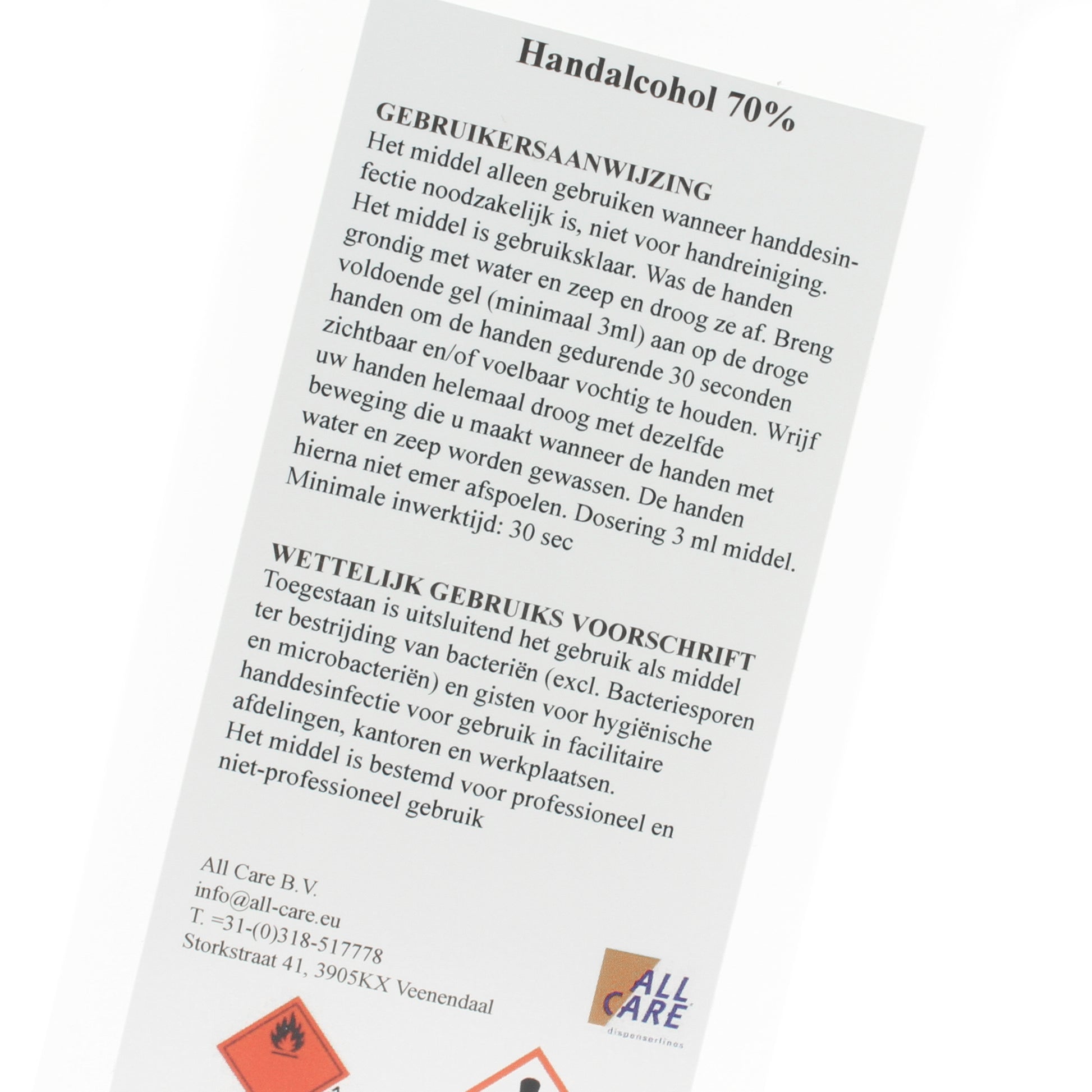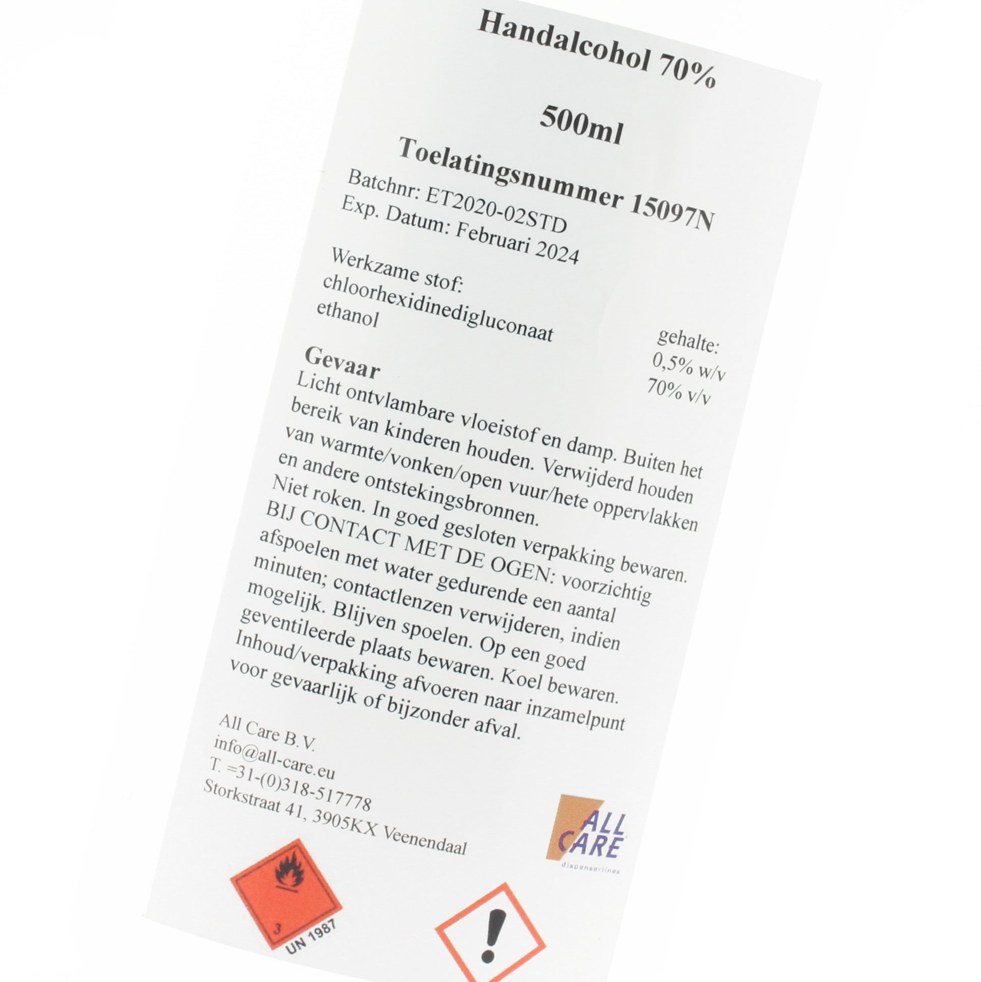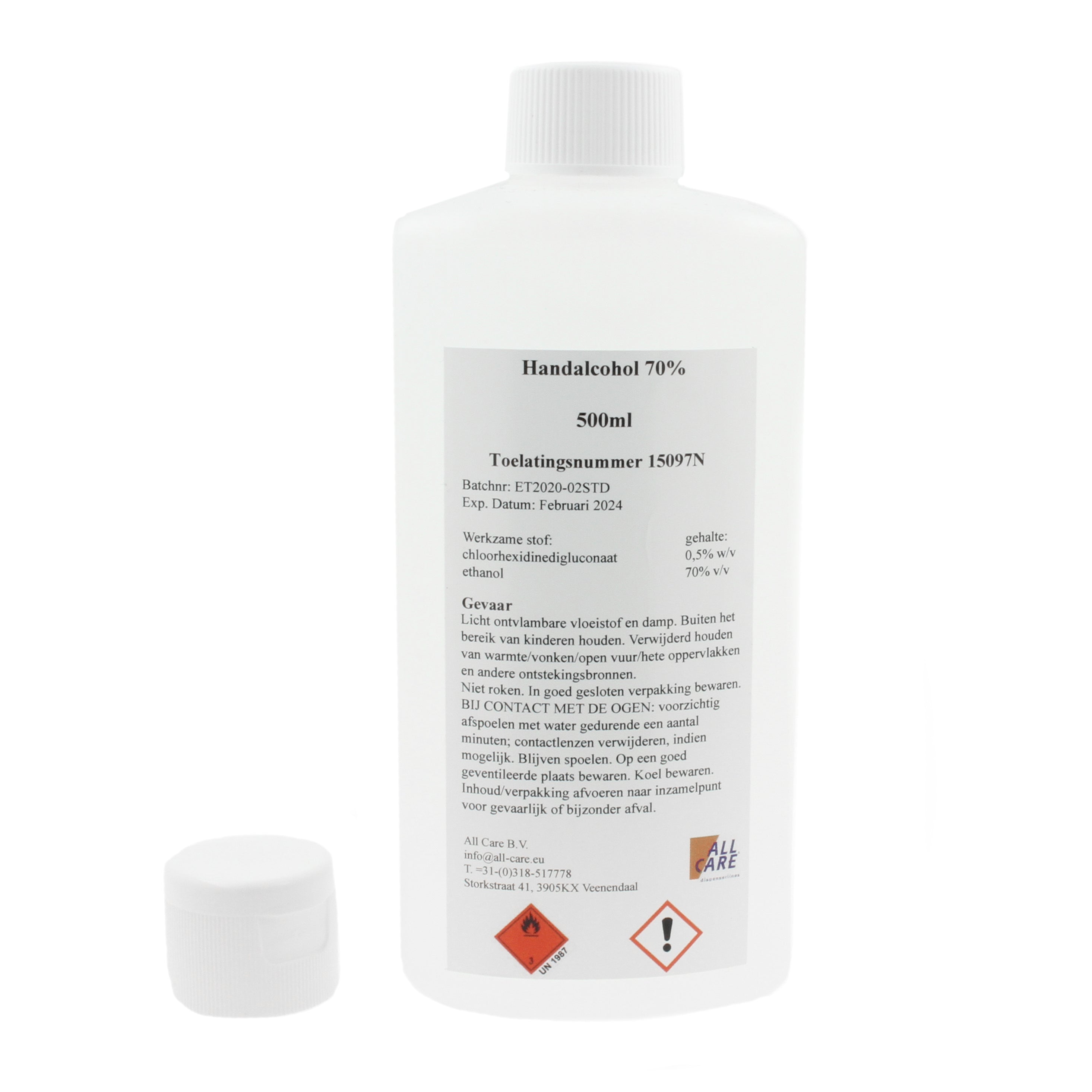 500 ml Hand alcohol for hand desinfection based on 70% ethanol and 0,5% chlorhexidine digluconate. Measuring cap included.