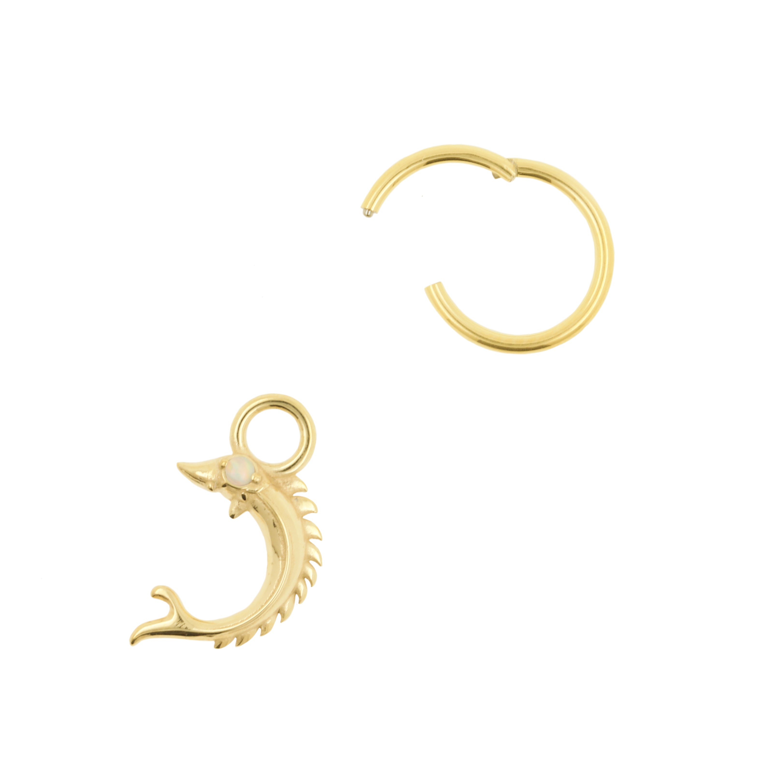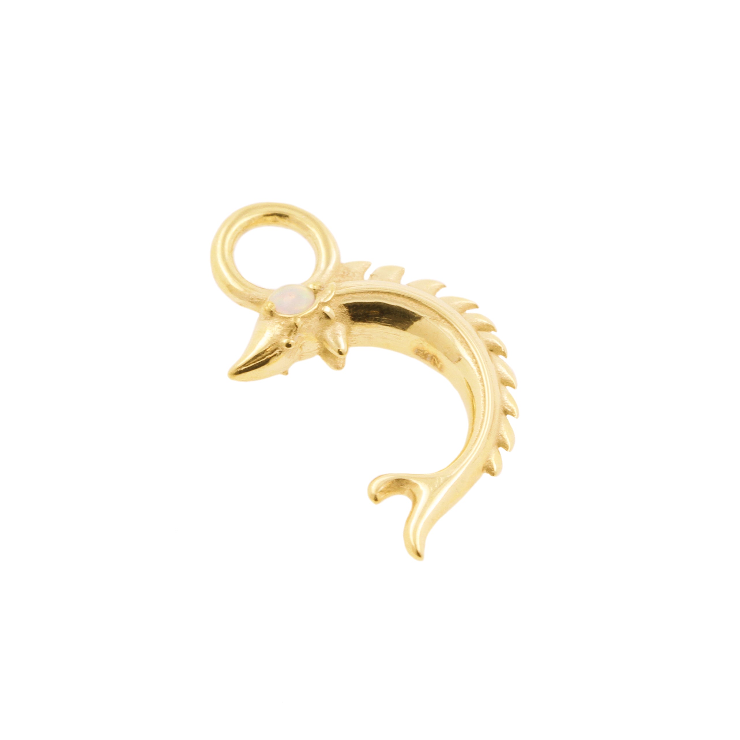 Add refinement to your jewelry with this tuna charm. Made from Nickel-free Stainless Steel with gold-colored PVD coating. Provided with synthetic opal.