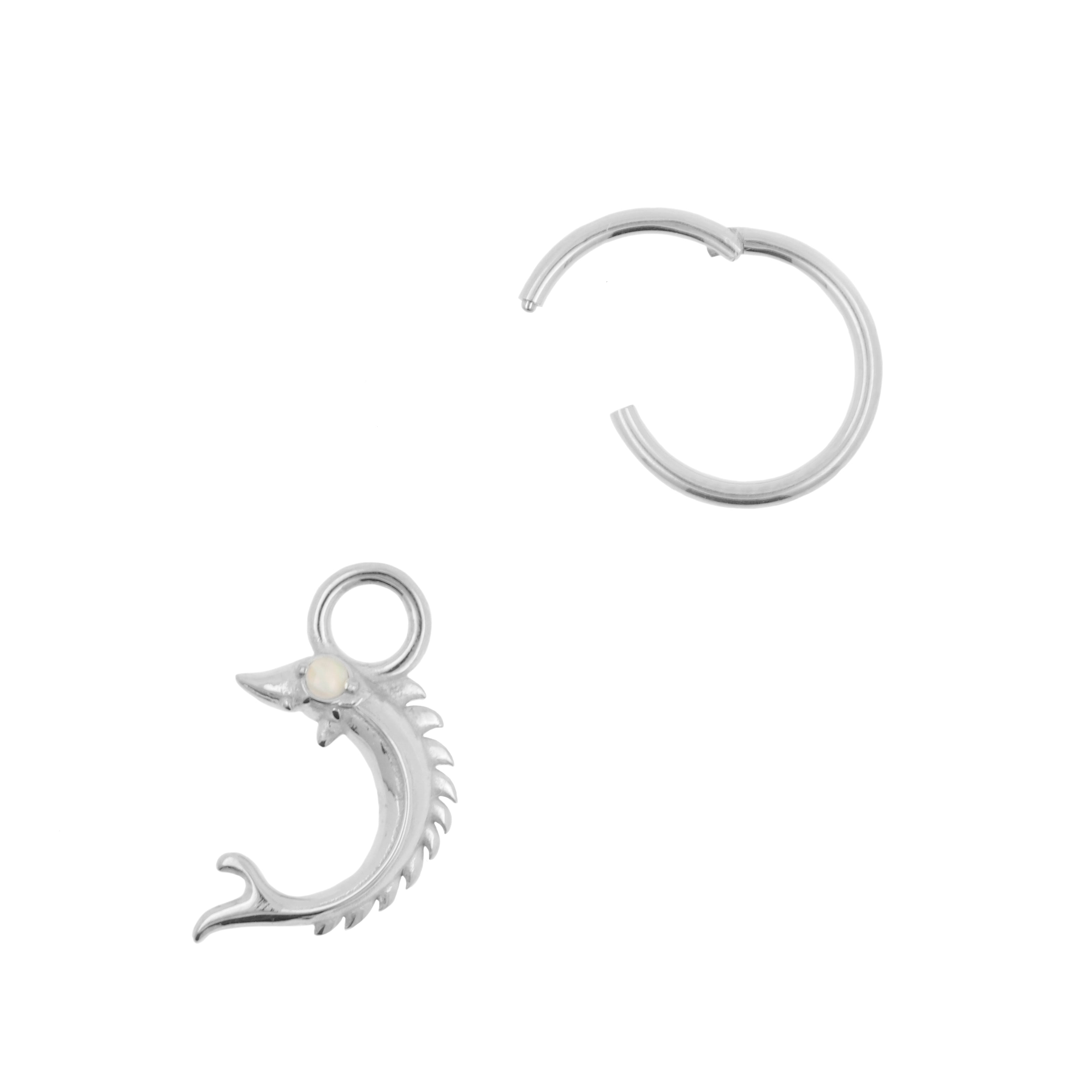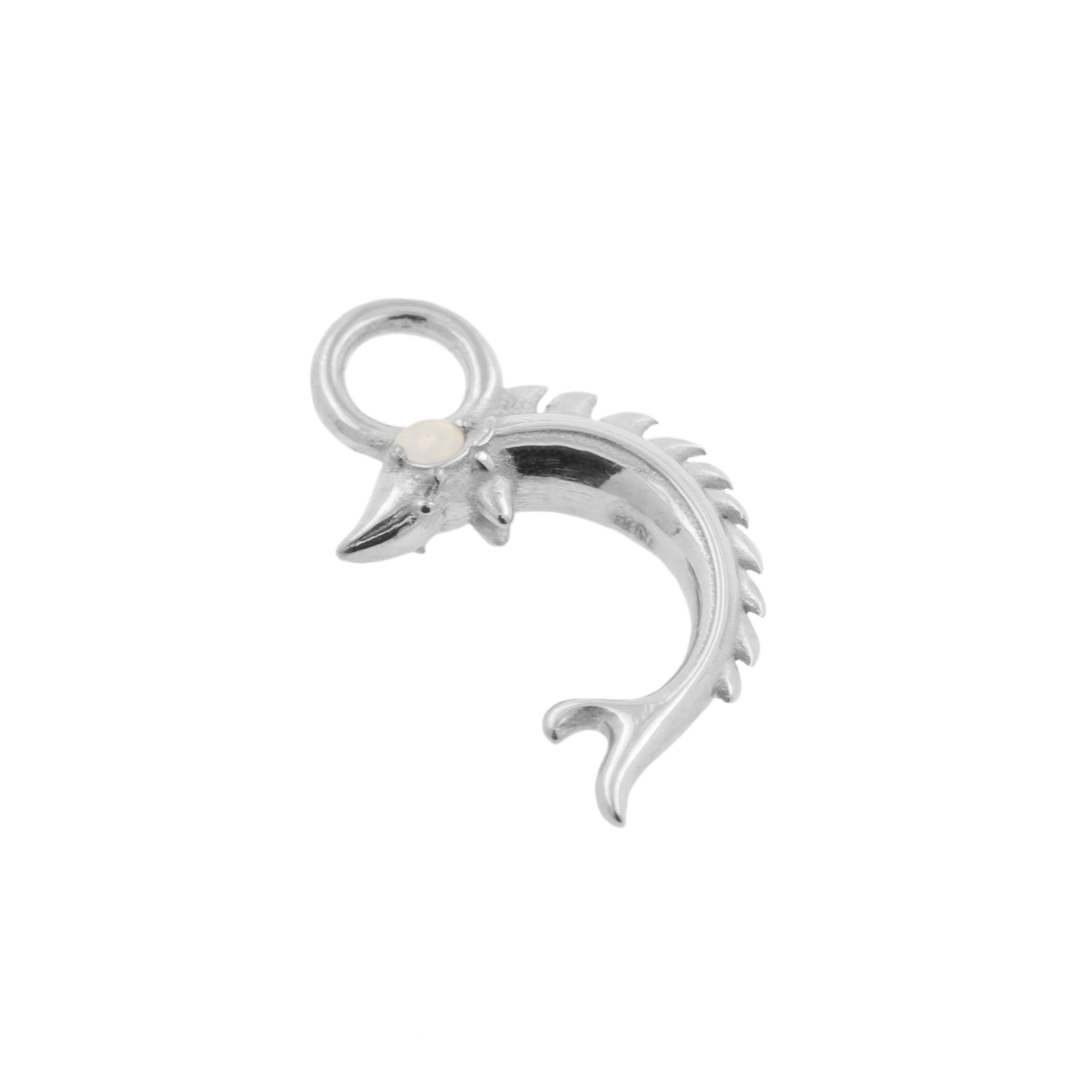 Add refinement to your jewelry with this tuna charm. Made from Nickel-free Stainless Steel with silver-colored PVD coating with a white-gold sheen (nickel-free). Provided with synthetic opal.