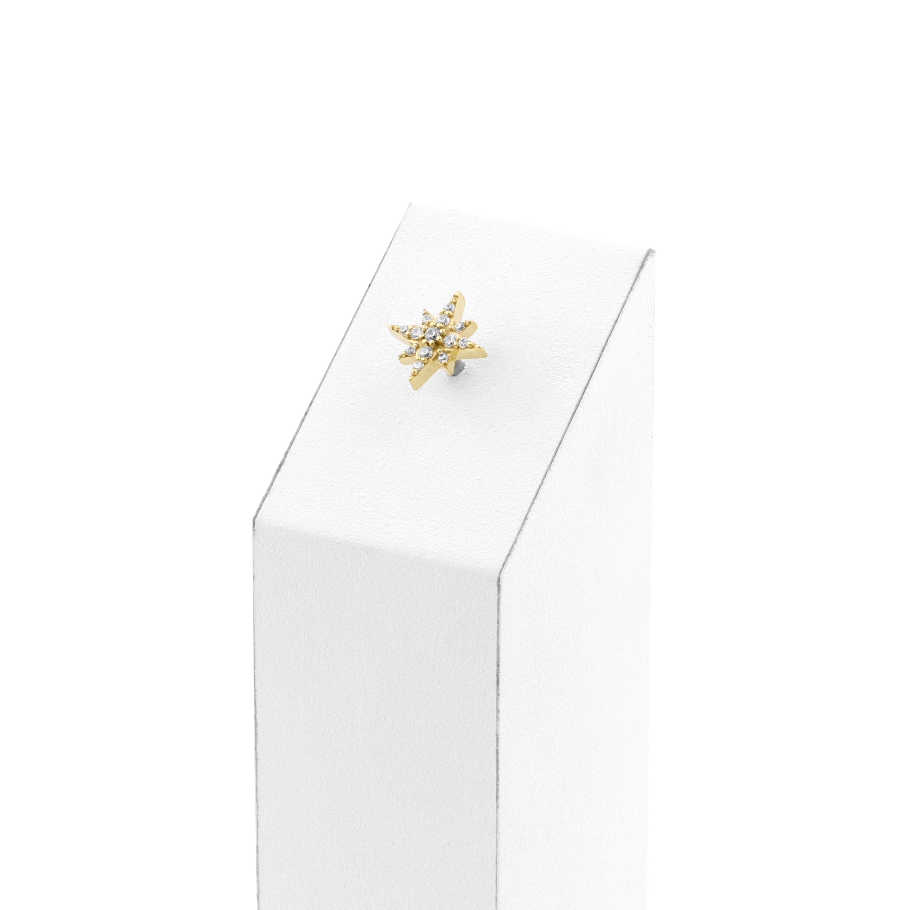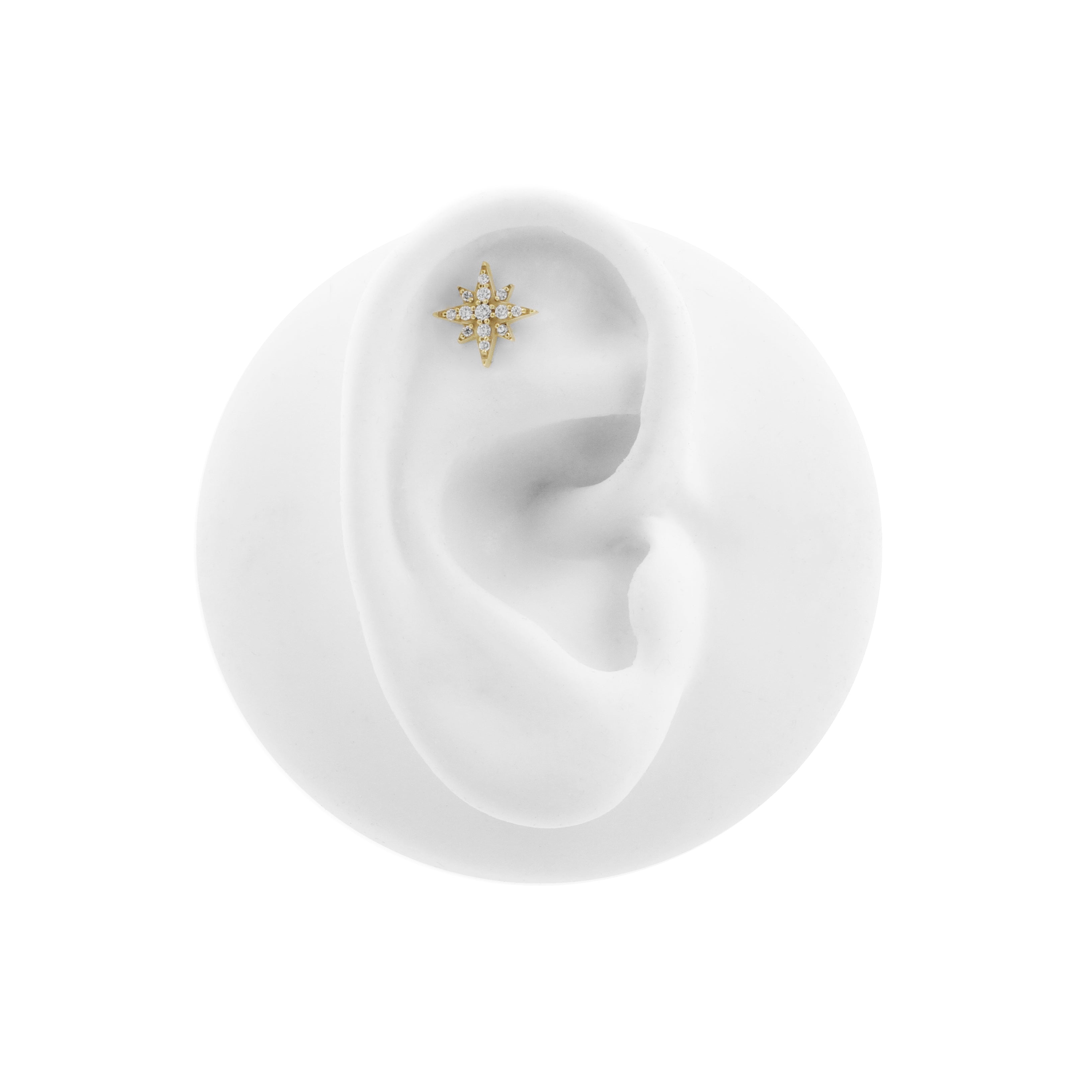 Nickel-Free Stainless Steel - Zirconia Northern Star - Gold instantly adds a stylish touch to your piercing. This Threadless Top is made of Nickel-Free Stainless Steel with a cubic zirconia in Clear. The threadless system allows you to easily combine this top with all our bars, which we call Threadless Base, for a perfect fit and ultimate comfort.