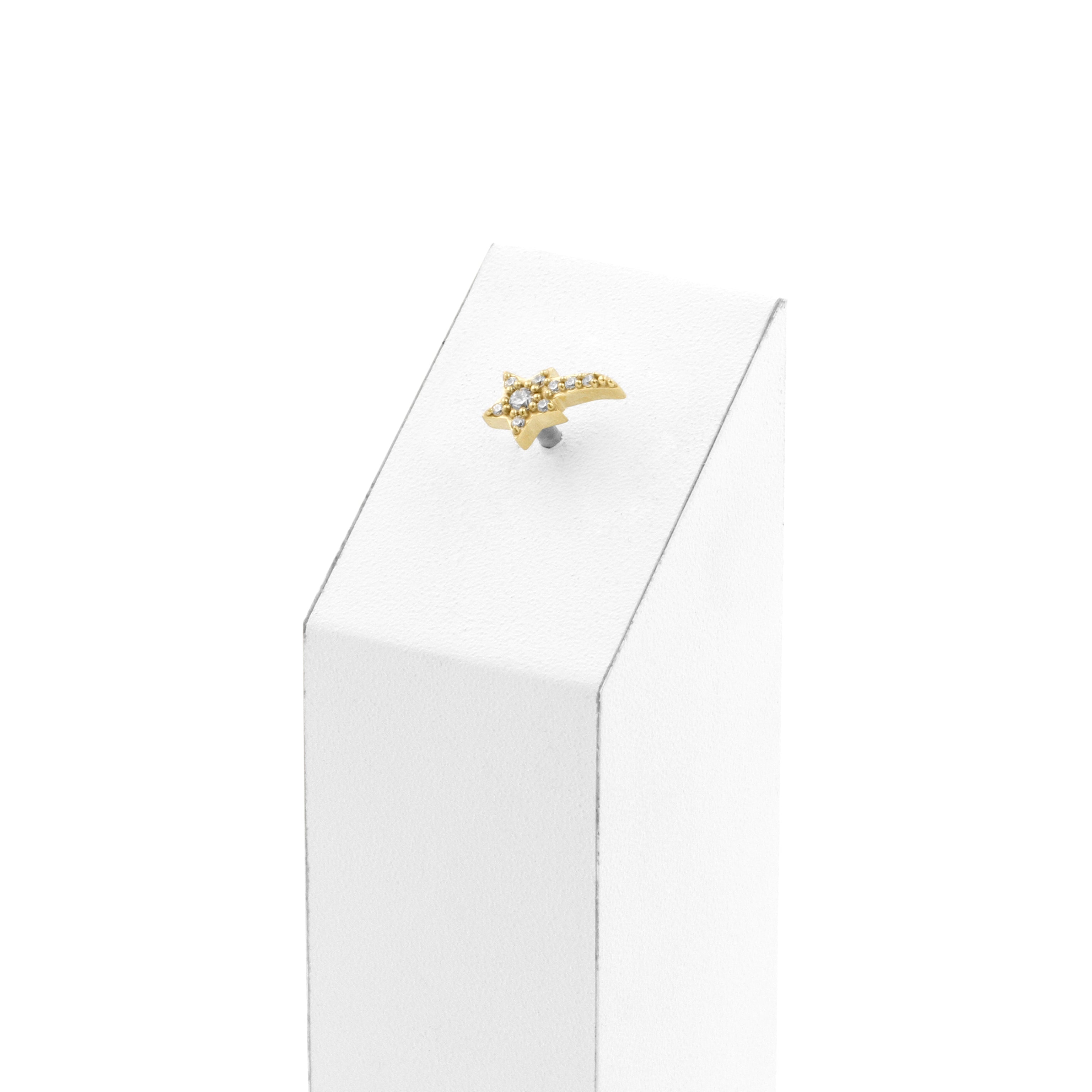 Nickel-Free Stainless Steel - Zirconia Shooting Star - Gold instantly adds a stylish touch to your piercing. This Threadless Top is made of Nickel-Free Stainless Steel with a cubic zirconia in Clear. The threadless system allows you to easily combine this top with all our bars, which we call Threadless Base, for a perfect fit and ultimate comfort.