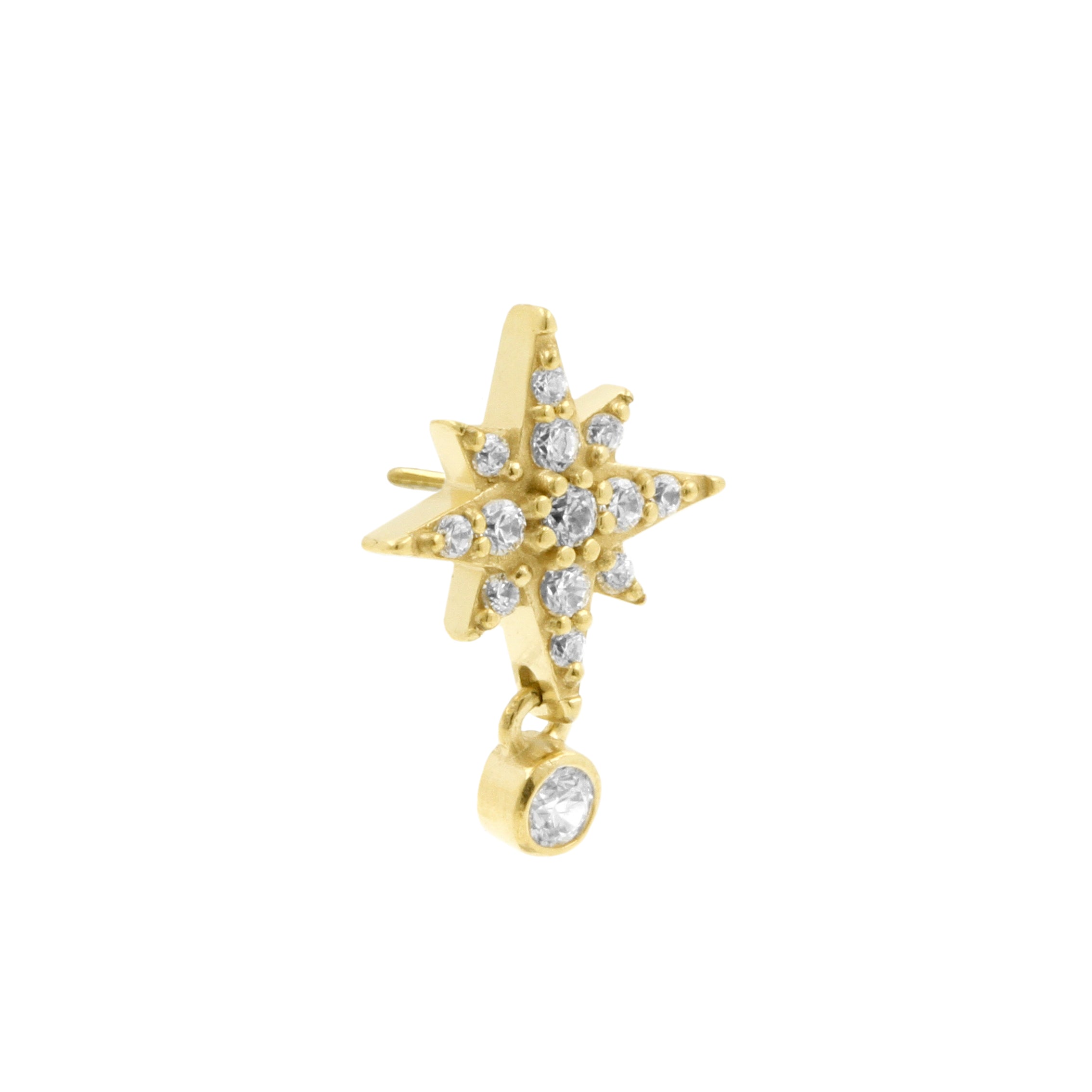 Nickel-Free Stainless Steel - Zirconia Star Dangle - Gold instantly adds a stylish touch to your piercing. This Threadless Top is made of Nickel-Free Stainless Steel with a cubic zirconia in Clear. The threadless system allows you to easily combine this top with all our bars, which we call Threadless Base, for a perfect fit and ultimate comfort.