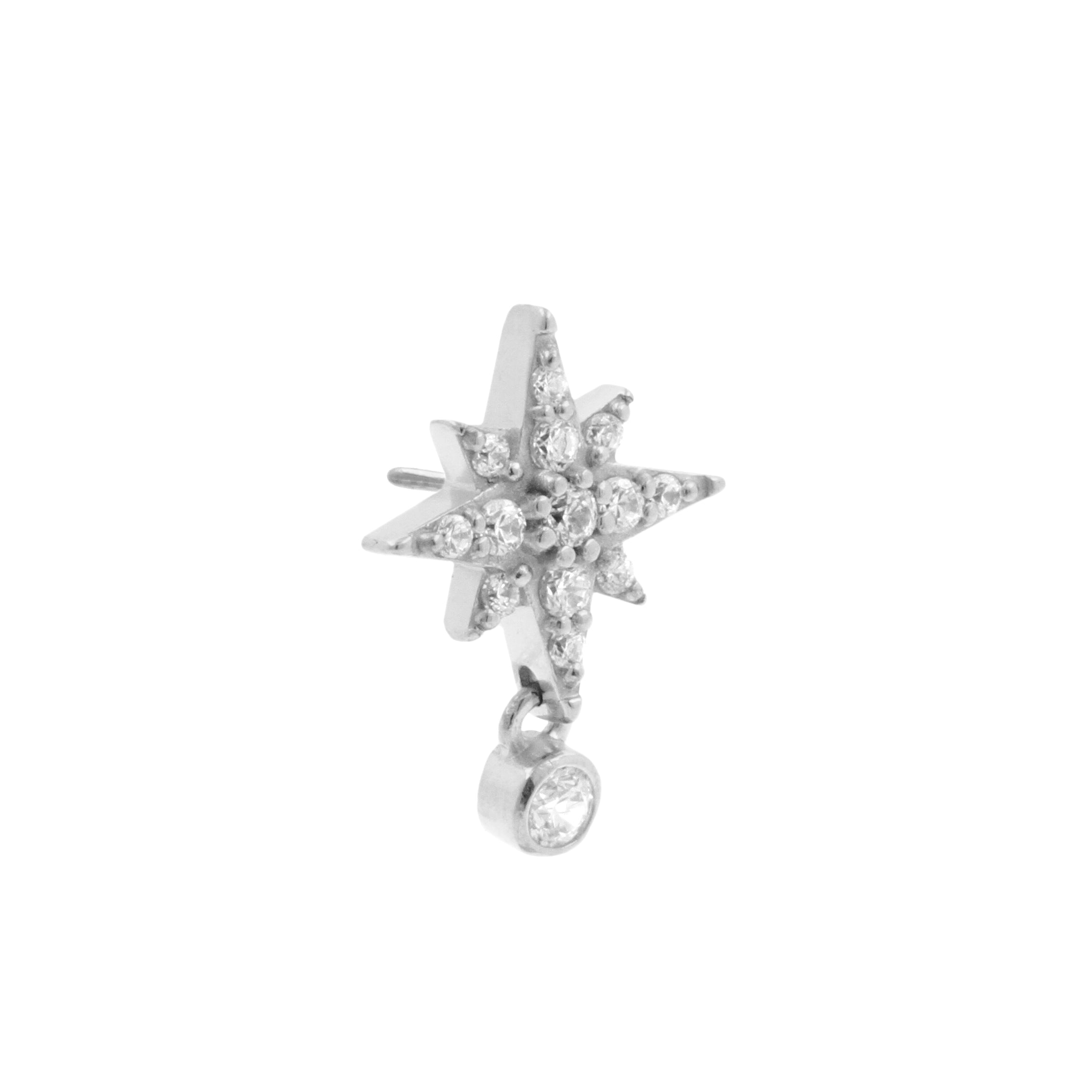 Nickel-Free Stainless Steel - Zirconia Star Dangle - Silver instantly adds a stylish touch to your piercing. This Threadless Top is made of Nickel-Free Stainless Steel with a cubic zirconia in Clear. The threadless system allows you to easily combine this top with all our bars, which we call Threadless Base, for a perfect fit and ultimate comfort.
