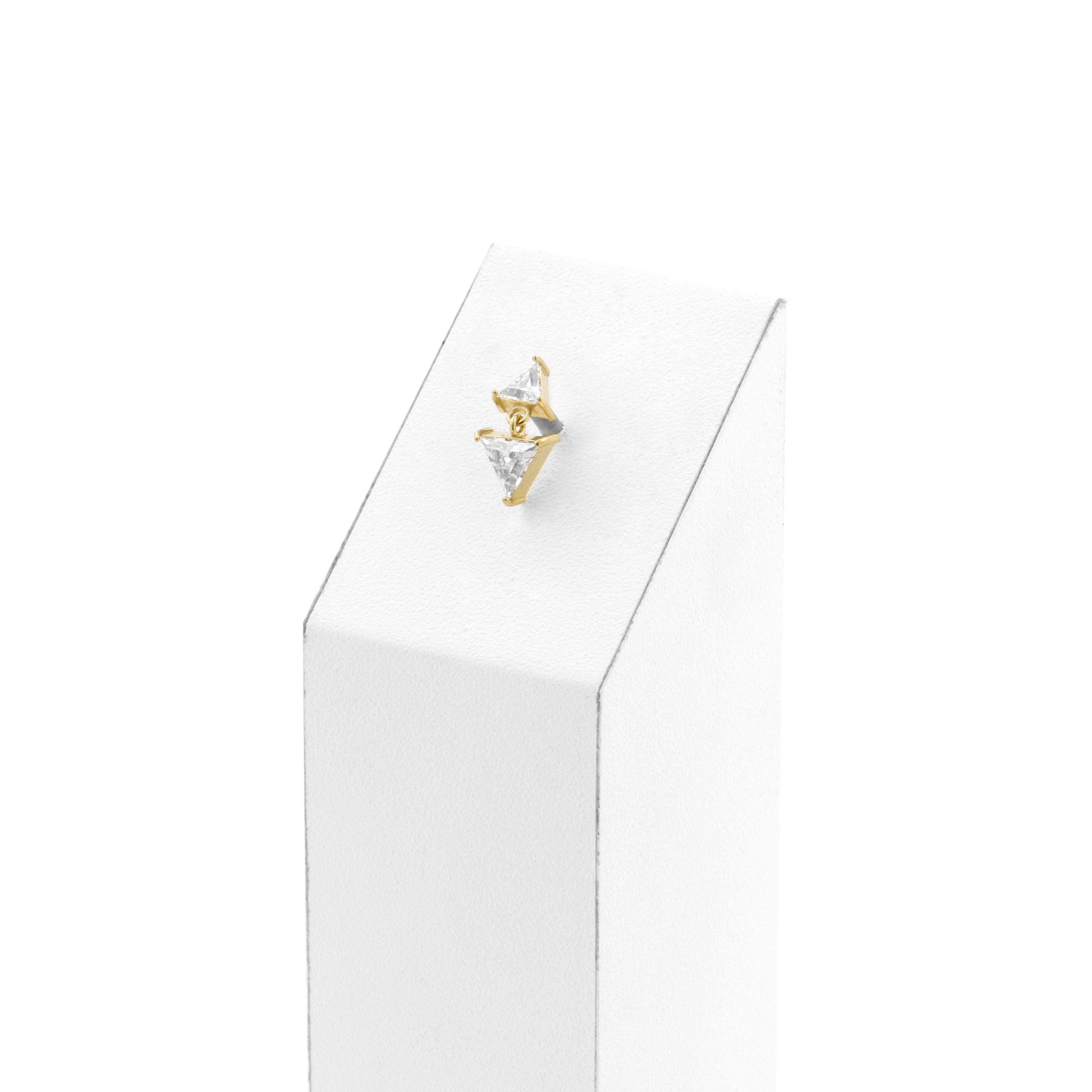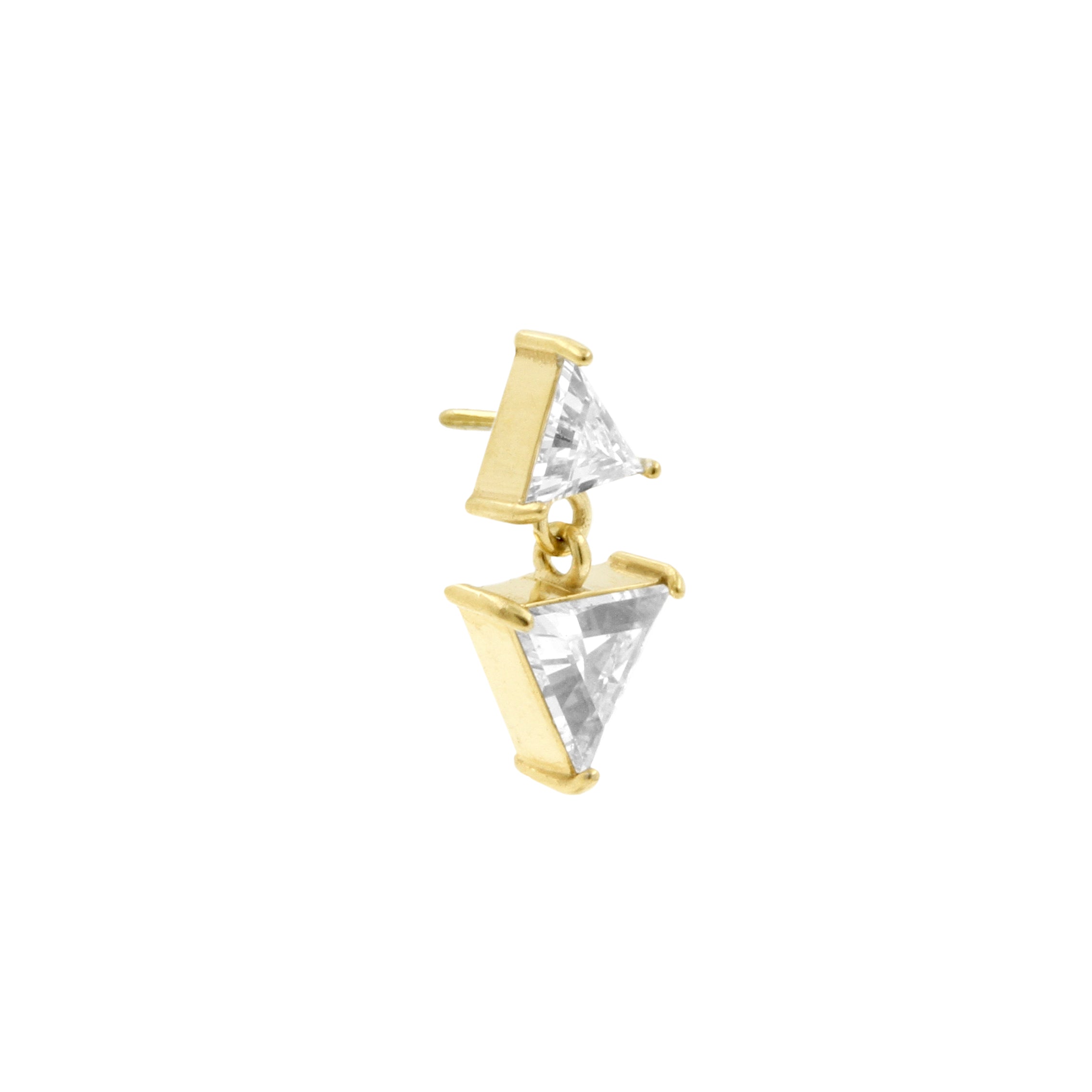 Nickel-Free Stainless Steel - Zirconia Triangle Dangle - Gold instantly adds a stylish touch to your piercing. This Threadless Top is made of Nickel-Free Stainless Steel with a cubic zirconia in Clear. The threadless system allows you to easily combine this top with all our bars, which we call Threadless Base, for a perfect fit and ultimate comfort.