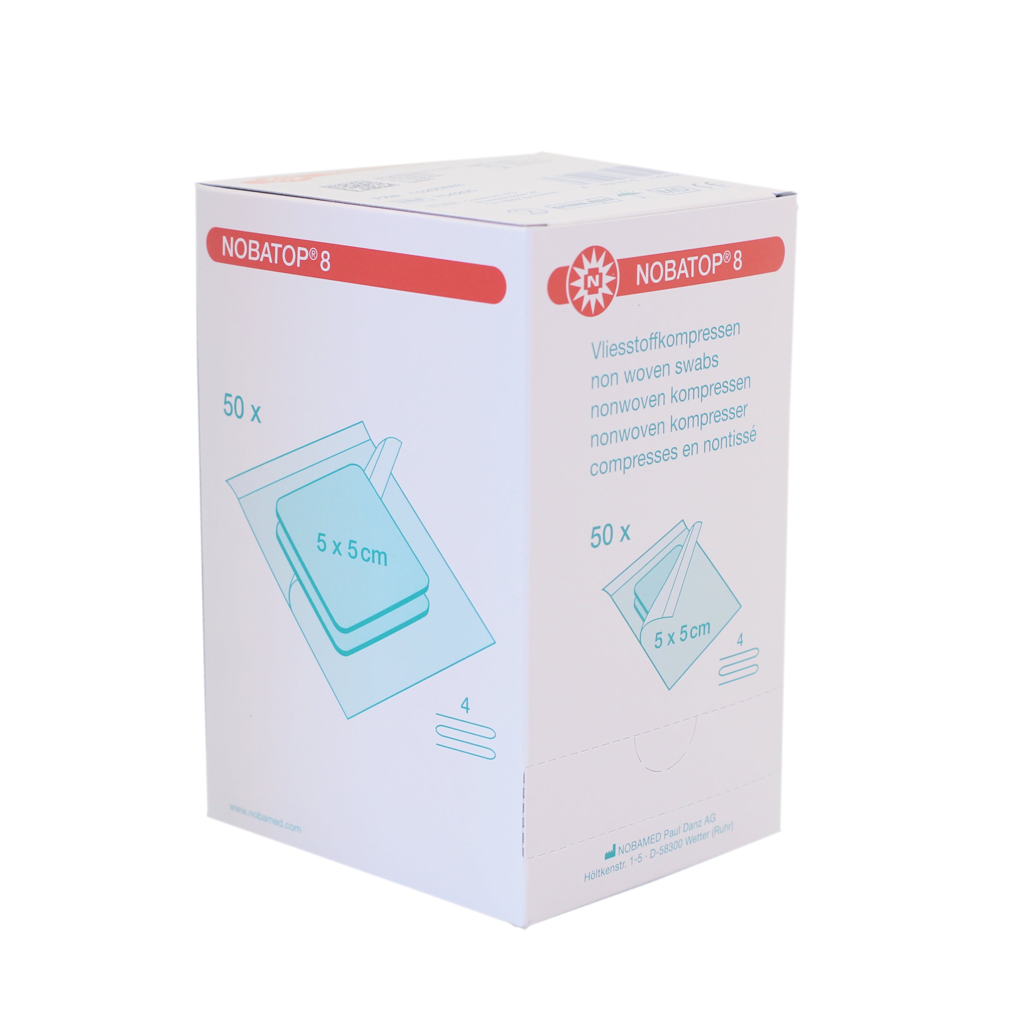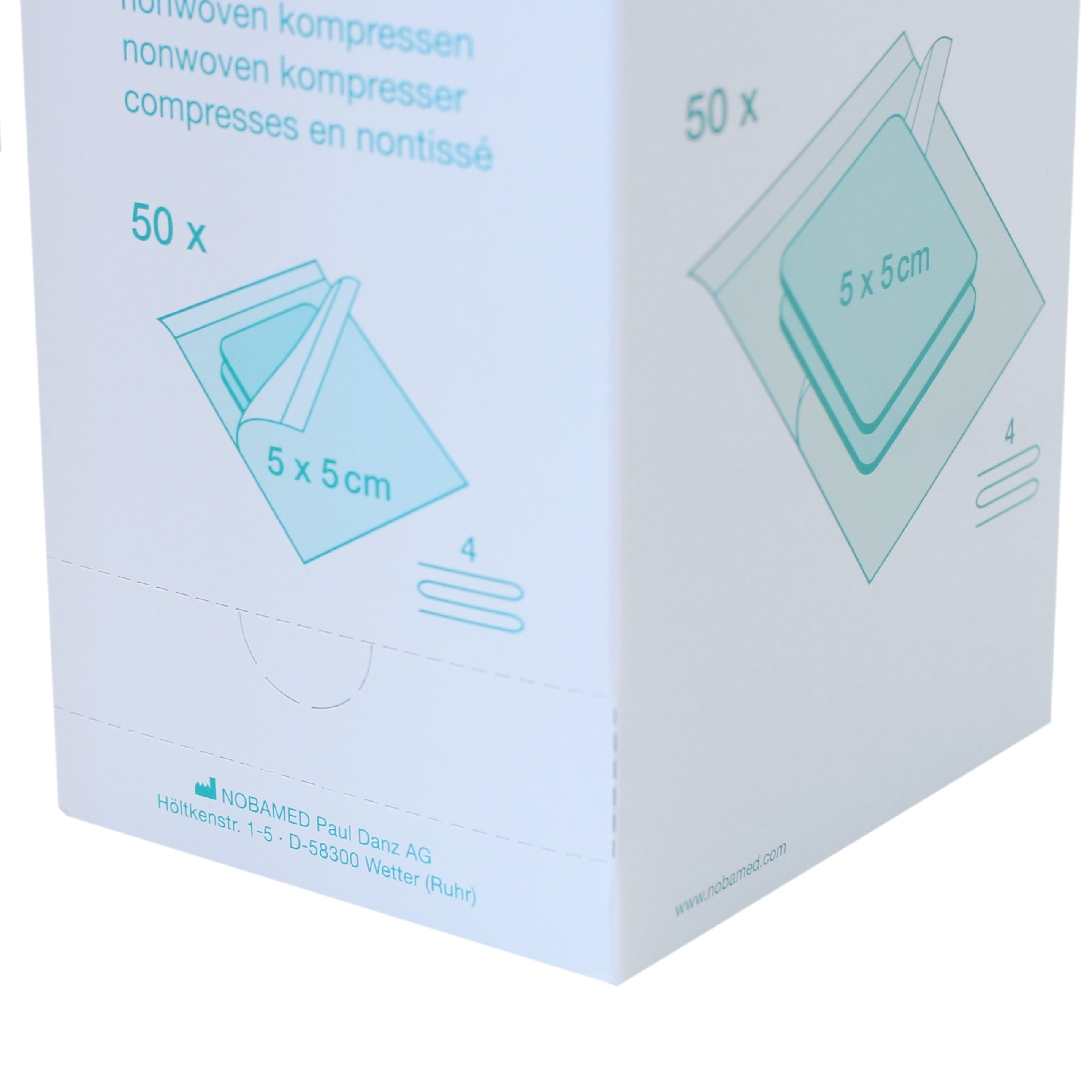 Sterile compresses, 5 x 5 cm. Packed per 2 pcs, box contents of 50 packages total.