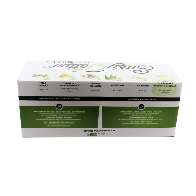 10 pieces of the ideal aftercare for your tattoo and 100% vegan! Including Dispenser. The Vegan Tattoo Wax by Easytattoo is the perfect after care cream for your tattoos. Apply the balm 2 to 3 times a day on your freshly tattooed skin and your skin will feel soft, supple and nourished. Ingredients such as shea butter, argan oil and calendula soothe itchiness and redness and promote healing. The Vegan Tattoo Wax does not contain parabens and is packed in an easy to use jar with spatula.