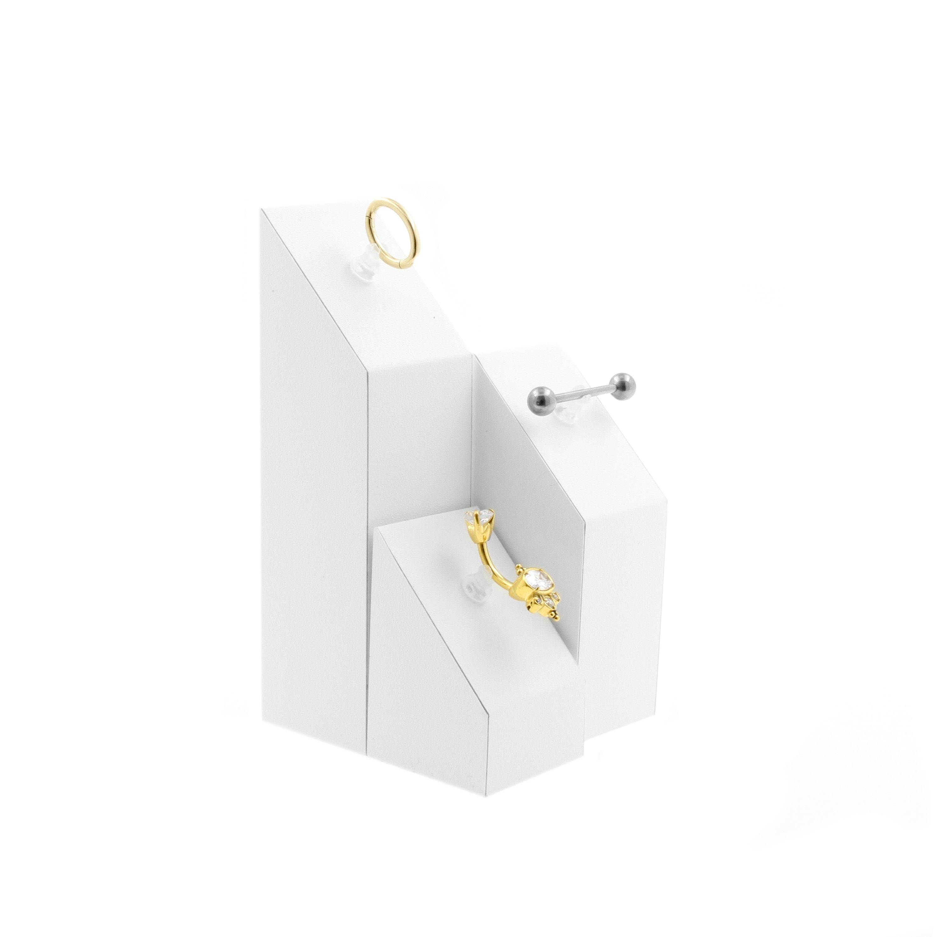 Beautiful plastwood display, for presenting your jewelry collection to your customers. These lovely displays will look great on any counter or display cabinet. Set of 3 pieces. Sizes: 26 mm x 26 mm x 38 mm, 26 mm x 26 mm x 63 mm & 26 mm x 26 mm x 88 mm. Suitable for threadless piercing jewelry.