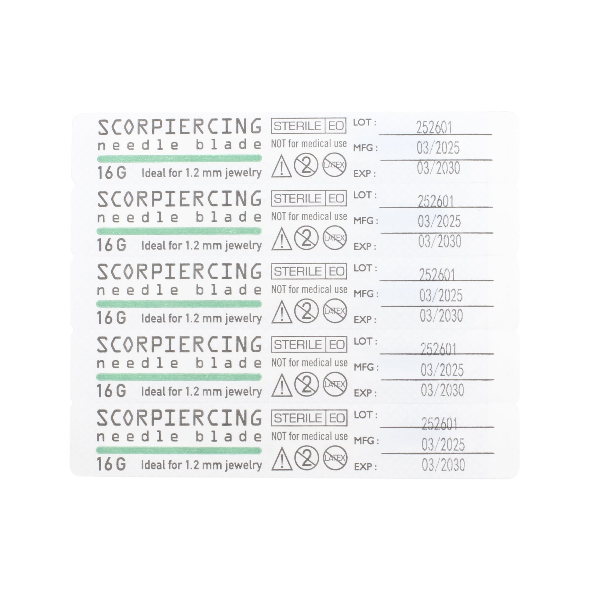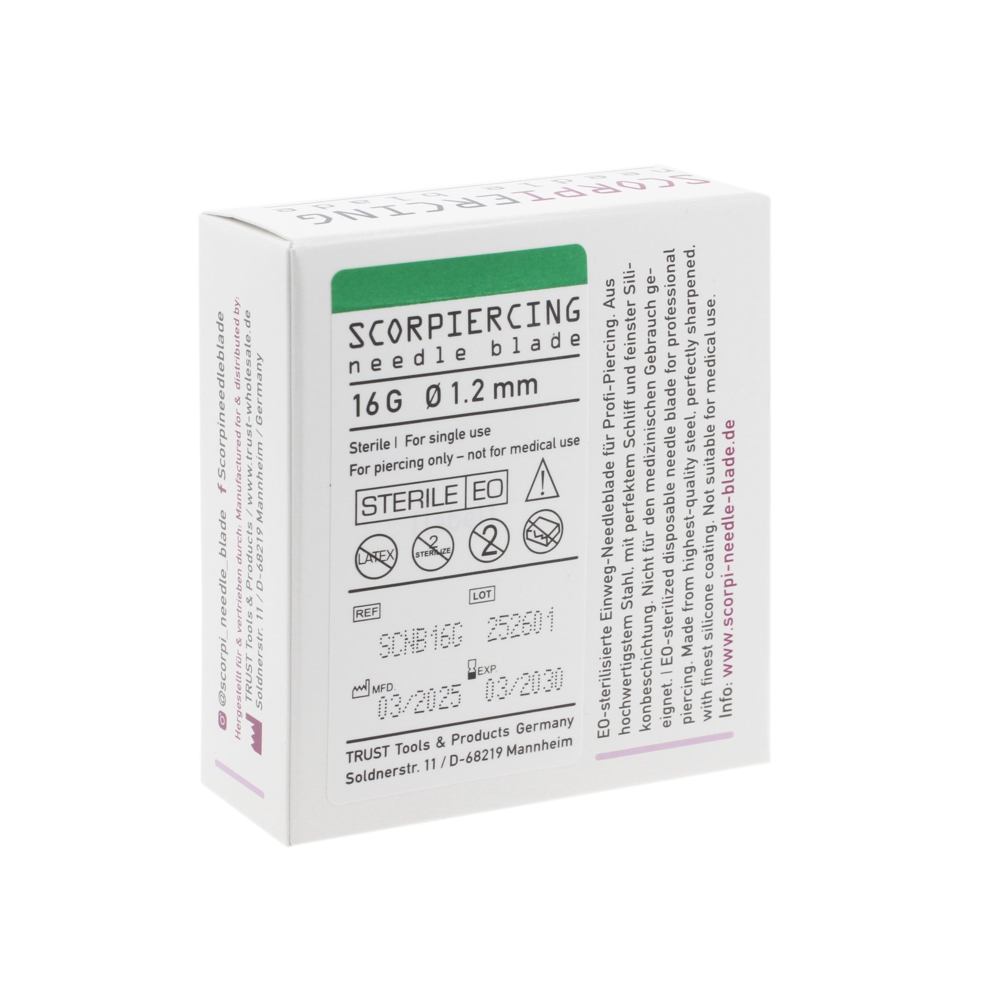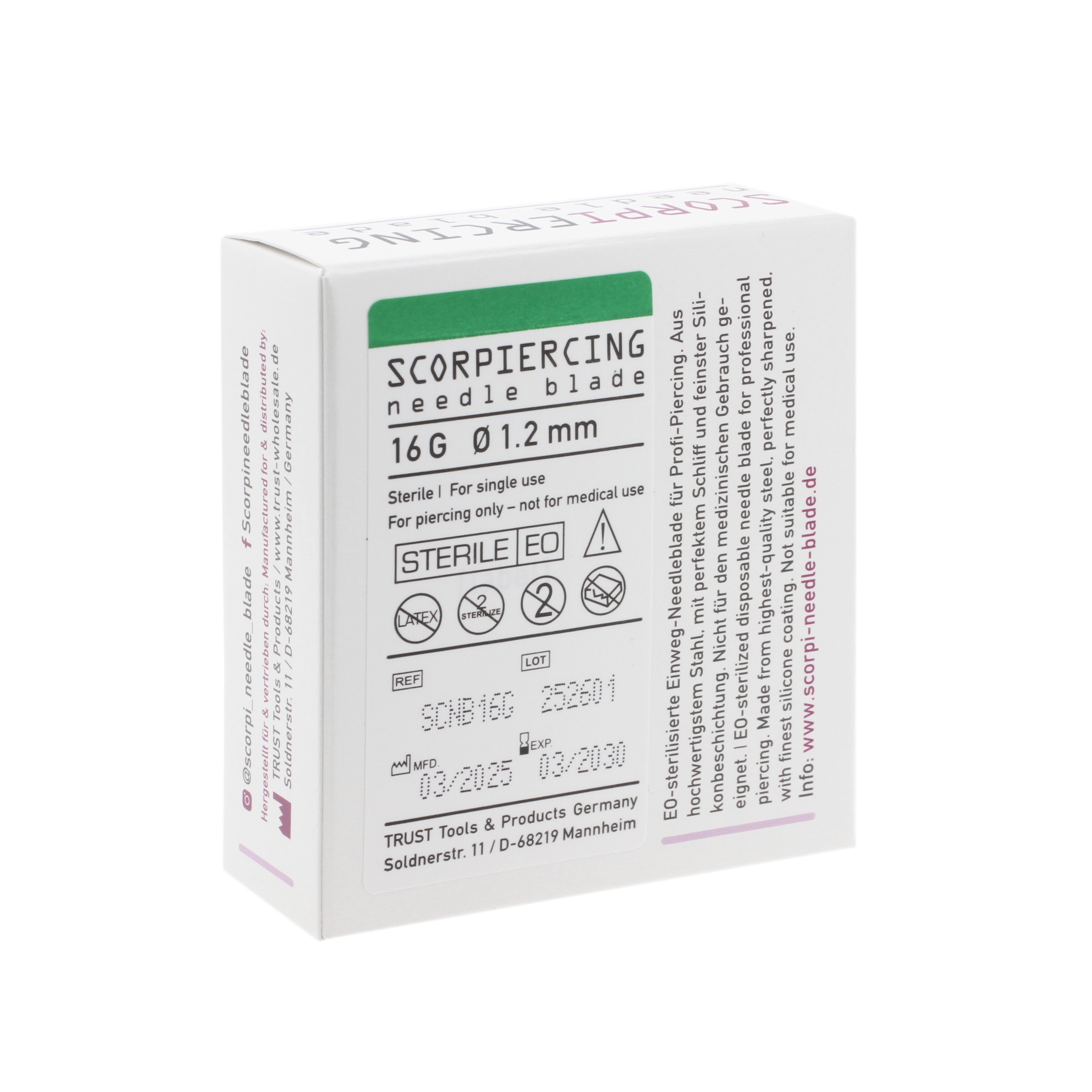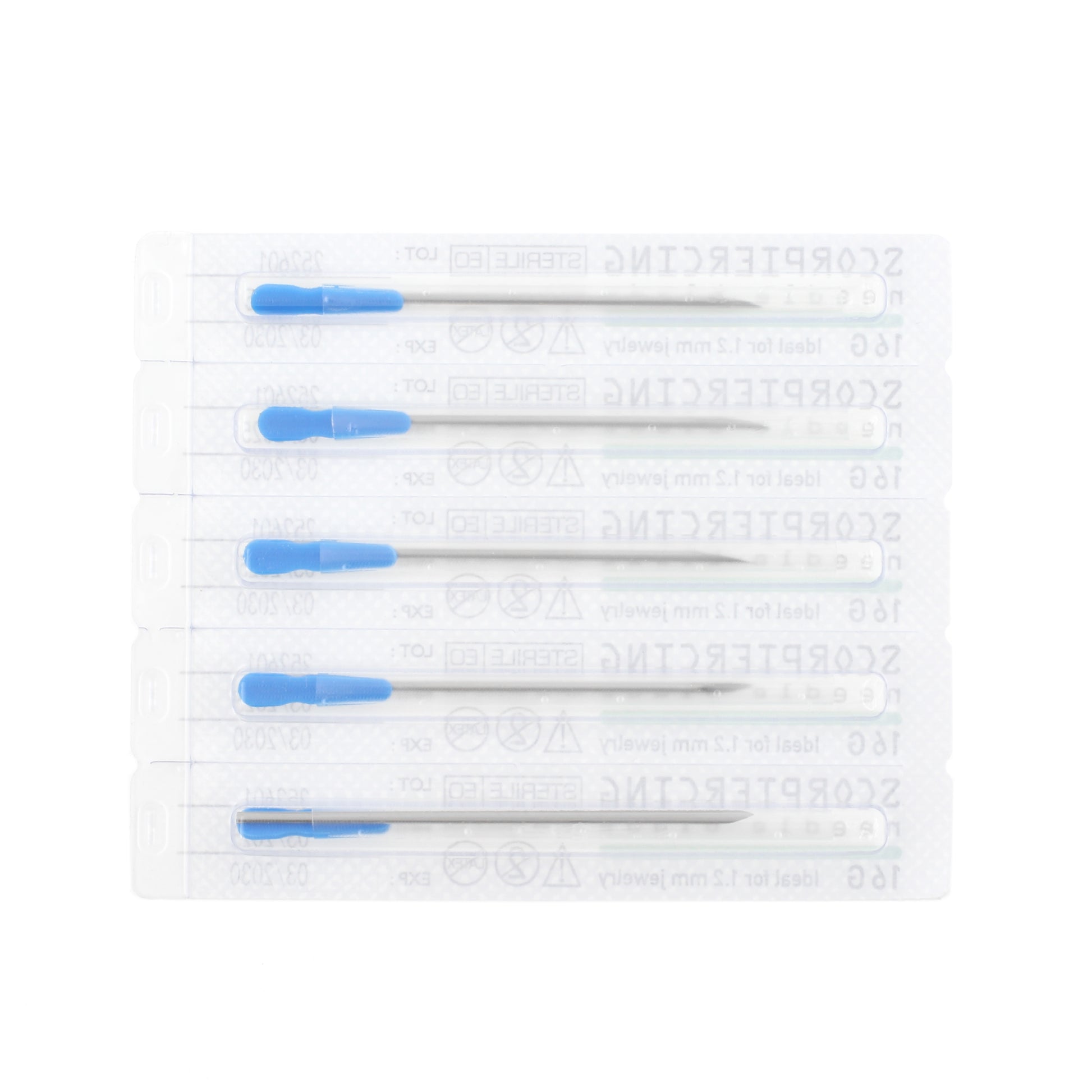 Super sharp needle blades from ScorPiercing (from Trust Germany). Each needle is in a sterile packaging protected by an extre tube. Simple pull the blue grip to release the protection and start piercing like you are used to.
