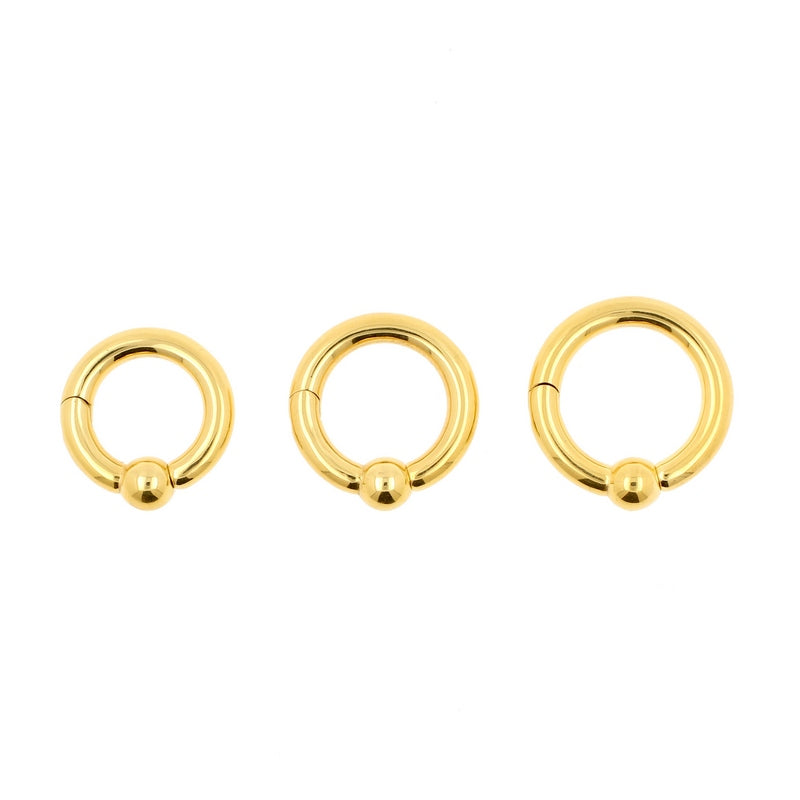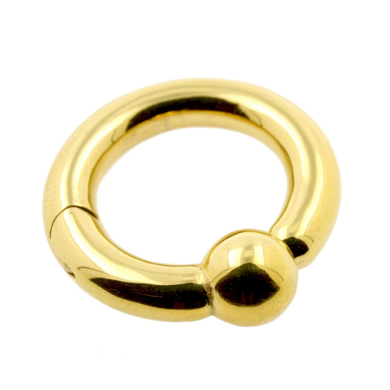 Easy to use click ring for your piercings! This click ring is made of surgical steel with gold P.V.D. coating and set with a fixed bead at the bottom of the ring, giving the ring the appearance of a ball closure ring but without the opening and closing hassle! Our click rings are perfect for all kinds of piercings and very easy to use. The segment of this click ring is hinged and can easily be opened and closed. Simply open the ring, insert it into your piercing and click it shut. Done!