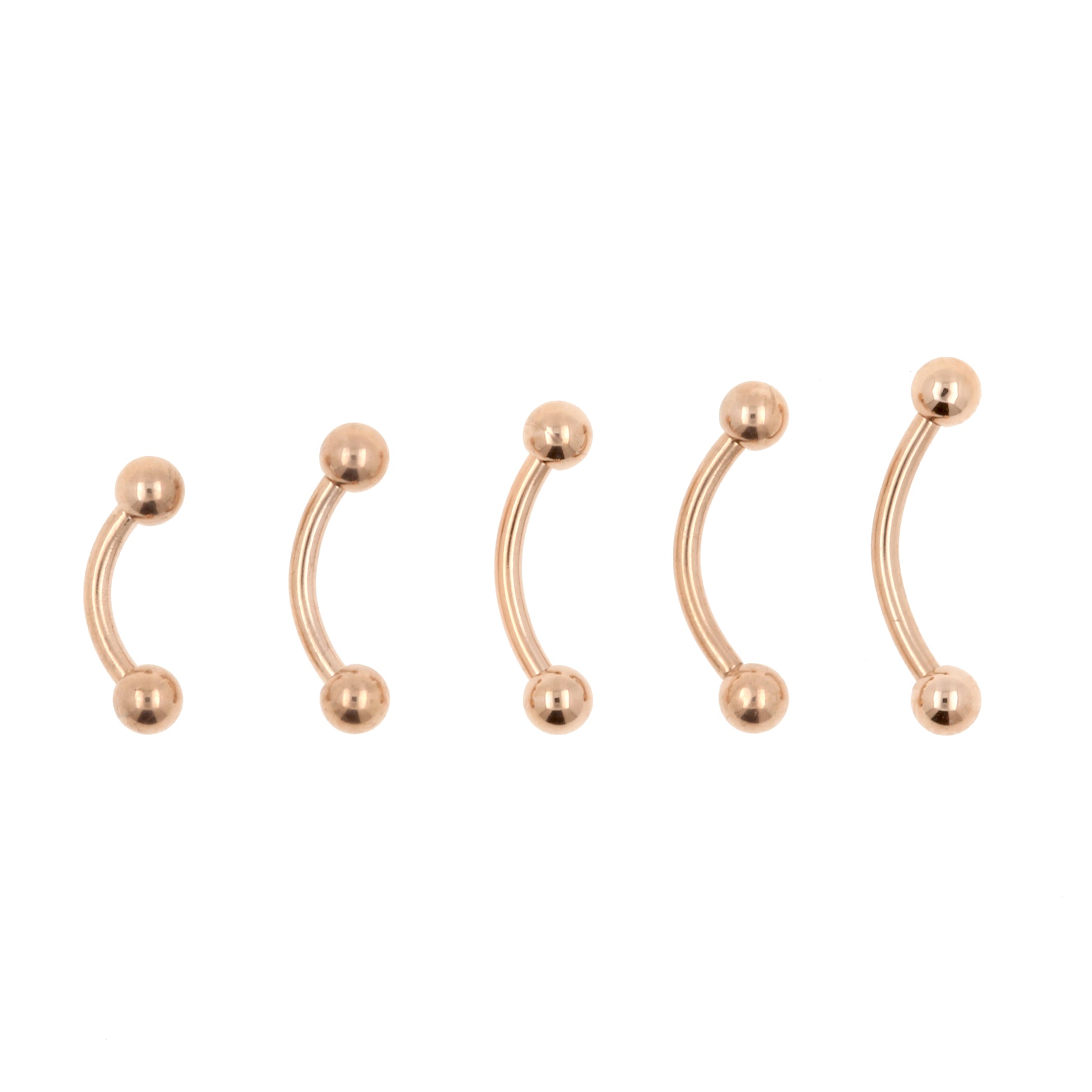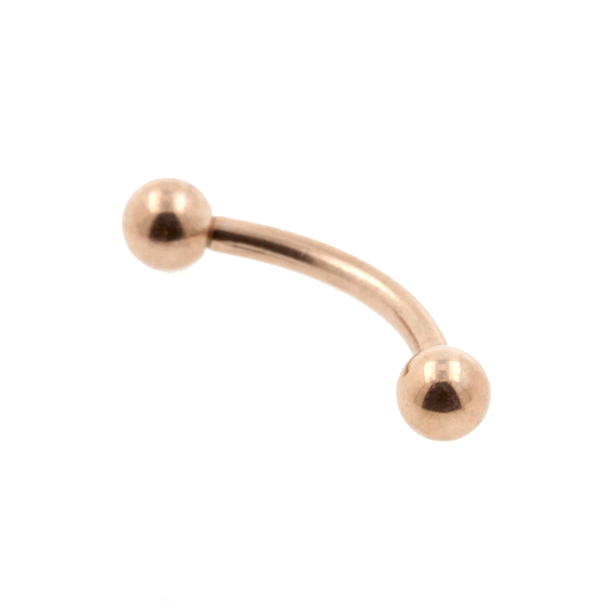 The essential basics, with a touch of rose gold! These curved barbells measure 1,2 mm in thickness and are made of surgical 316L steel, with a rose gold P.V.D coating. The new coating techniques that are used to create this piece of jewelry ensure top notch quality and a wear-resistant, high sheen finish. Great to keep at hand whenever you need a replacement, or simply want to switch to another size. Our curved barbells are a perfect match with the rest of our rose gold P.V.D. coated piercing jewelry range.