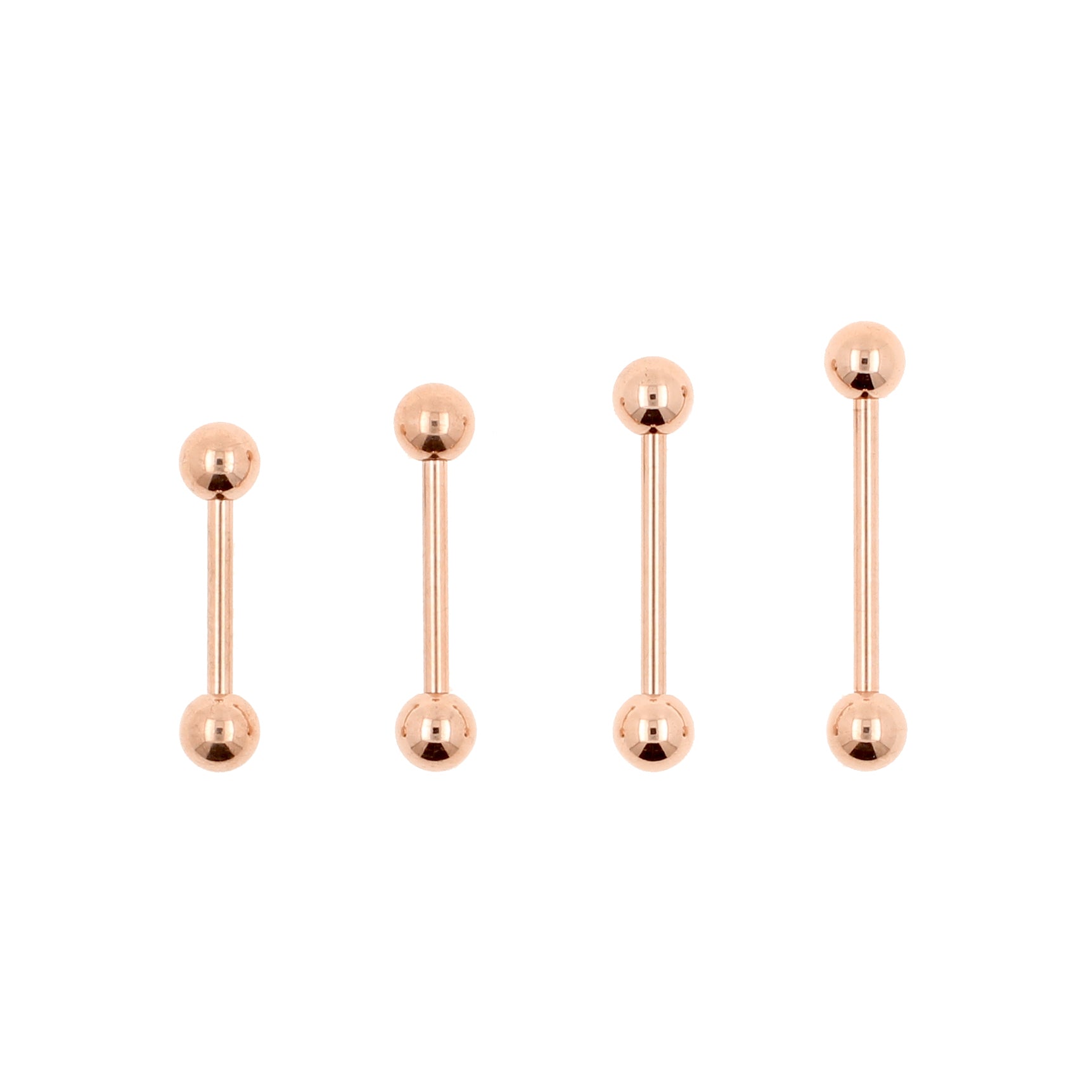 The essential basics, with a touch of rose gold! These barbells measure 1,6 mm in thickness and are made of surgical 316L steel, with a rose gold P.V.D coating. The new coating techniques that are used to create this piece of jewelry ensure top notch quality and a wear-resistant, high sheen finish. Great to keep at hand whenever you need a replacement, or simply want to switch to another size. Our barbells are a perfect match with the rest of our rose gold P.V.D. coated piercing jewelry range.