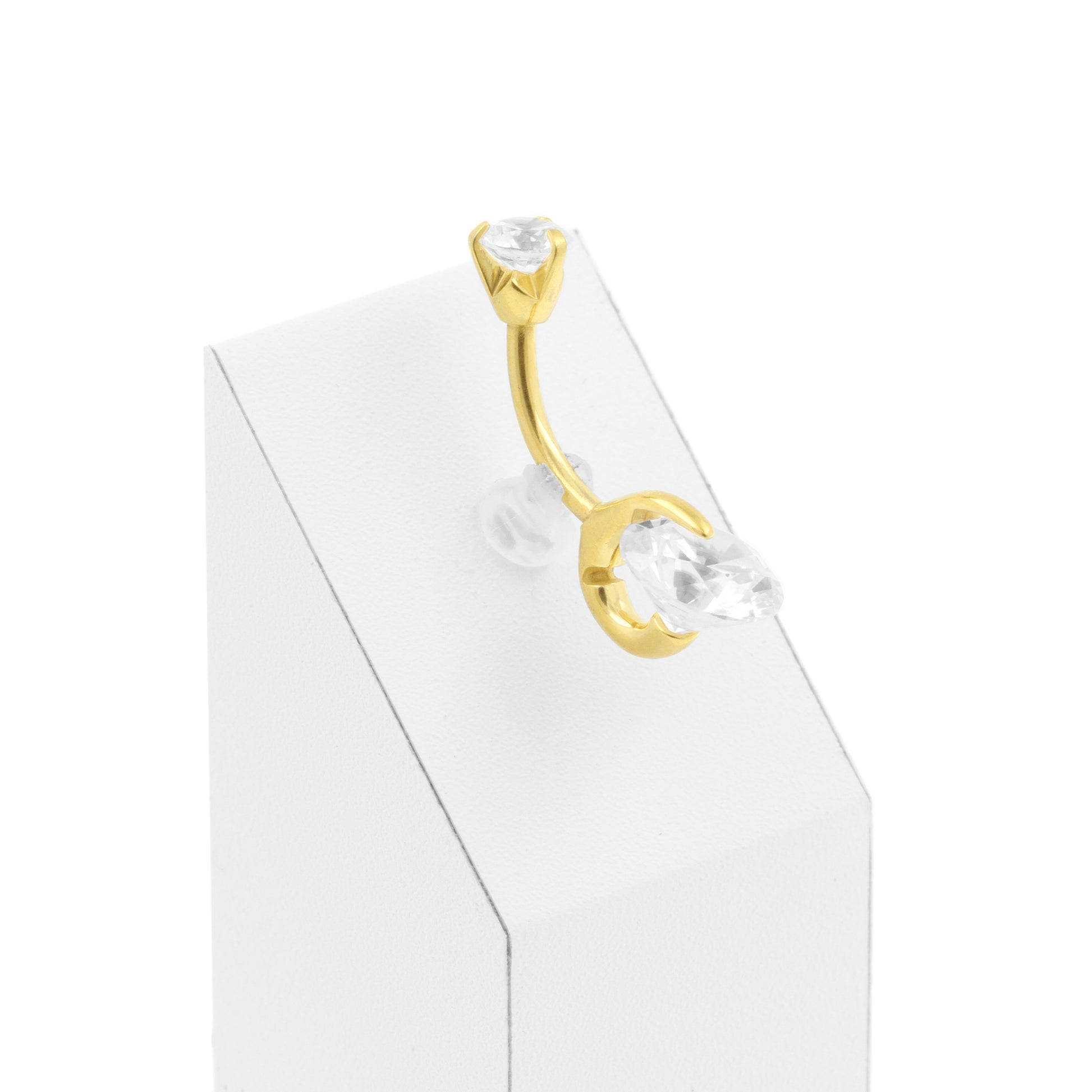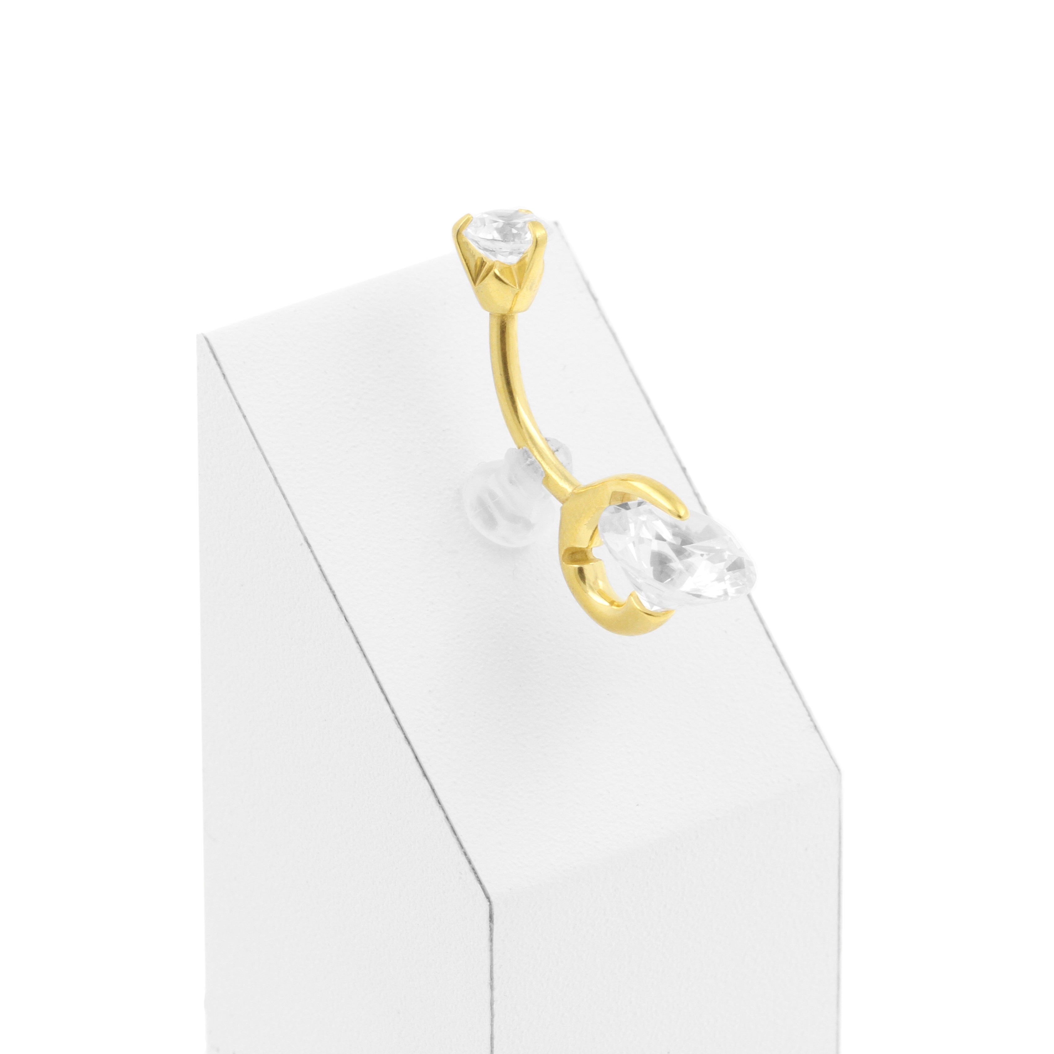 Elegant and refined — this belly bar features a clear cubic zirconia in a floating style for maximum visibility and sparkle. The 24 karat P.V.D. gold coating on surgical steel adds a warm, luxurious finish that lasts. The coating is water-resistant and color-stable, ideal for everyday wear.
