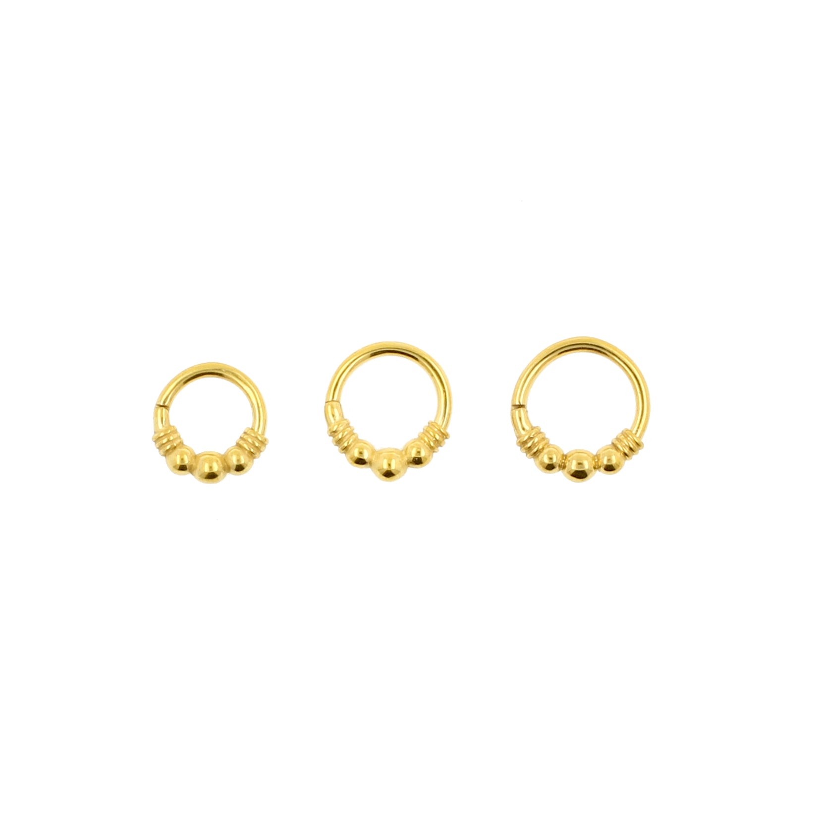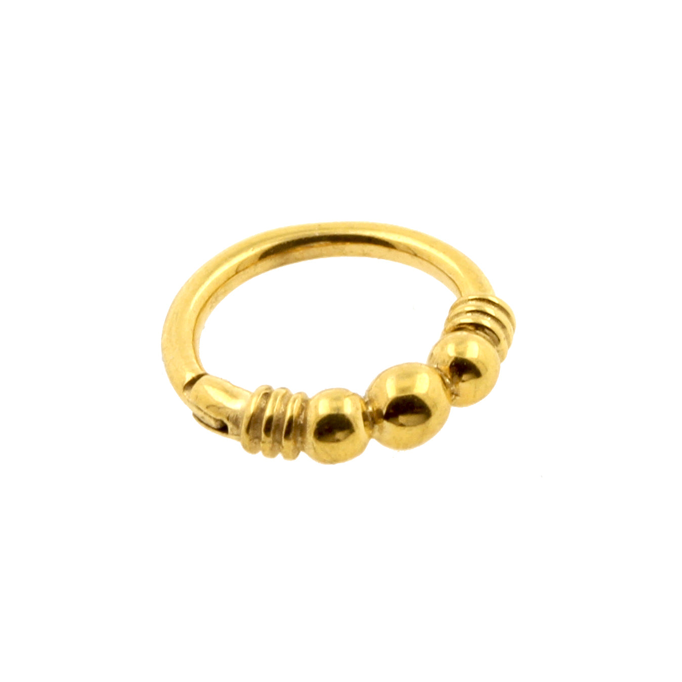 The perfect click rings for your cartilage piercings! This click ring is made of gold colored surgical steel and set with a cool pattern at the bottom that adds an nice touch to your piercings. Our click rings are perfect for helix piercings, septum piercings and all kinds of other piercings and very easy to use. The segment of this click ring is hinged and can easily be opened and closed. Simply open the ring, insert it into your piercing and click it shut. Done!