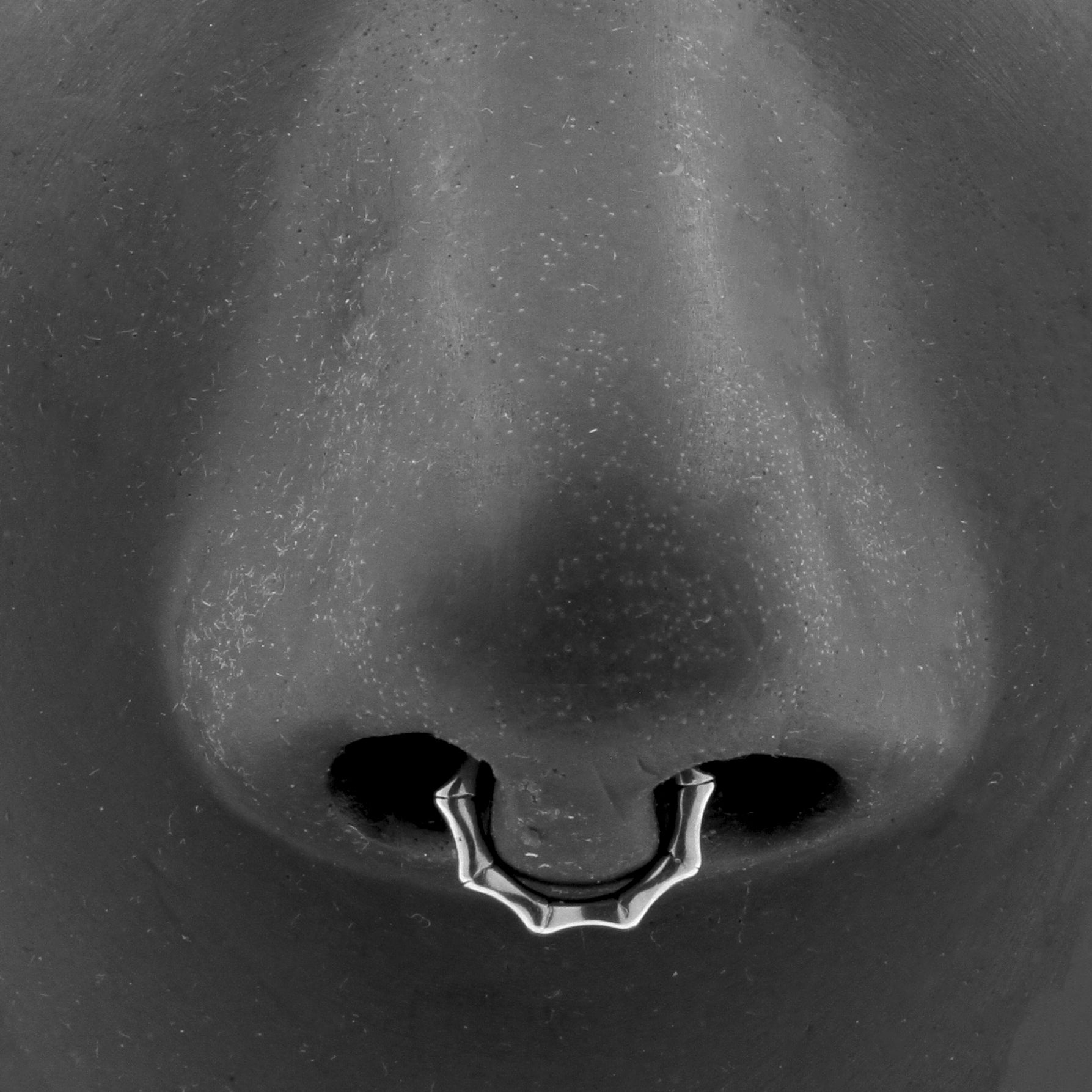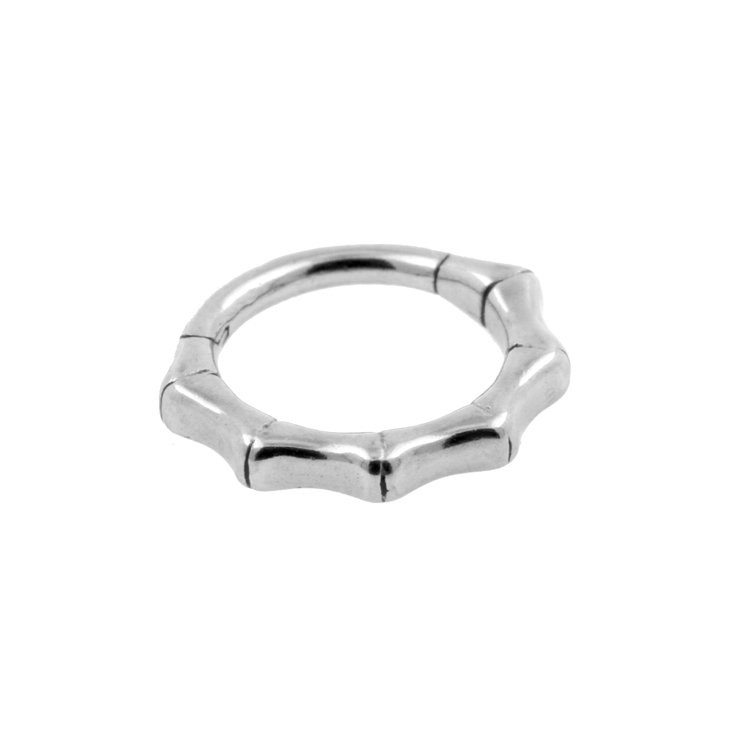 High quality piercing ring with easy to use clicking mechanism! This beautiful ring is features beautiful, bamboo style decoration and has a curved stem. The rings suitable for all kinds of piercings, giving them an extra fancy look in an instant. Made of high quality surgical steel with a mirror finish and available in different colors and designs.