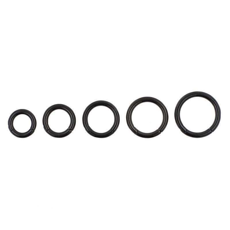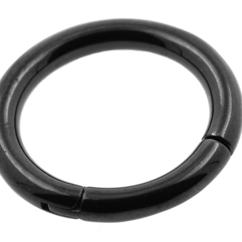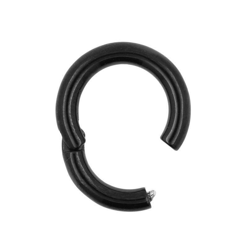 Pretty basics! The perfect piercing ring if you like the look of a smooth segment ring, but need something that's easy to use as well. The segment of this click ring is hinged and can easily be opened and closed. The closing mechanism is very easy to use and allows a smooth insertion into your piercings. Made of black P.V.D. coated surgical steel and available in different colors and sizes!