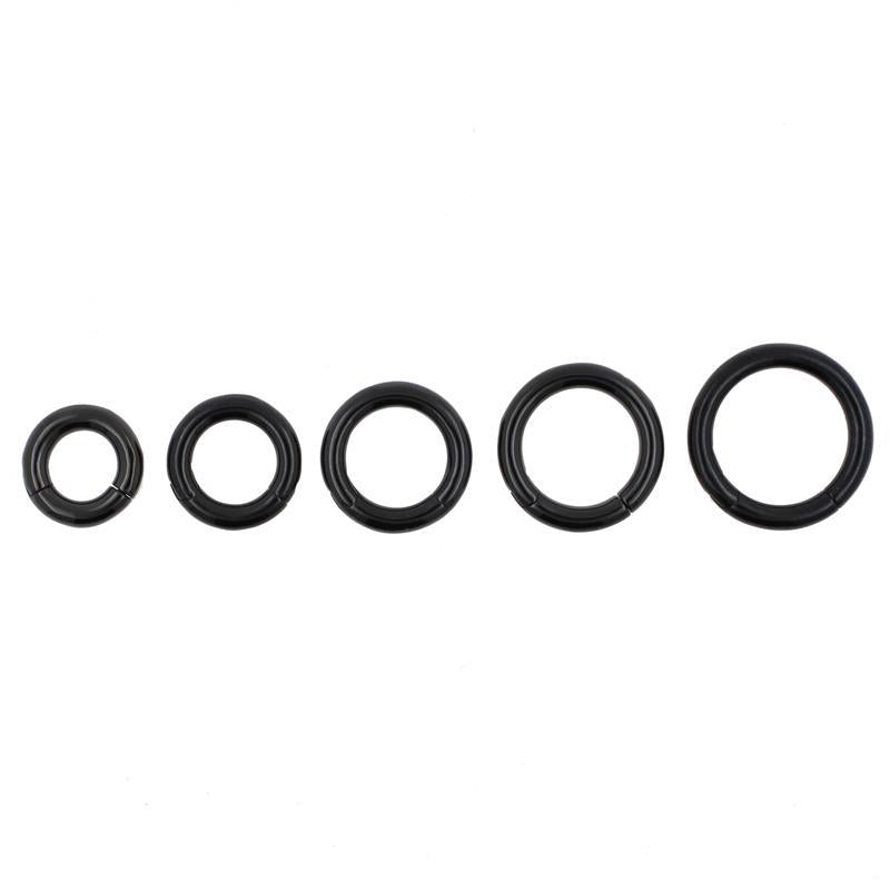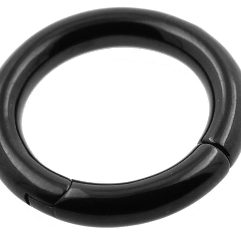 Pretty basics! The perfect piercing ring if you like the look of a smooth segment ring, but need something that's easy to use as well. The segment of this click ring is hinged and can easily be opened and closed. The closing mechanism is very easy to use and allows a smooth insertion into your piercings. Made of black P.V.D. coated surgical steel and available in different colors and sizes!
