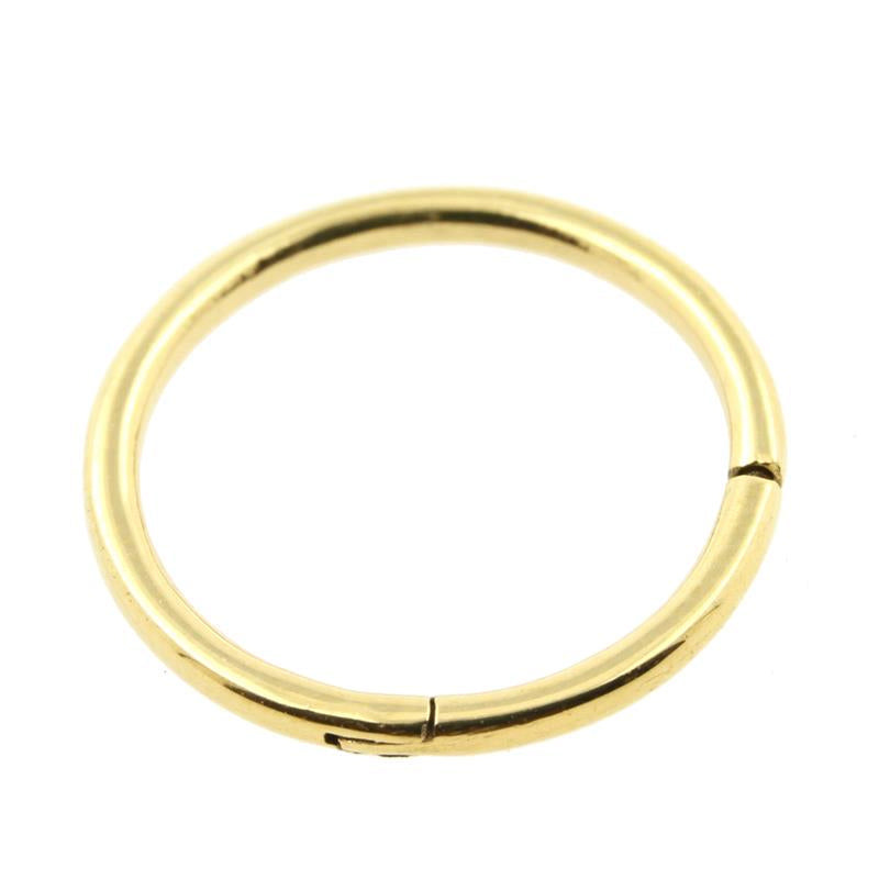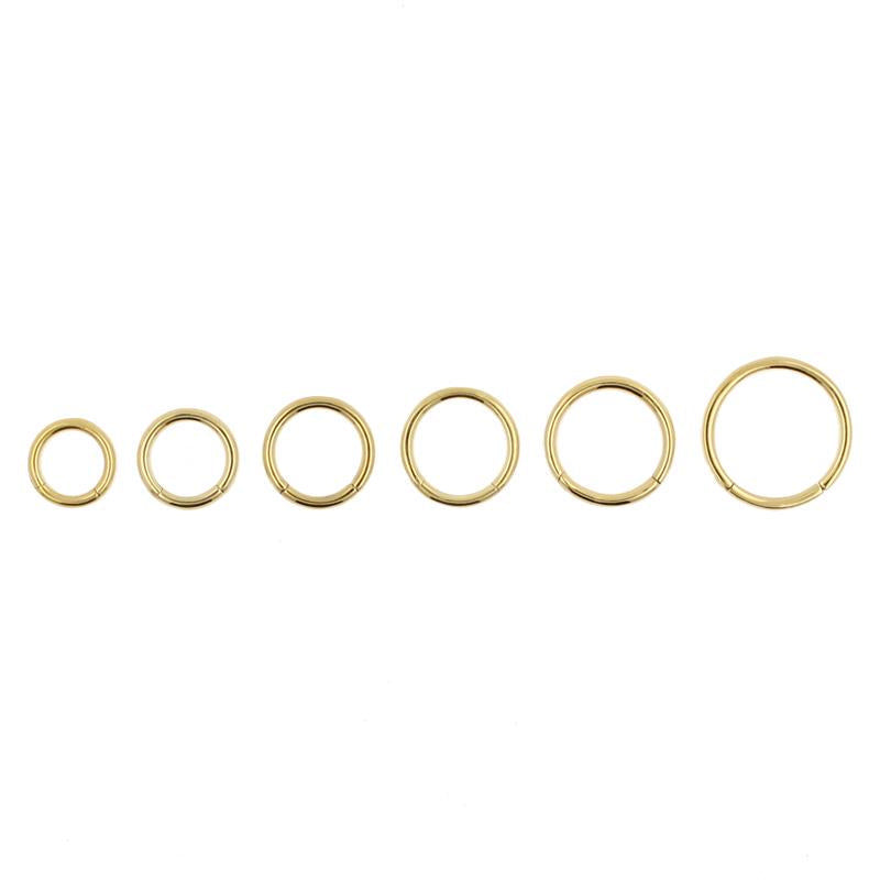 Pretty basics! The perfect piercing ring if you like the look of a smooth segment ring, but need something that's easy to use as well. The segment of this click ring is hinged and can easily be opened and closed. The closing mechanism is very easy to use and allows a smooth insertion into your piercings. Made of gold P.V.D. coated surgical steel and available in different colors and sizes!