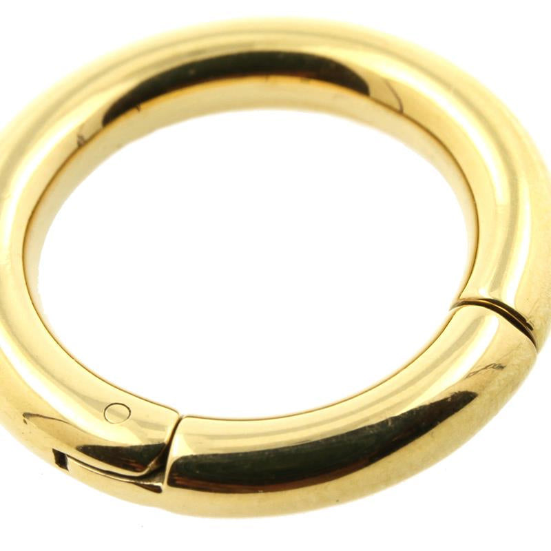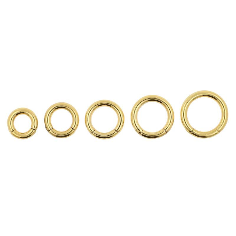 Pretty basics! The perfect piercing ring if you like the look of a smooth segment ring, but need something that's easy to use as well. The segment of this click ring is hinged and can easily be opened and closed. The closing mechanism is very easy to use and allows a smooth insertion into your piercings. Made of gold P.V.D. coated surgical steel and available in different colors and sizes!
