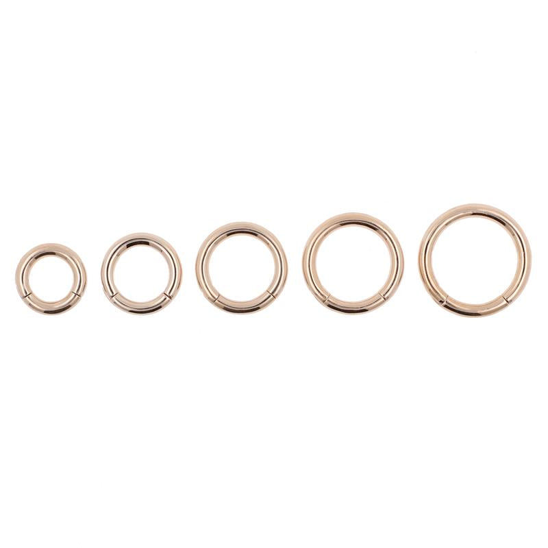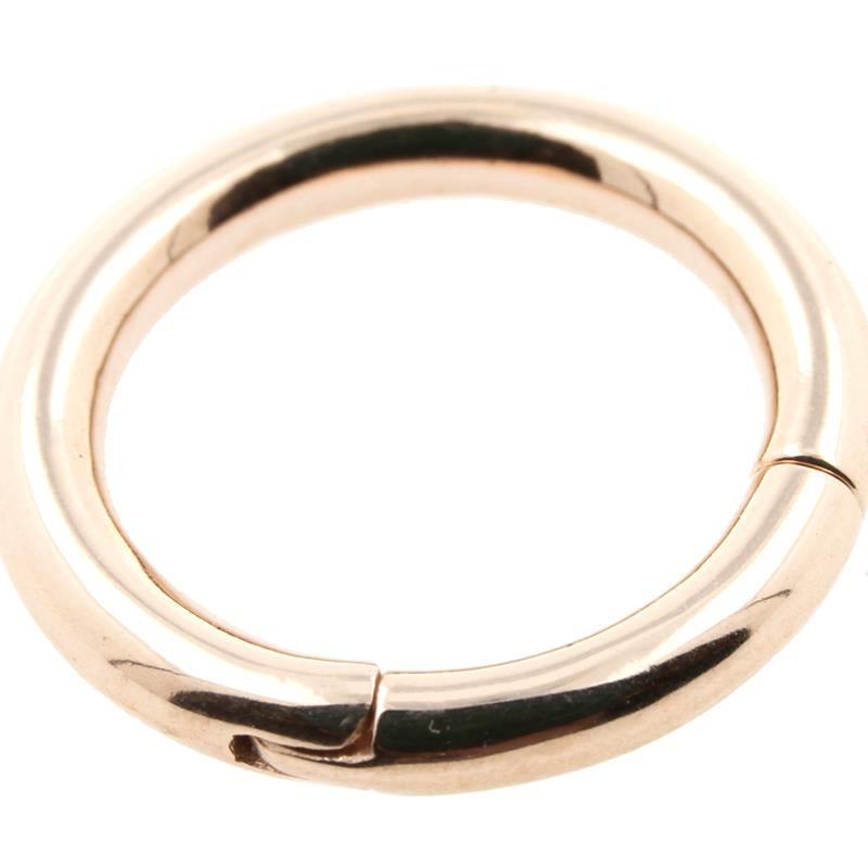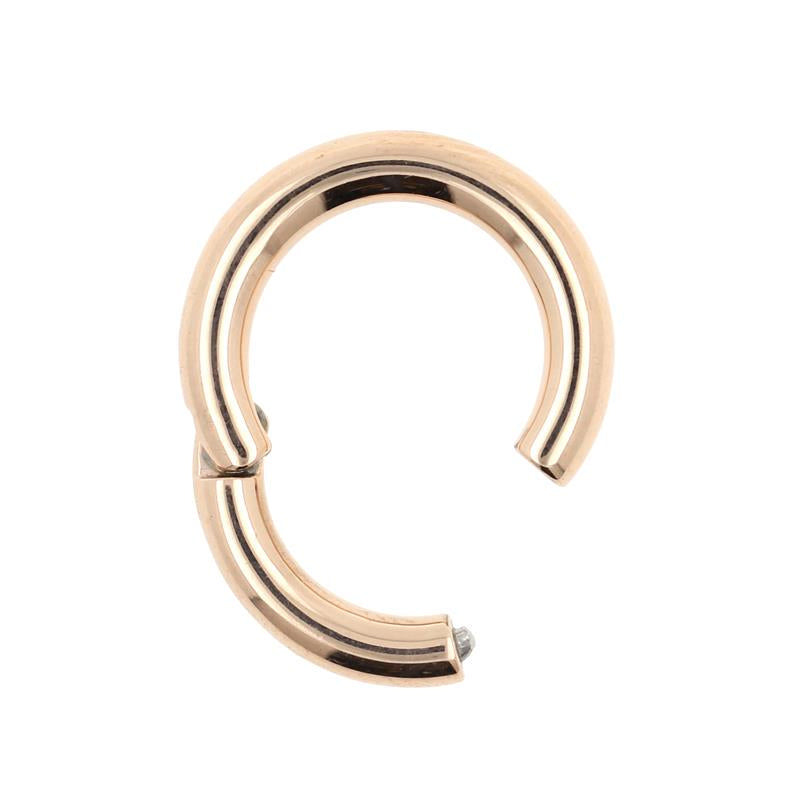 Pretty basics! The perfect piercing ring if you like the look of a smooth segment ring, but need something that's easy to use as well. The segment of this click ring is hinged and can easily be opened and closed. The closing mechanism is very easy to use and allows a smooth insertion into your piercings. Made of rose gold P.V.D. coated surgical steel and available in different colors and sizes!